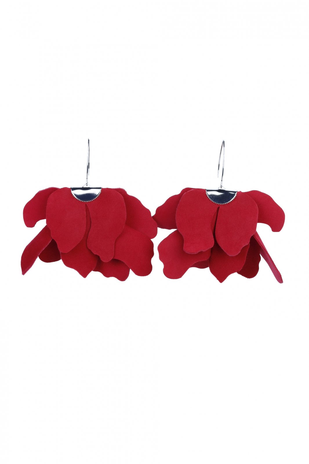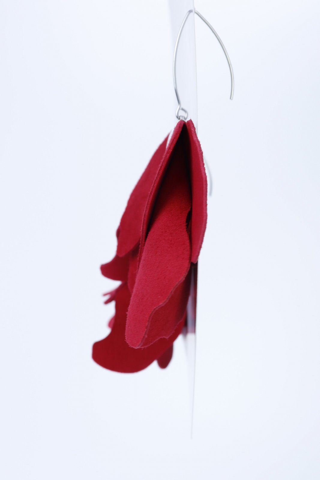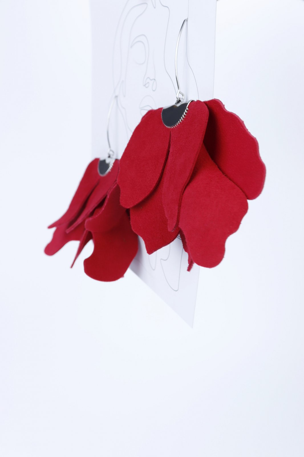 "Fă o declarație îndrăzneață și pasională cu acești cercei superbi în formă de floare roșie. Lucrați manual, cu migală, din piele italiană de înaltă calitate, fiecare petală este suprapusă pentru a crea un efect tridimensional captivant care adaugă profunzime și mișcare. Dimensiunea lor generoasă asigură un look sofisticat, atrăgător, în timp ce cârligele din oțel inoxidabil hipoalergenic oferă confort pentru purtare pe tot parcursul zilei. Perfecți pentru a adăuga o notă vibrantă de eleganță oricărei ținute.Caracteristici: