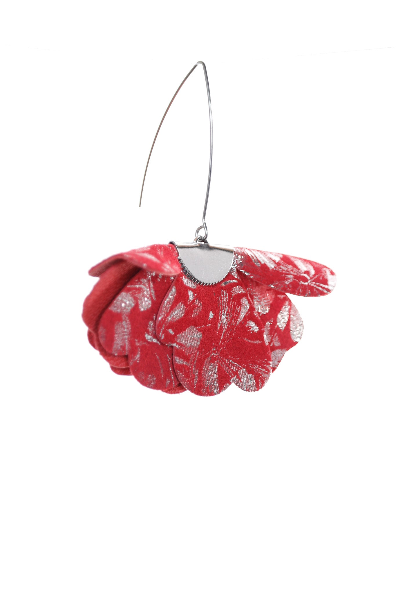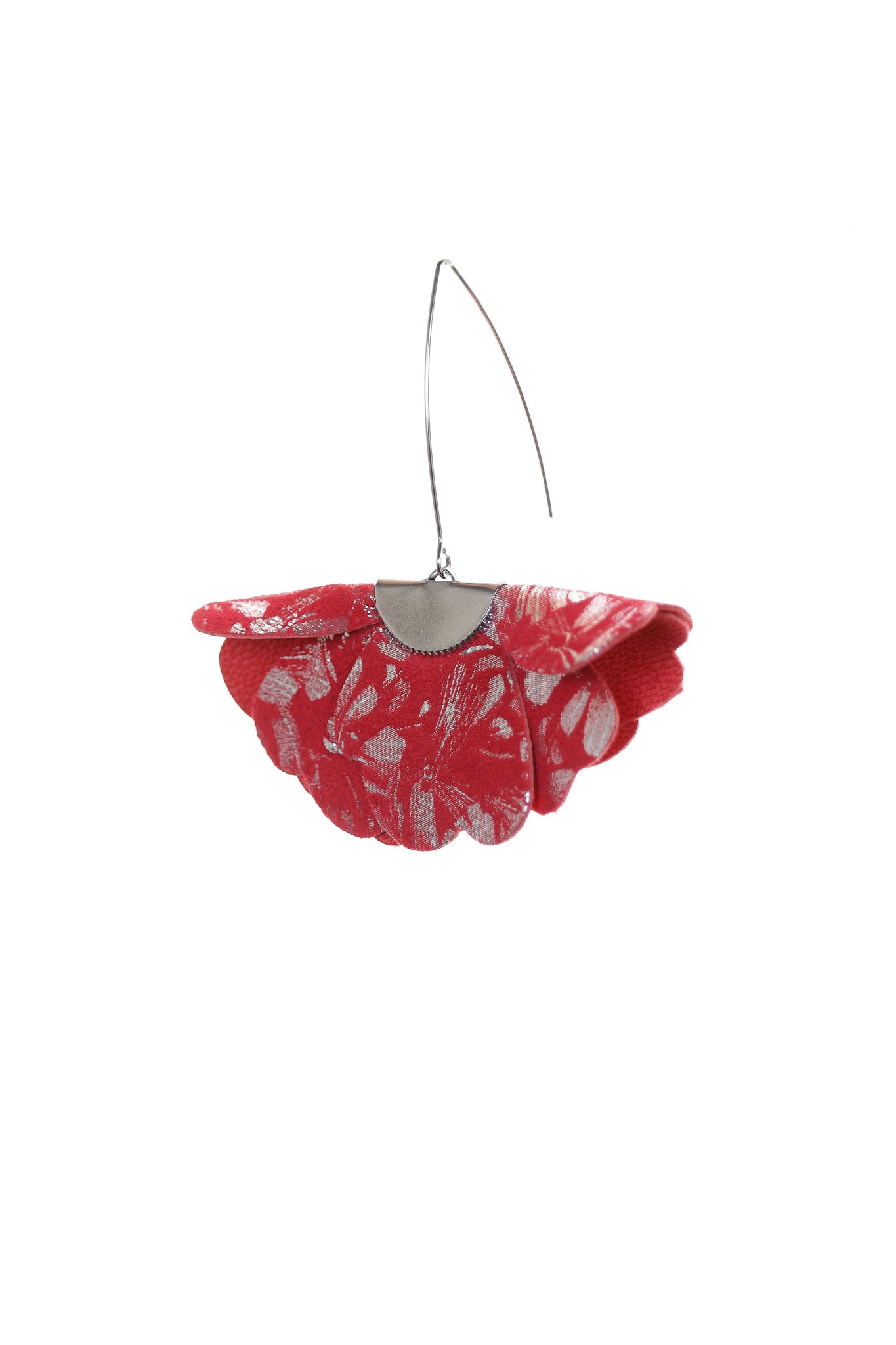 Cu o formă inspirată de natura elegantă, acești cercei sunt o piesă de artă în miniatură. Fiecare element din piele naturală de culoare Roșu este atent modelat și suprapus, creând un volum impresionant și o textură sofisticată. Pielea are un imprimeu argintiu metalic, care adaugă un efect glamour și festi. Nuanța vibrantă de roșu este perfectă pentru a completa ținutele, adăugând o notă de lux și îndrăzneală. Detaliile metalice de la baza cerceilor adaugă un finisaj elegant și modern. Sunt perfecți pentru a-ți evidenția stilul feminin și a adăuga o notă dramatică, fiind ideali atât pentru o ținută de zi, cât și pentru un eveniment special.