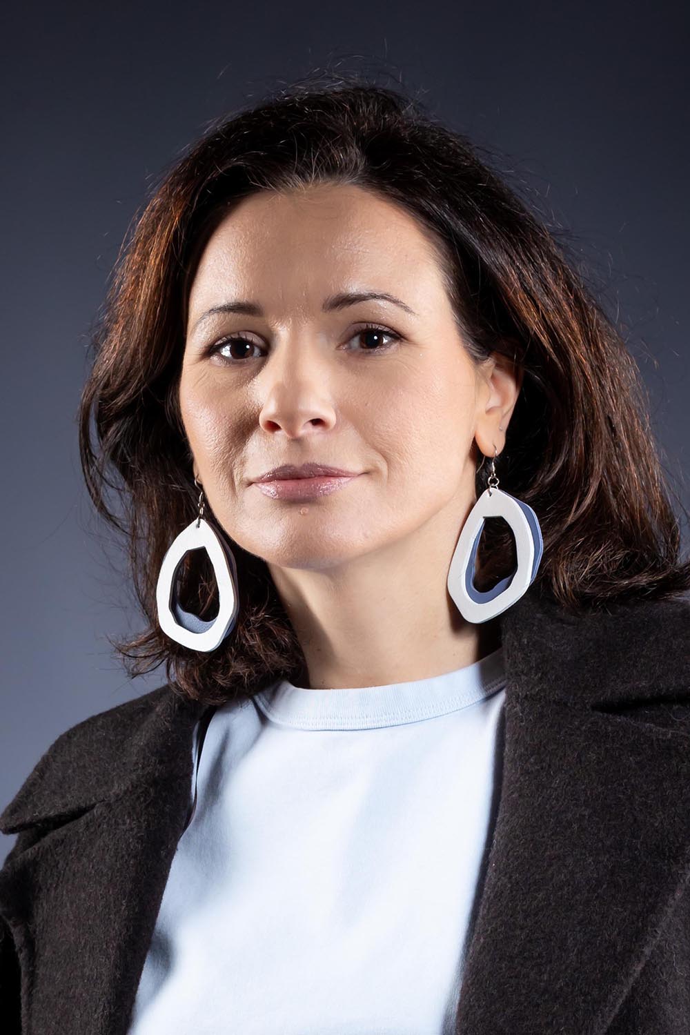 O pereche de cercei cu un design sculptural și minimalist, ce mizează pe eleganța atemporală a contrastului dintre alb pur și albastru cenușiu. Liniile organice și suprapunerea fluidă de nuanțe transformă pielea naturală într-o piesă de artă modernă, ideală pentru a aduce o notă de rafinament discret ținutelor tale.