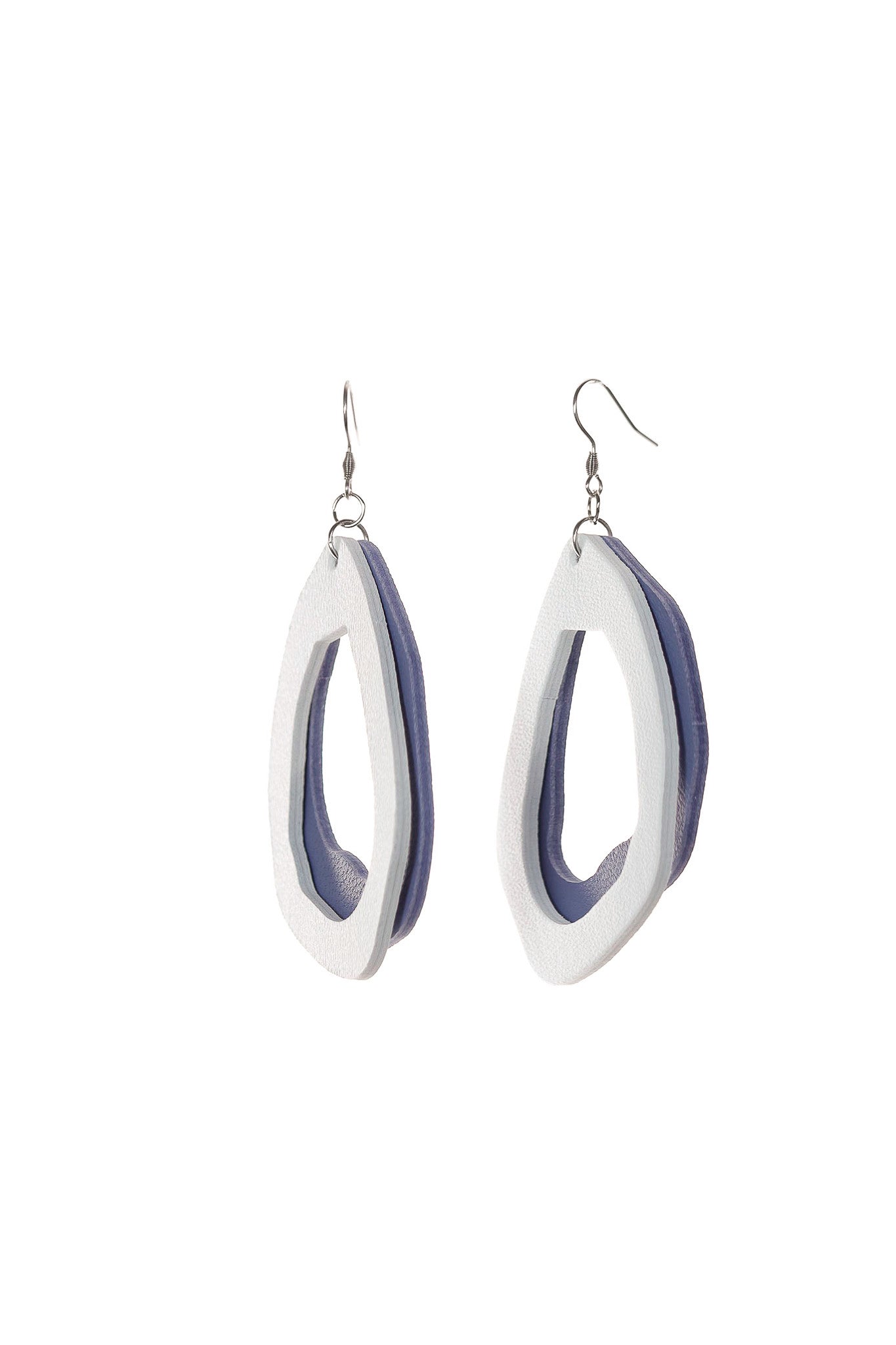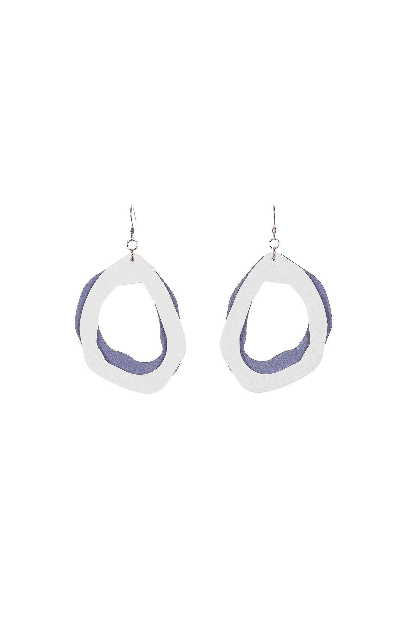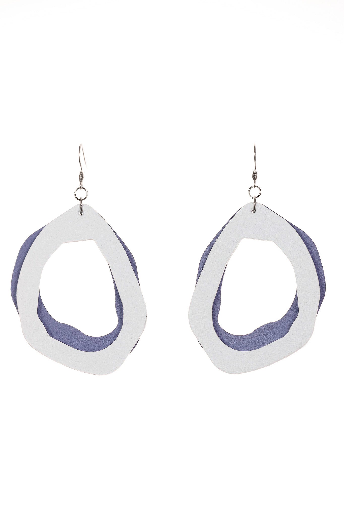 Această variantă a modelului fluid explorează contrastul dintre luminozitatea albului și profunzimea calmă a albastrului cenușiu. Realizați manual din piele naturală, acești cercei propun o estetică aerisită, unde stratul alb încadrează baza cenușie, creând un efect vizual curat și elegant. Deși dimensiunile lor sunt generoase, natura materialului îi face surprinzător de ușori, fiind aproape imperceptibili la purtare.