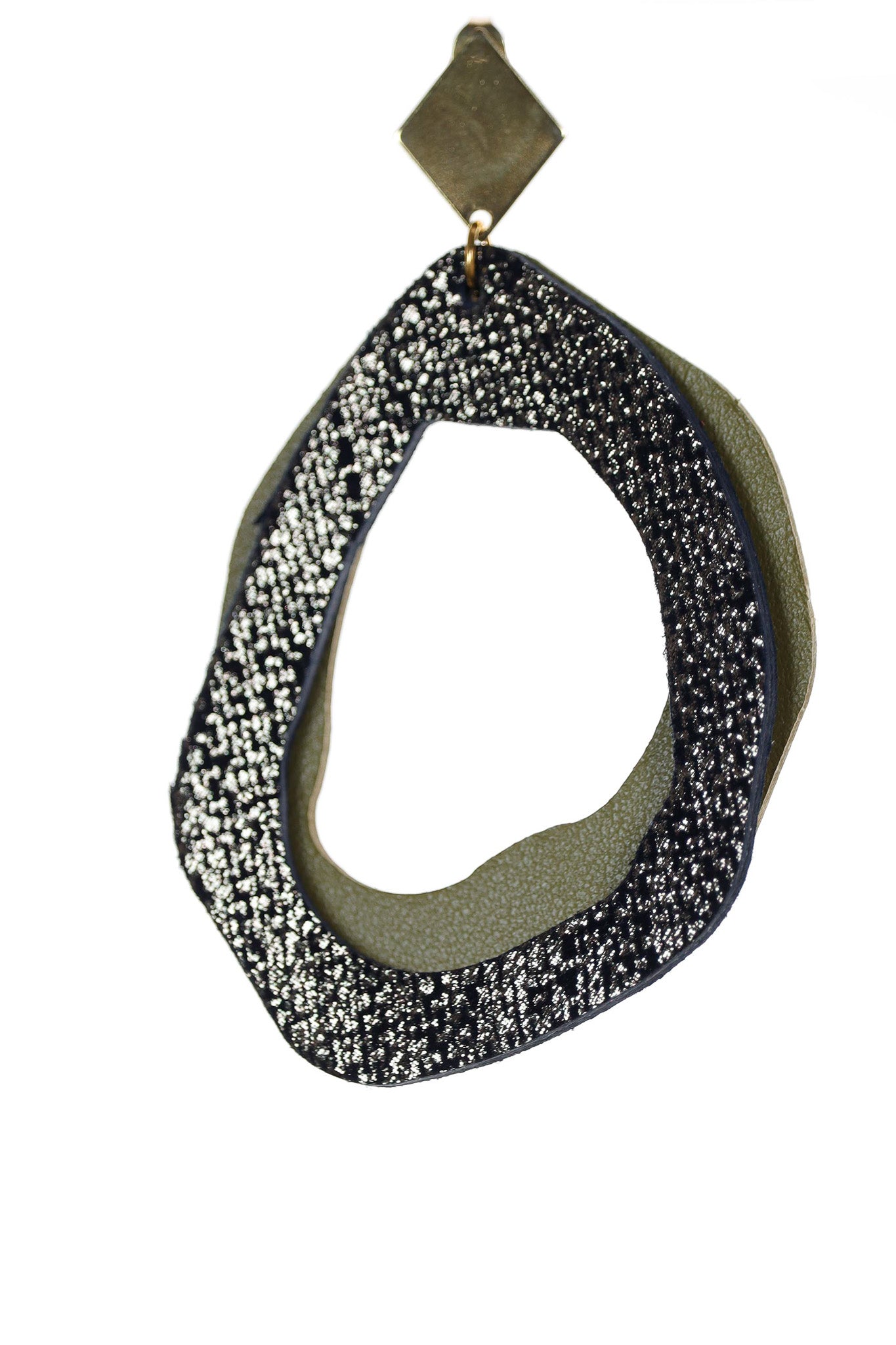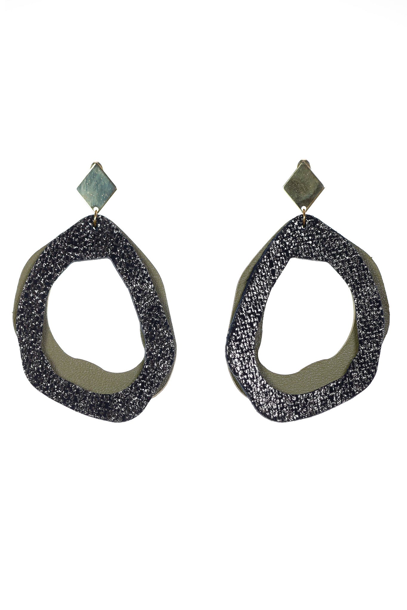 Această variantă a modelului fluid este o celebrare a texturilor contrastante. Realizați manual din piele naturală, cerceii atrag privirea prin stratul superior granulat care captează lumina în mii de puncte strălucitoare, fiind armonizat perfect de baza verde olive. Designul fluid elimină rigoarea formelor geometrice, oferind o piesă de autor care se simte la fel de bine precum arată.