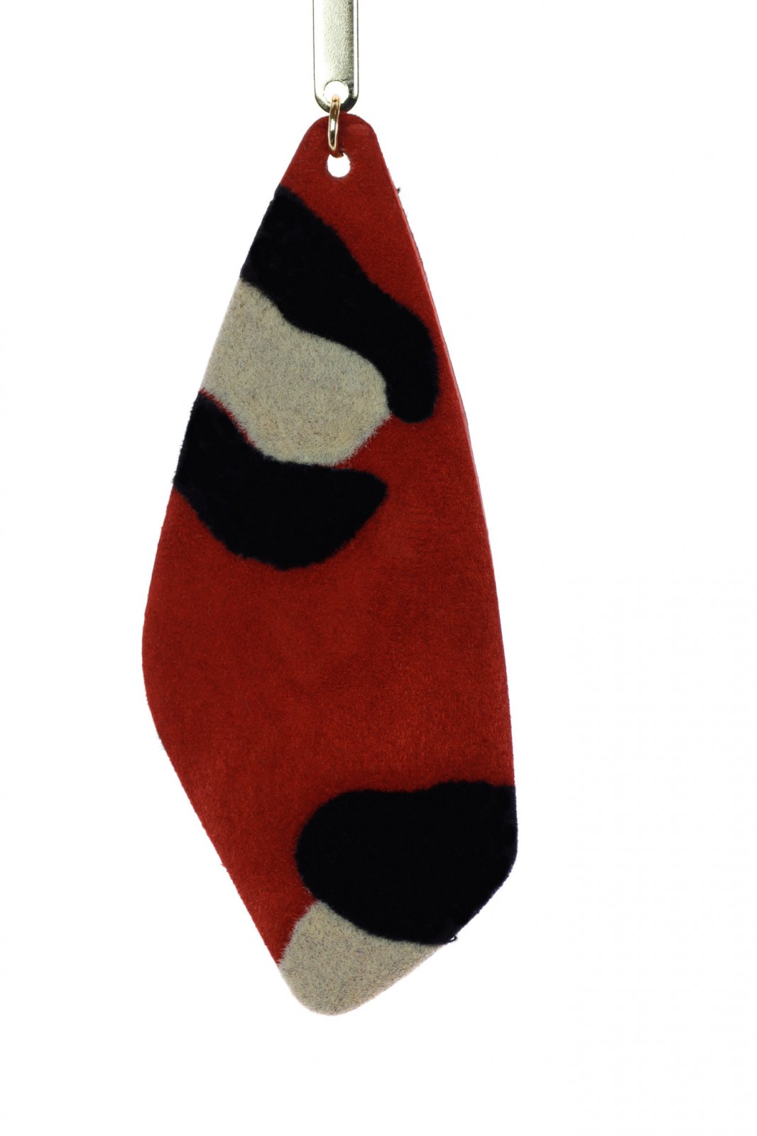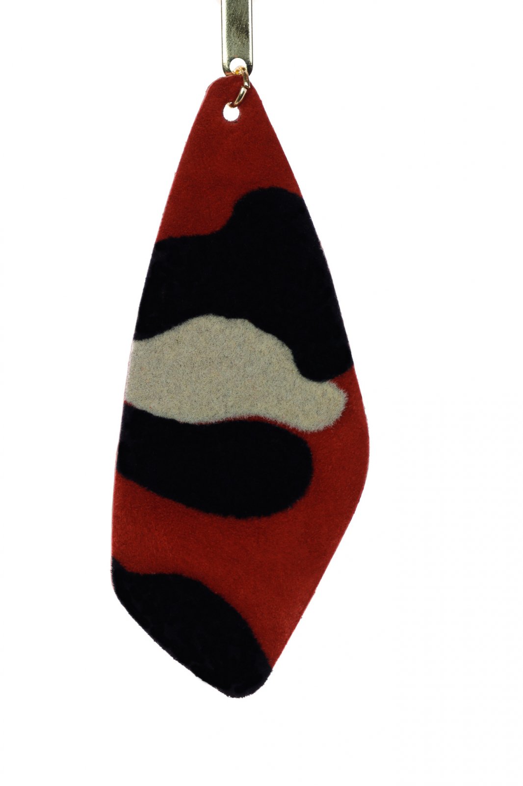 Îndrăzneț & Artistic. Acești cercei geometrici combină un print unic de roșu, bej și negru pe piele lucrată manual, cu textură catifelată. Un statement contemporan de 8 cm de originalitate și stil personal.