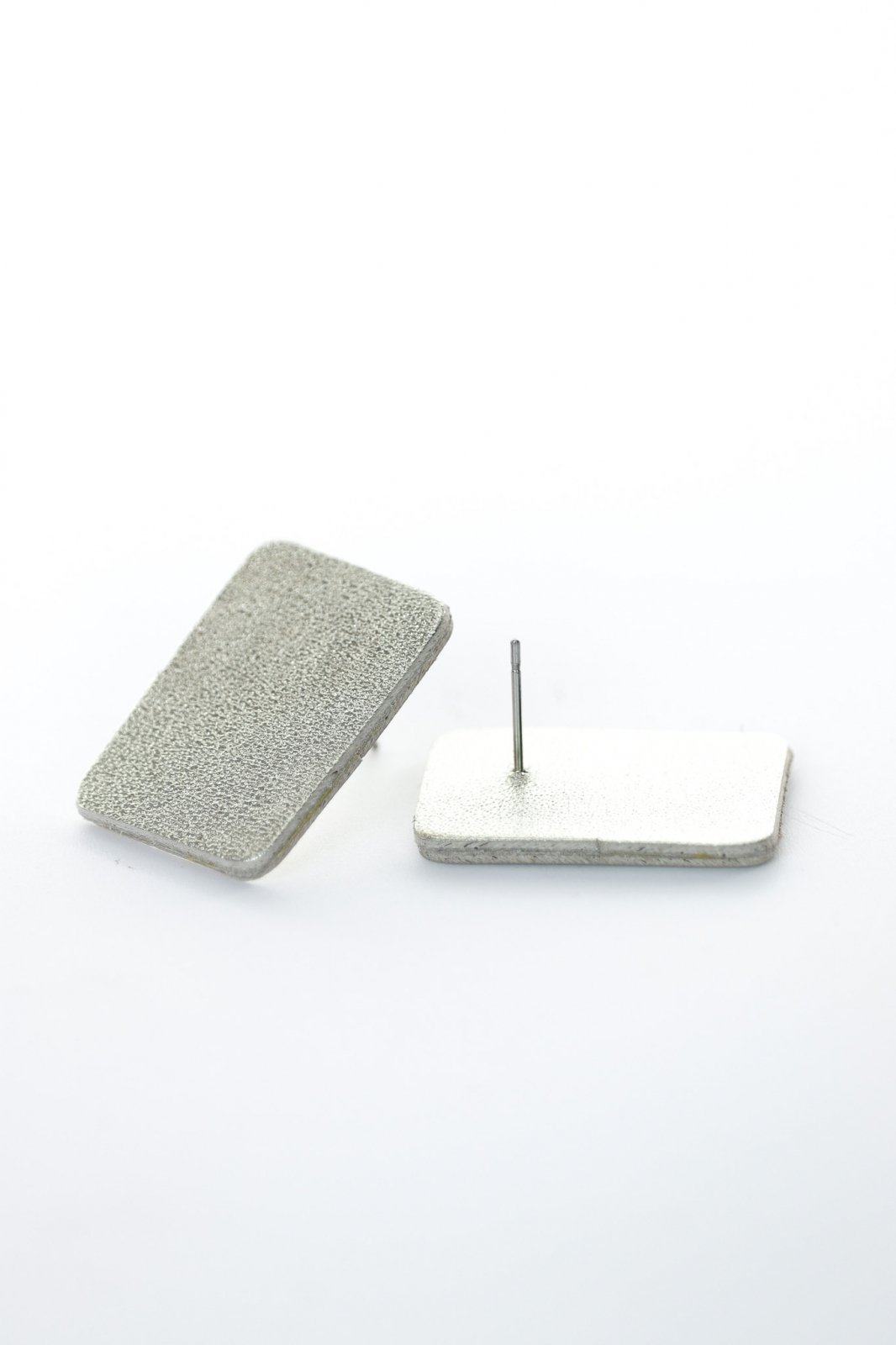 Strălucire Geometrică. Liniile curate se întâlnesc cu eleganța modernă în acești cercei dreptunghiulari. Lucrați manual din piele argintiu metalic, ei oferă un statement sofisticat și minimalist pentru orice ocazie.