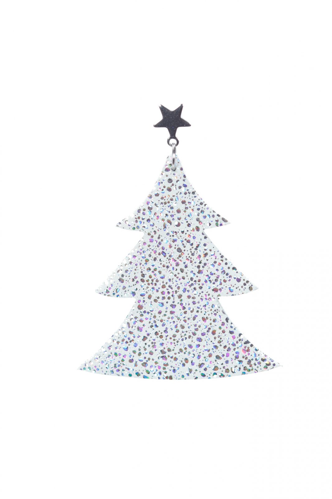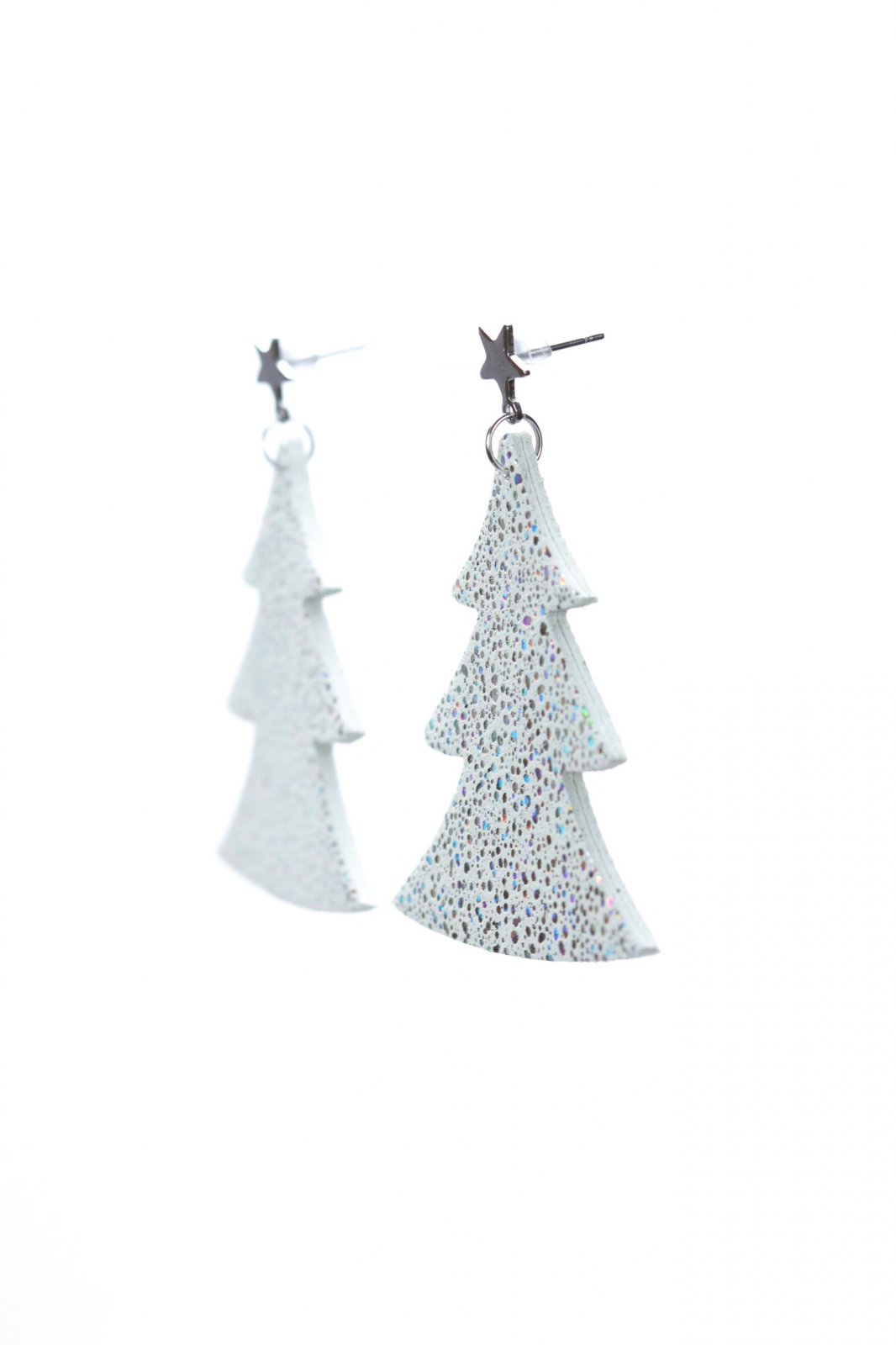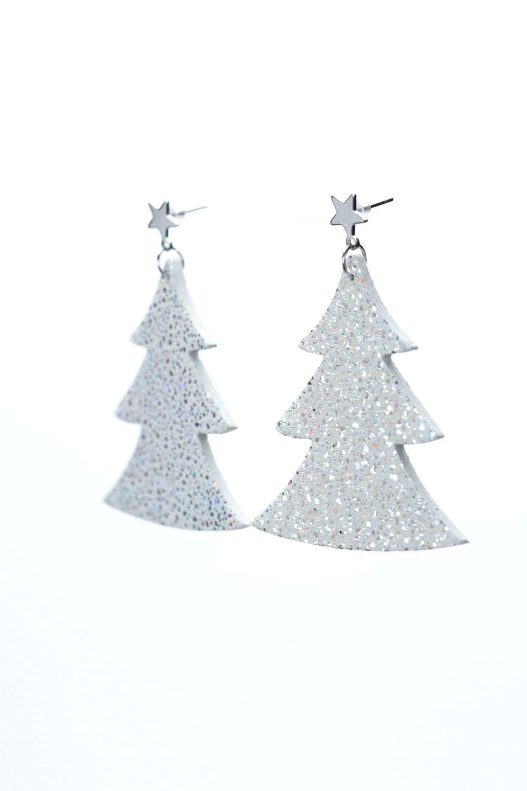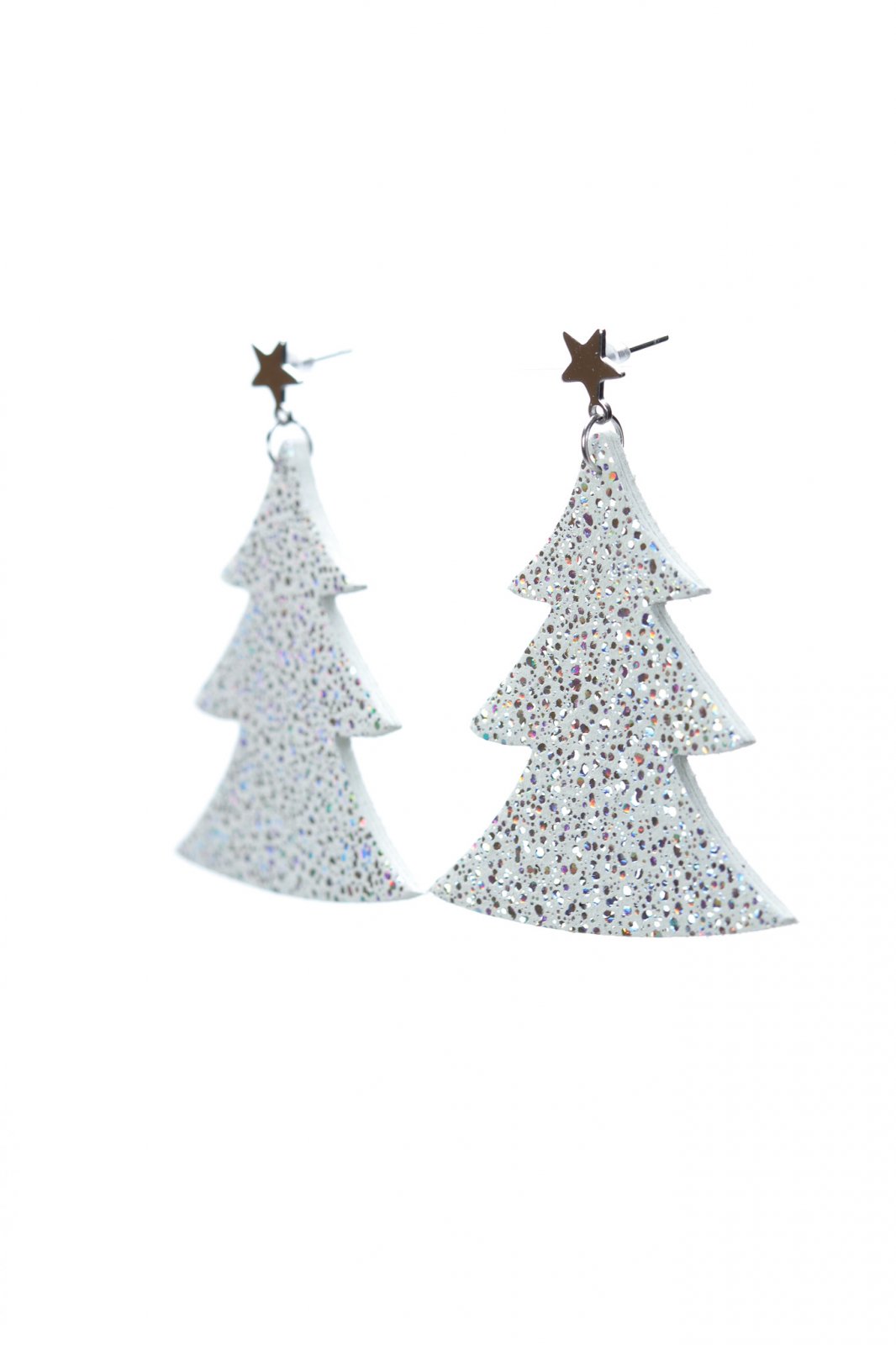 Strălucire pentru sezon. Acești cercei brad de Crăciun, orbitori, sunt lucrați manual din piele cu sclipici argintiu strălucitor. Un accesoriu distractiv, glamorous și ușor pentru toate sărbătorile tale.