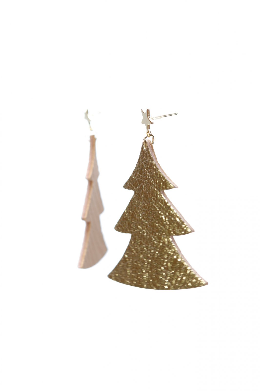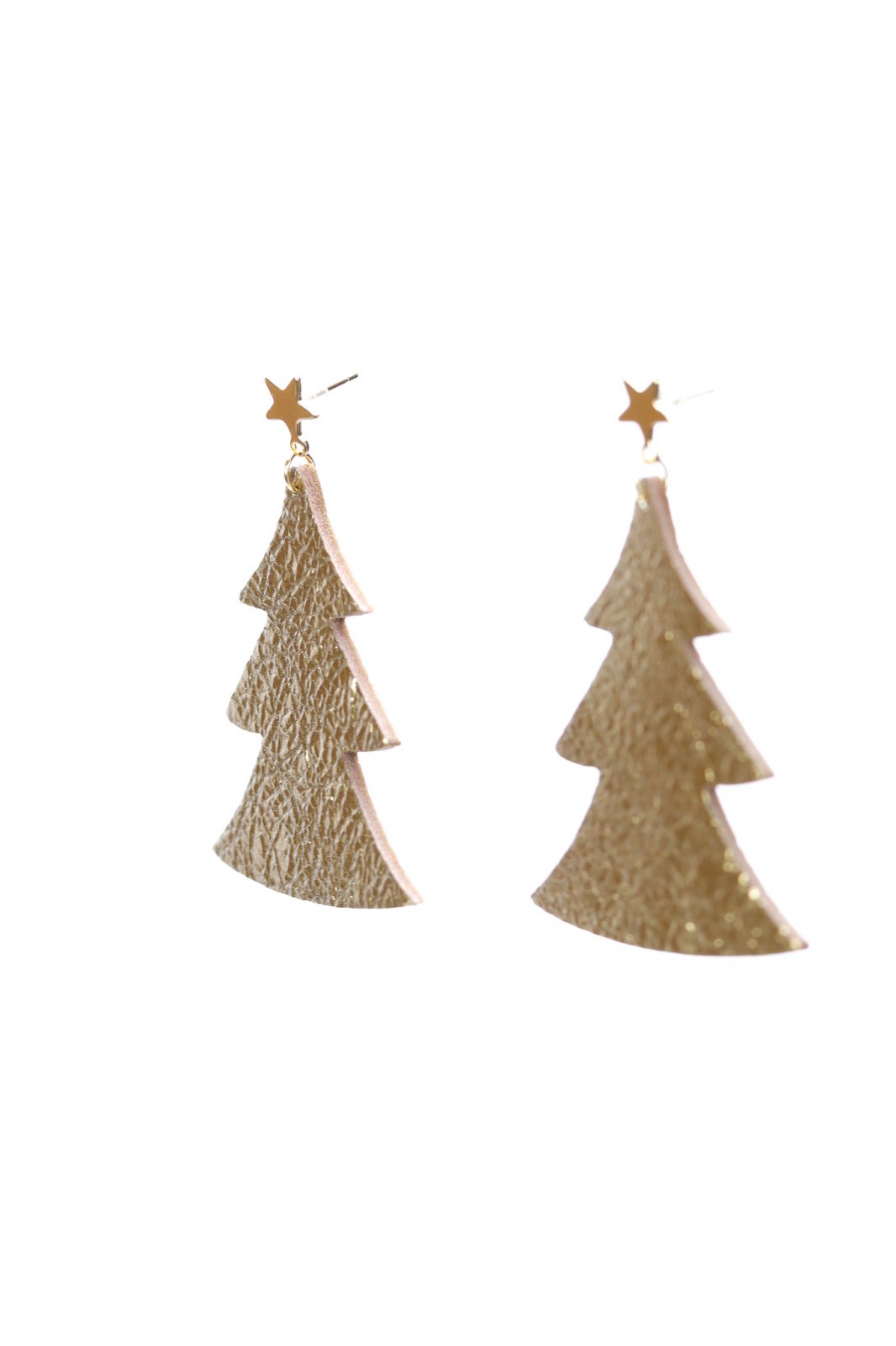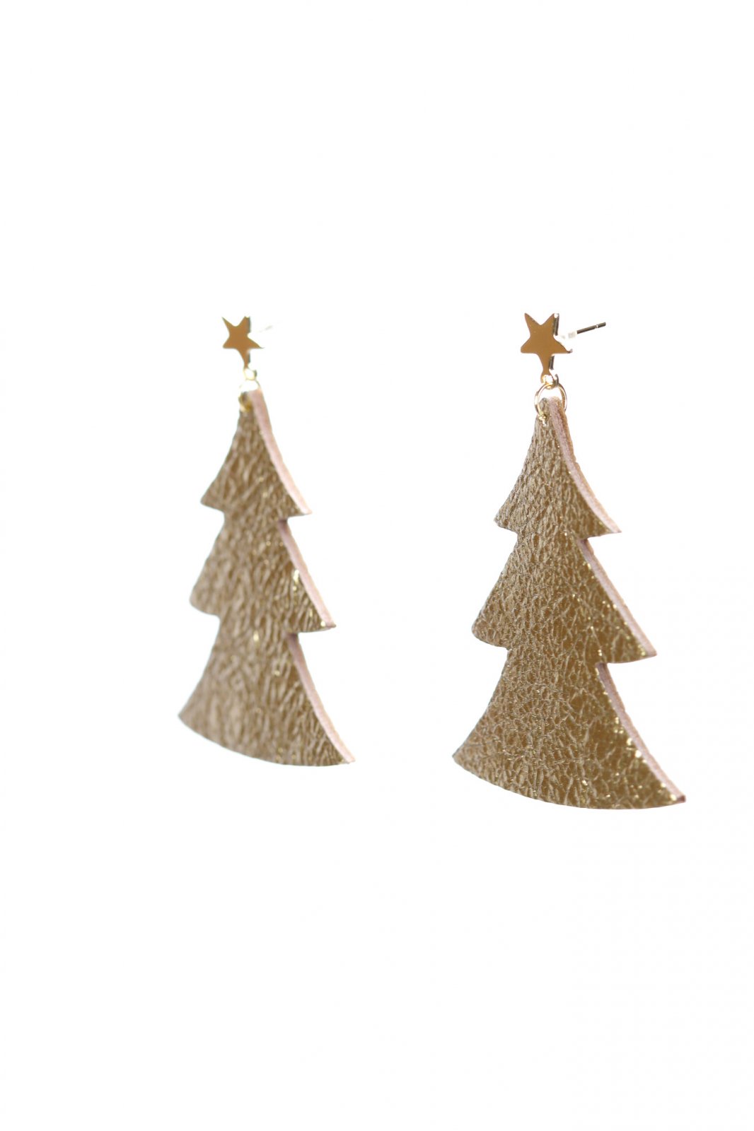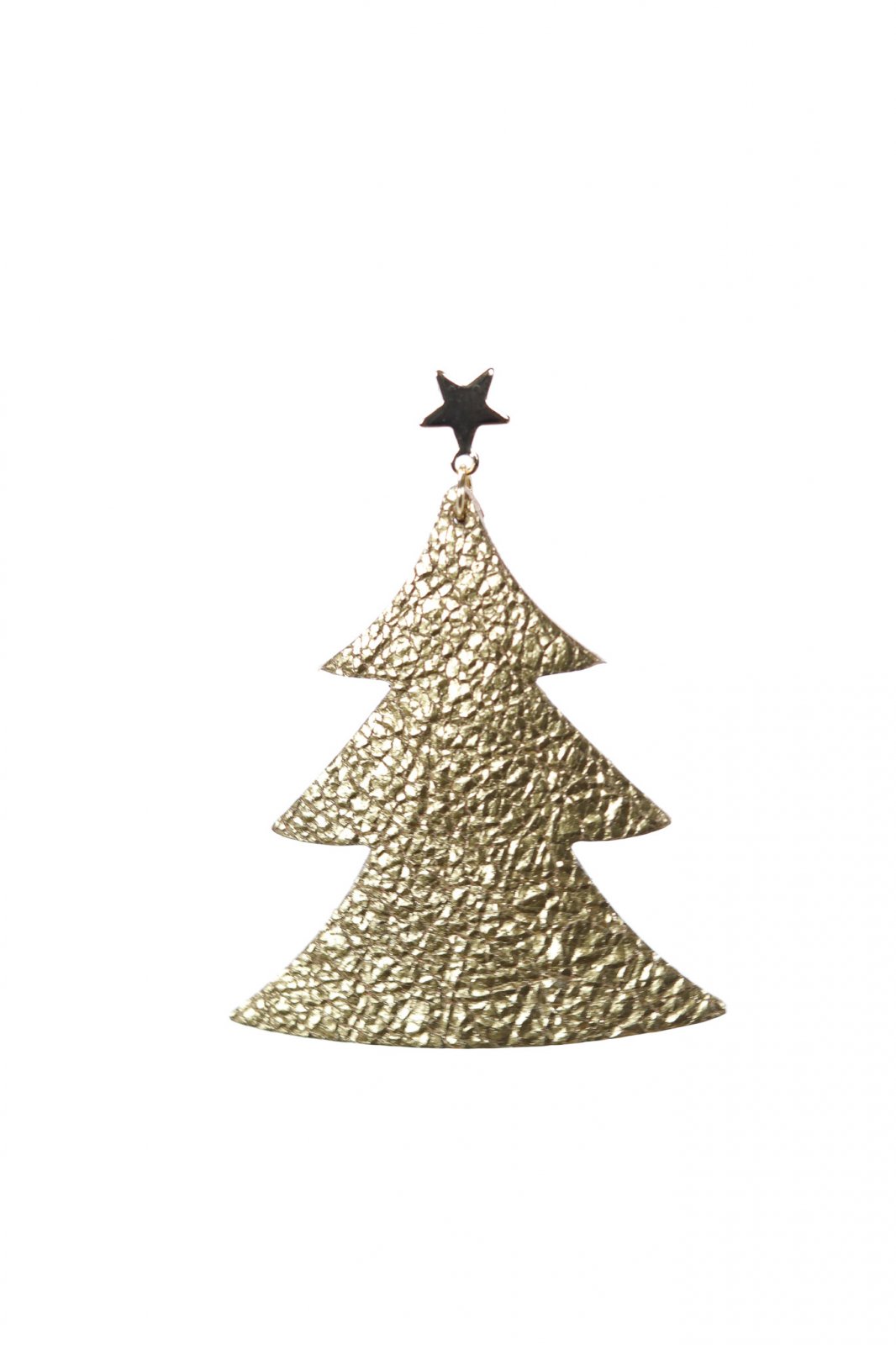 Strălucire Aurie de Sărbătoare. Strălucește cu acești cercei festivi de 7 cm în formă de brad de Crăciun. Lucrați manual din piele aurie și încoronați cu o steluță argintie pentru un look elegant și festiv.