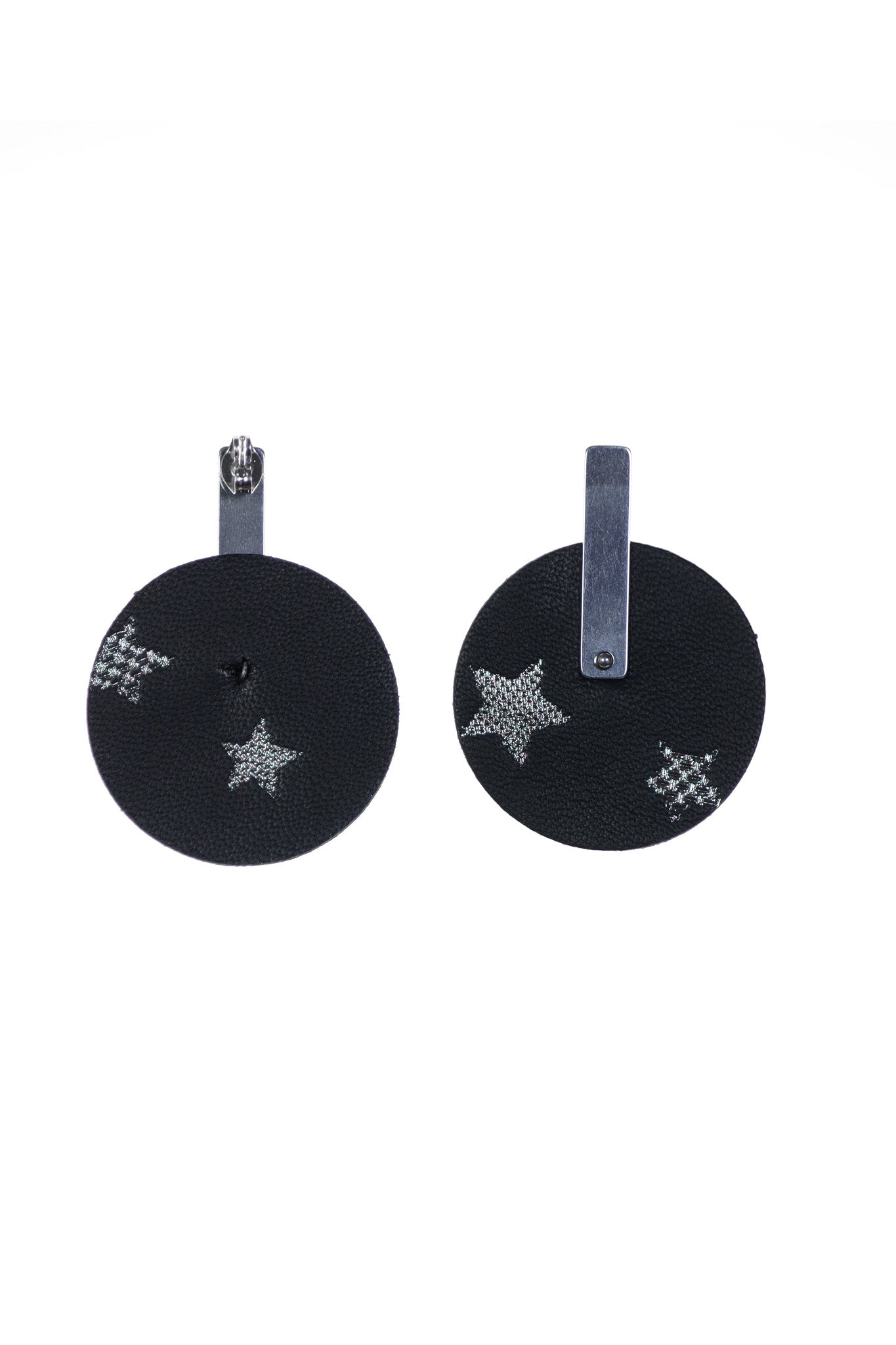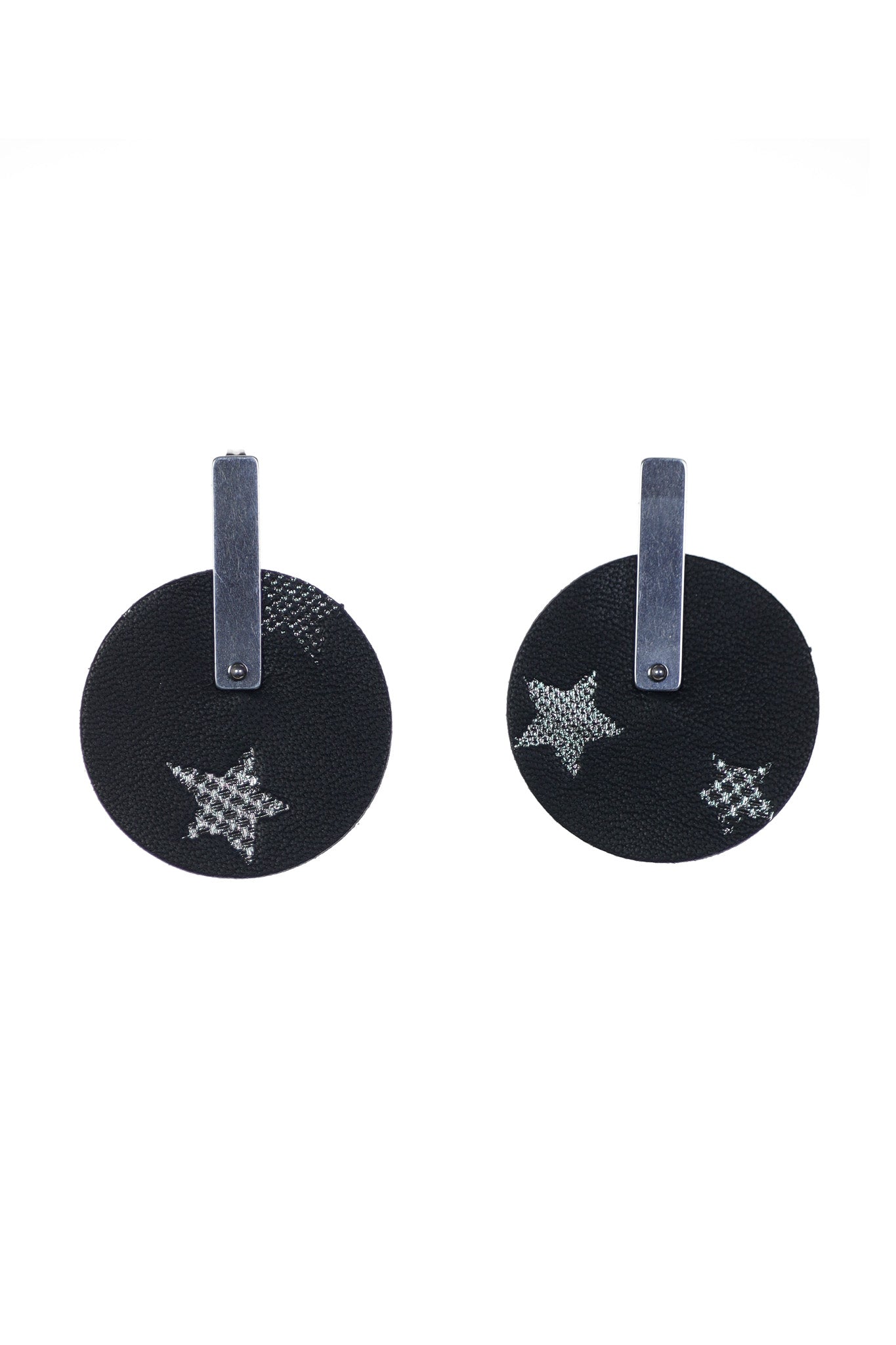 Lasă-te purtată de un design inspirat de cerul nopții, perfect pentru orice sezon. Baza, un disc de 3.5 cm din piele naturală de culoare Negru Profund, servește ca o "pânză" pentru aplicațiile stelare, care variază în textură (sclipici și carouri subtile) și sunt de culoare Argintiu. Prinderea este inedită: o baretă metalică Argintie care alunecă elegant pe lobul urechii, adăugând un touch de modernism minimalist. Cu o lungime totală de 4.5 cm, acești cercei sunt un statement vizual rafinat. Poartă-i pentru a te simți plină de încredere și pentru a adăuga un accent de glamour atemporal ținutei tale.