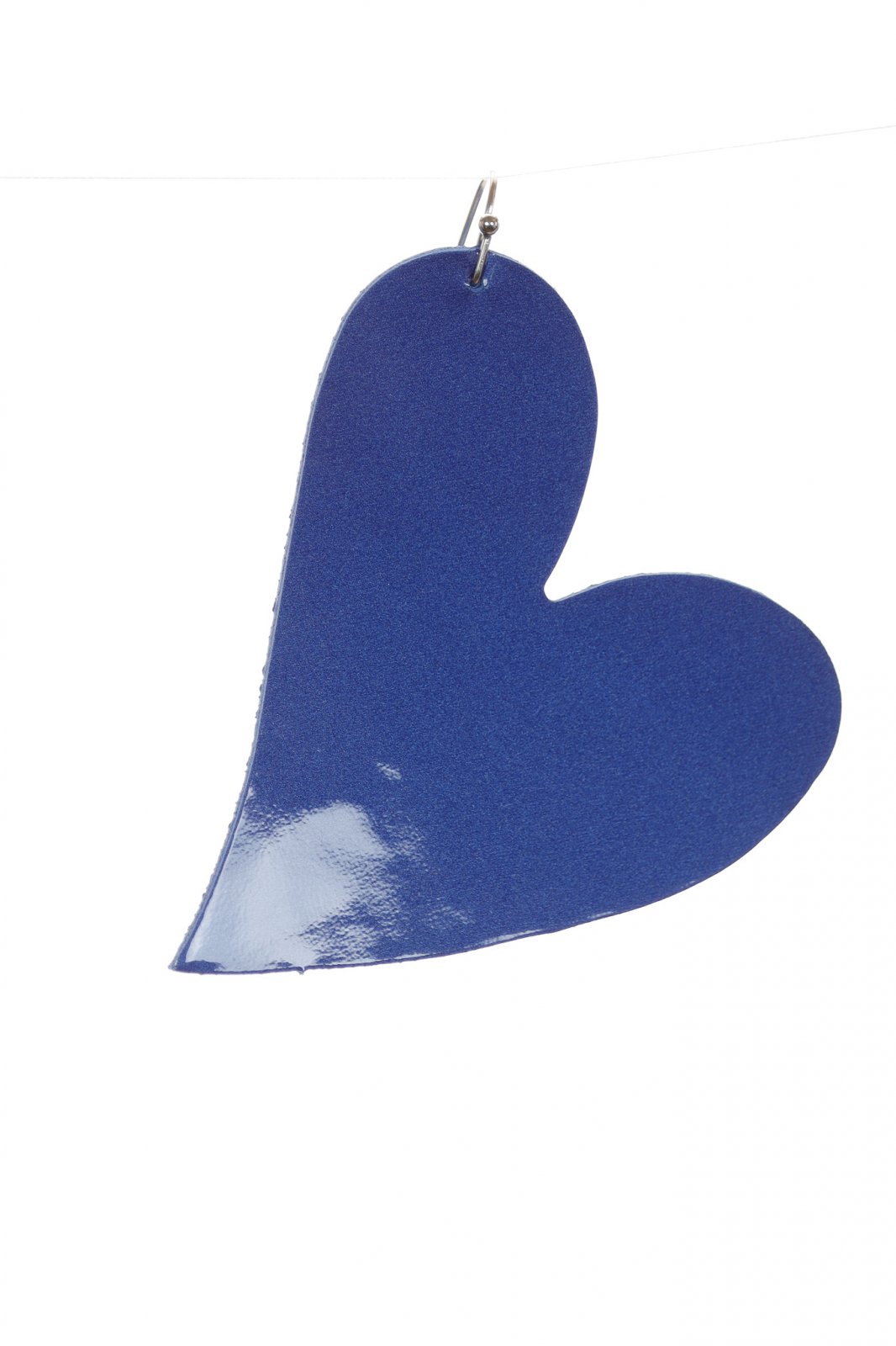 O pată de Romantism. Acești cercei mari, de 7 cm, în formă de inimă, sunt lucrați manual din piele naturală cu un finisaj lacuit albastru vibrant, cu luciu intens, adăugând o notă îndrăzneață și romantică de culoare.
