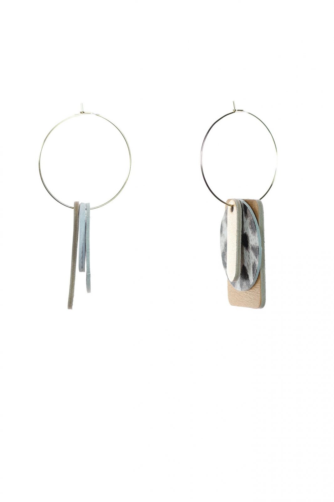 **"Cercei statement din piele naturală, din colecția "Mix & Match", într-o combinație sofisticată de print animal, argintiu metalic și bej. Un accesoriu versatil care aduce un plus de eleganță și personalitate oricărei ținute.
