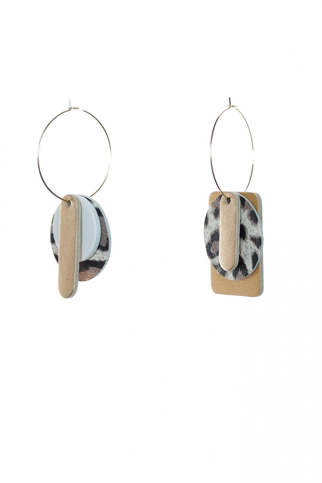 Acești cercei statement din colecția "Mix & Match" oferă posibilitatea de a-ți crea propriul stil prin rearanjarea celor trei elemente componente. Fiecare cercel prezintă forme geometrice distincte – cerc, dreptunghi și oval – în combinații de print animal, argintiu metalic și bej, care pot fi amestecate și asortate după preferință. Designul modular și versatil îi face un accesoriu perfect pentru a fi adaptat la diferite ținute și ocazii.