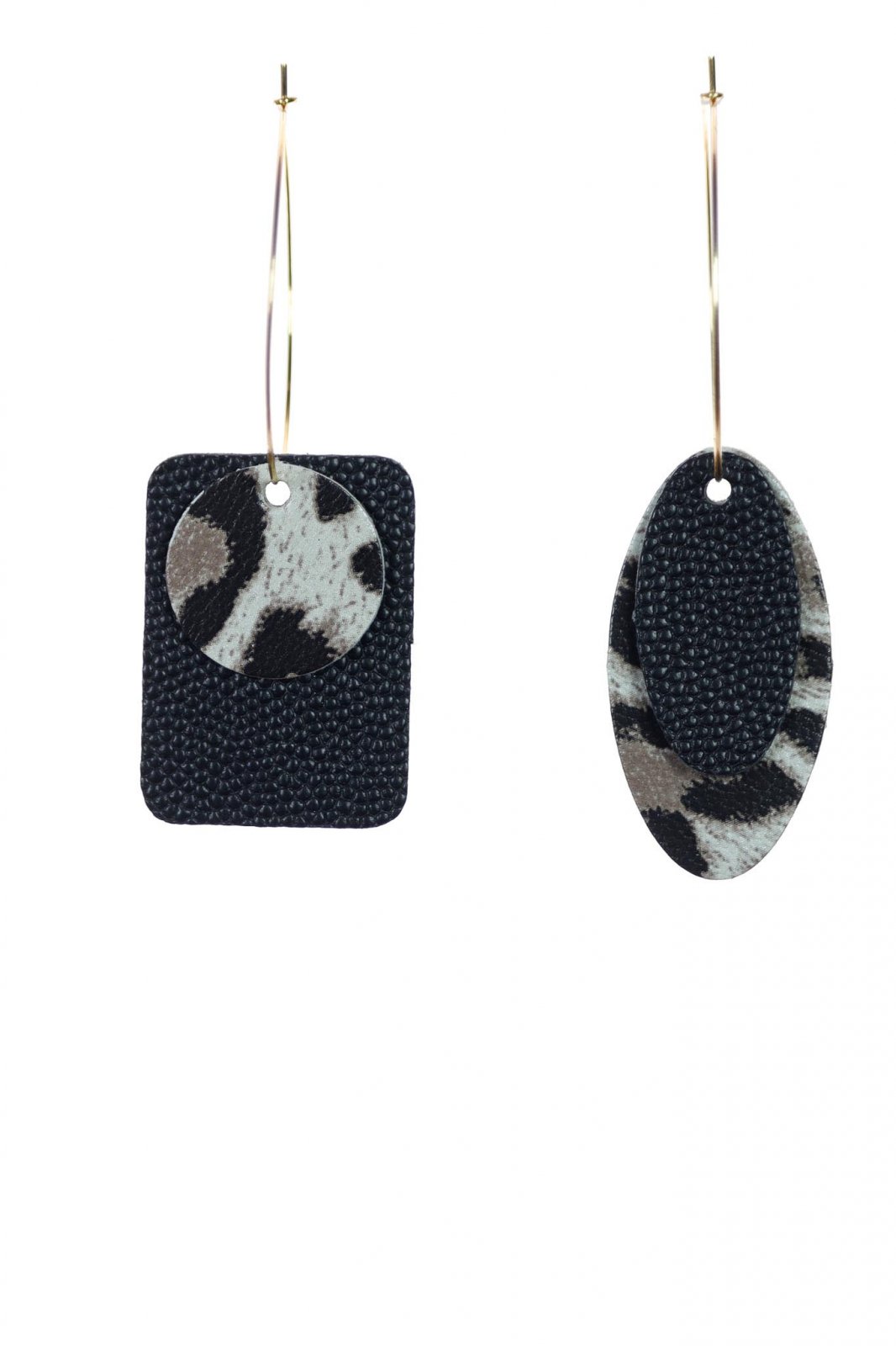 Cercei statement din piele naturală, din colecția "Mix & Match", într-o combinație sofisticată de negru texturat și animal print. Un accesoriu versatil care aduce un plus de rafinament și originalitate oricărei ținute.