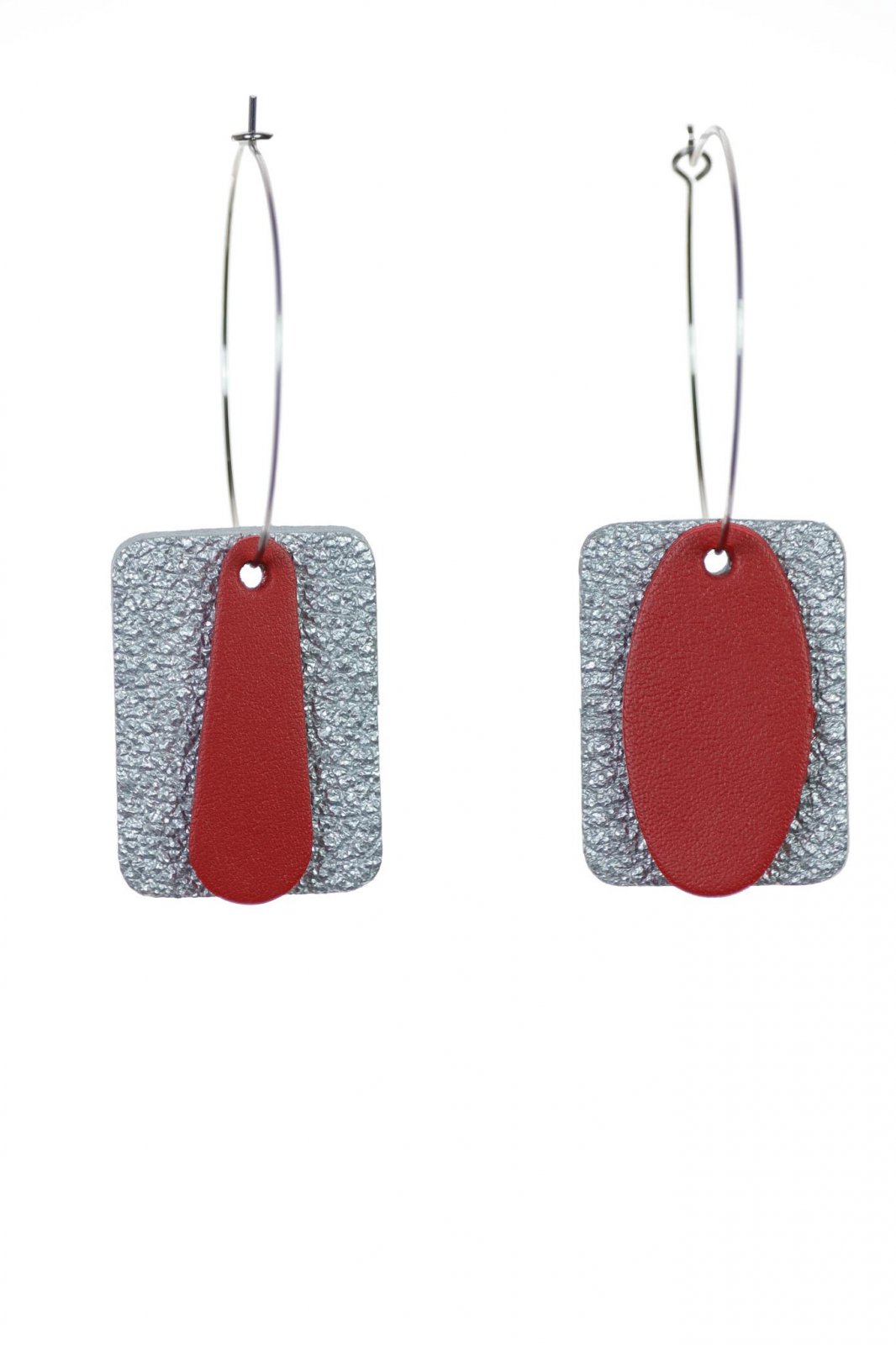 Cercei statement din piele naturală, într-o combinație elegantă de roșu și argintiu metalic. Un accesoriu versatil care aduce un plus de rafinament și strălucire oricărei ținute.