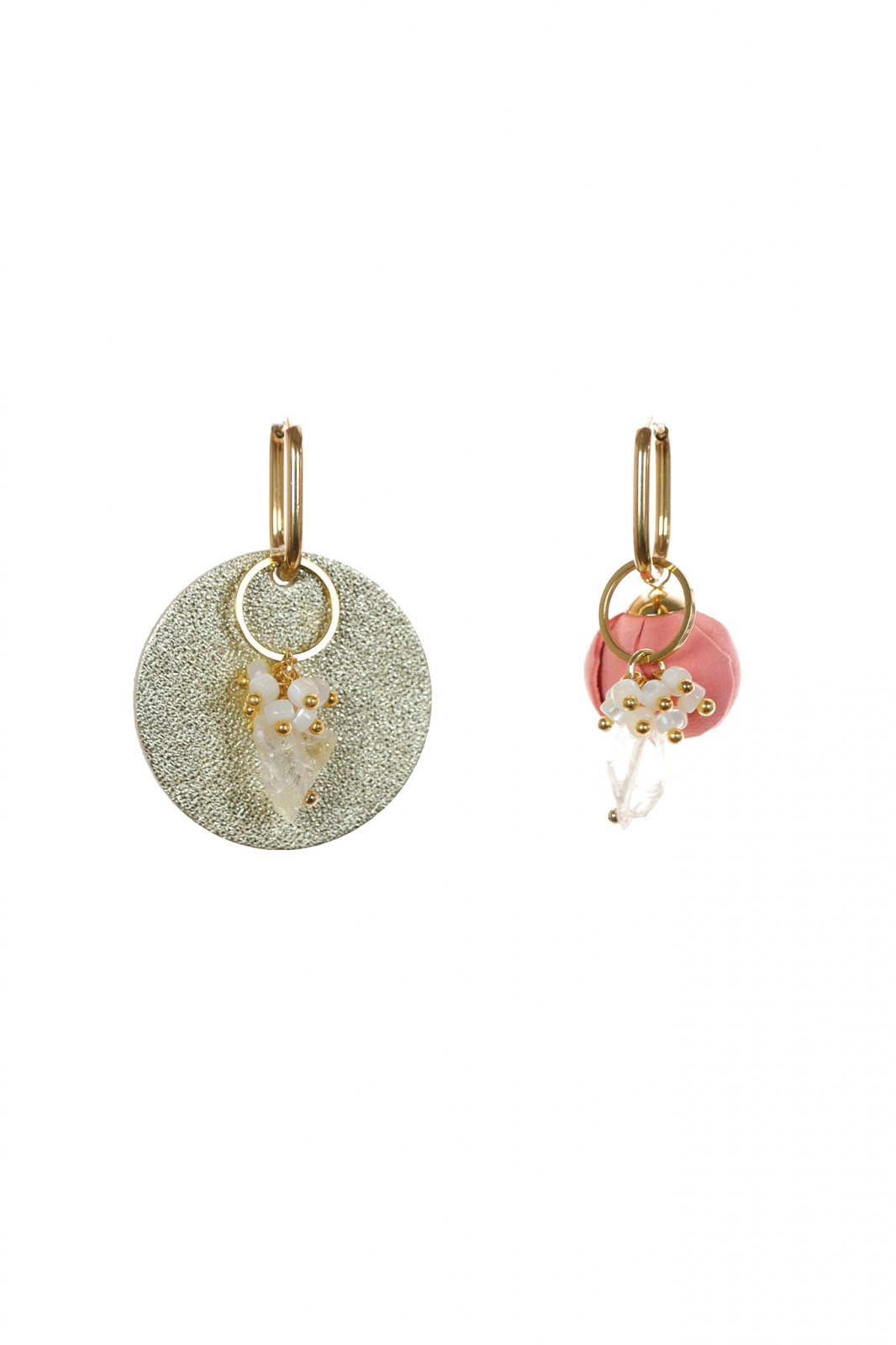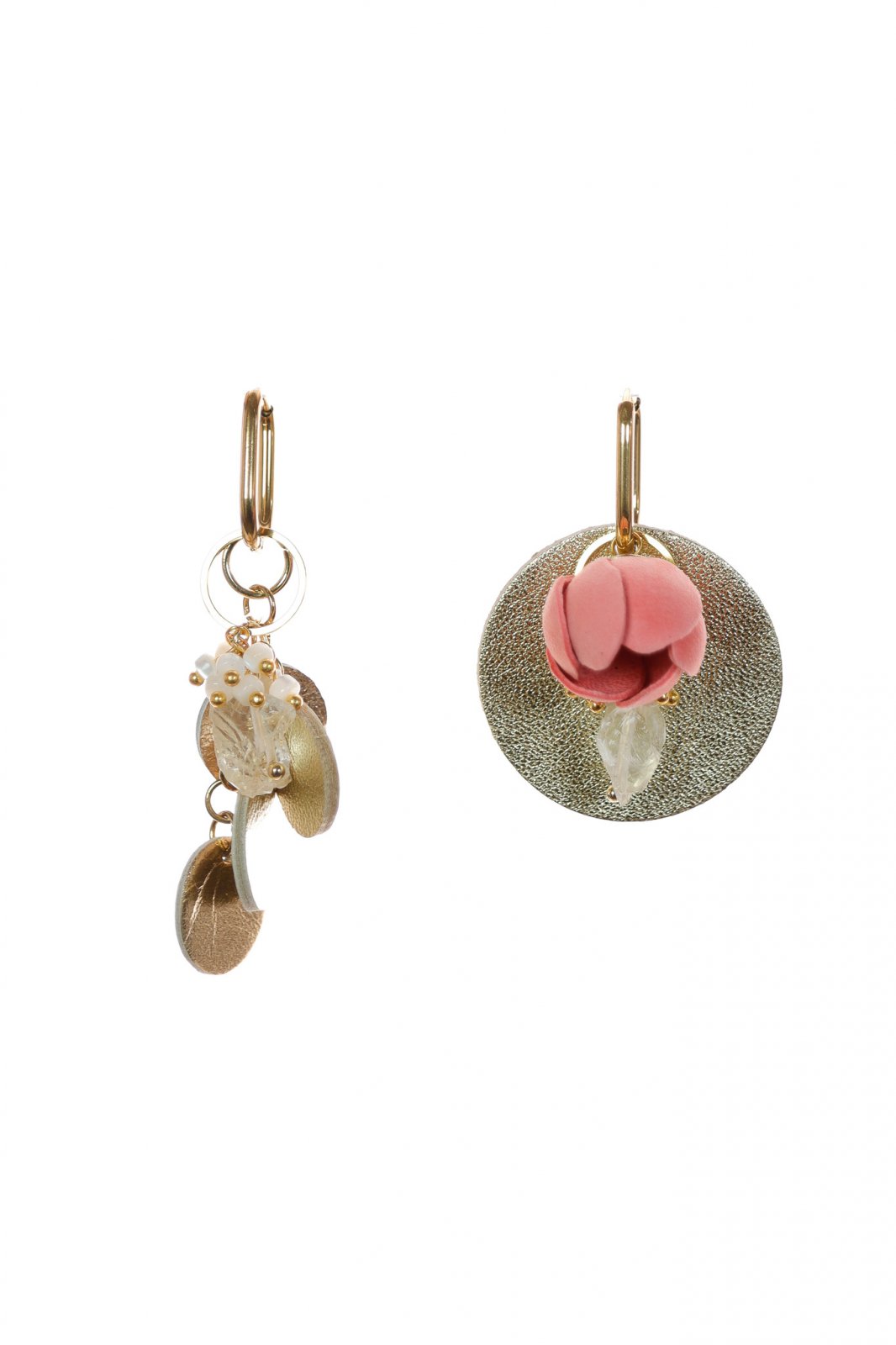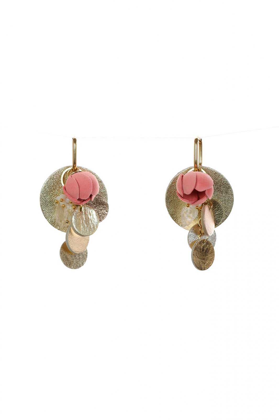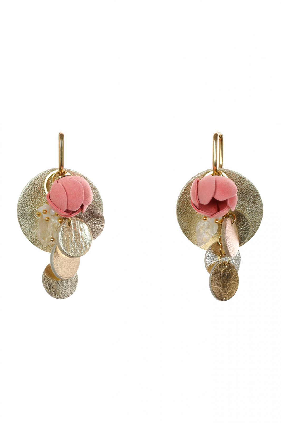 Stilul tău, alegerea ta. Un set de cercei modular, versatil, ce prezintă un trandafir delicat din piele roz pudră și cercuri moderne auriu metalic. Combină, asortează și creează-ți propriul look unic.
