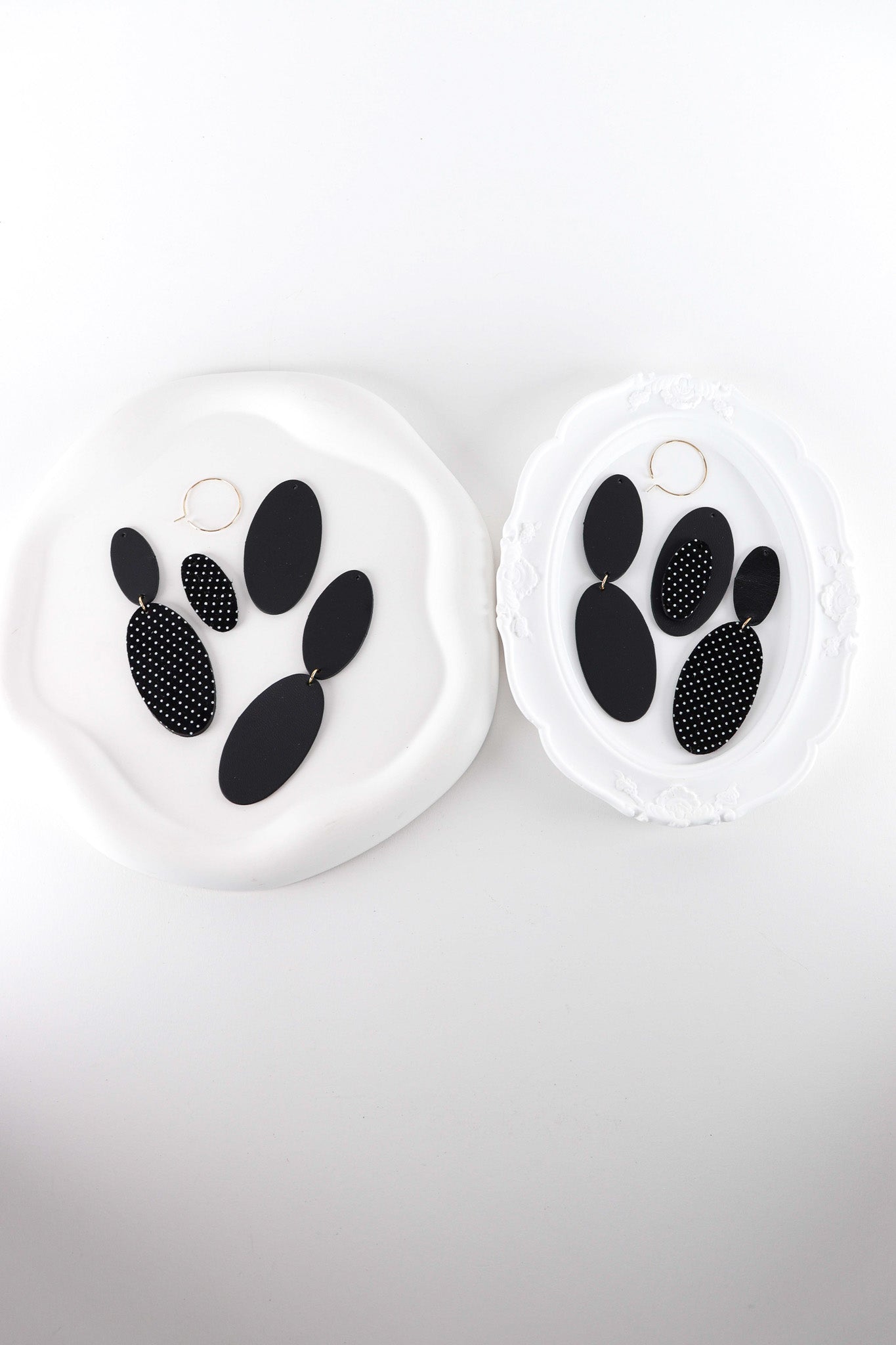 Fiecare pereche este un set versatil care îți permite să fii propriul designer de bijuterii, combinând formele alungite. Realizați din piele naturală de cea mai bună calitate, elementele se joacă cu contrastele: Negrul Mat profund și Negrul cu Picățele Albe (buline) creează un look grafic, atemporal și avangardist.