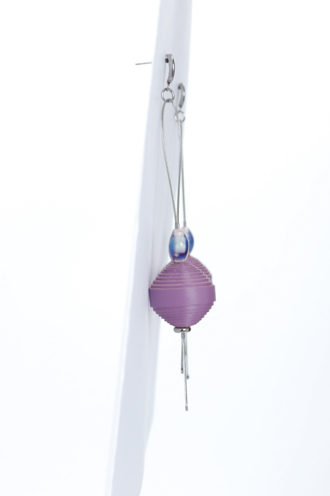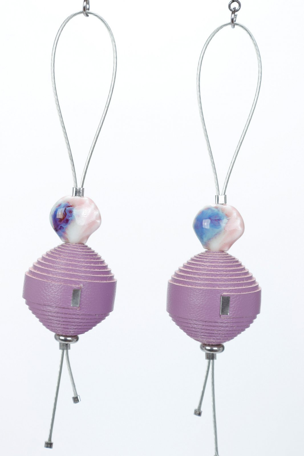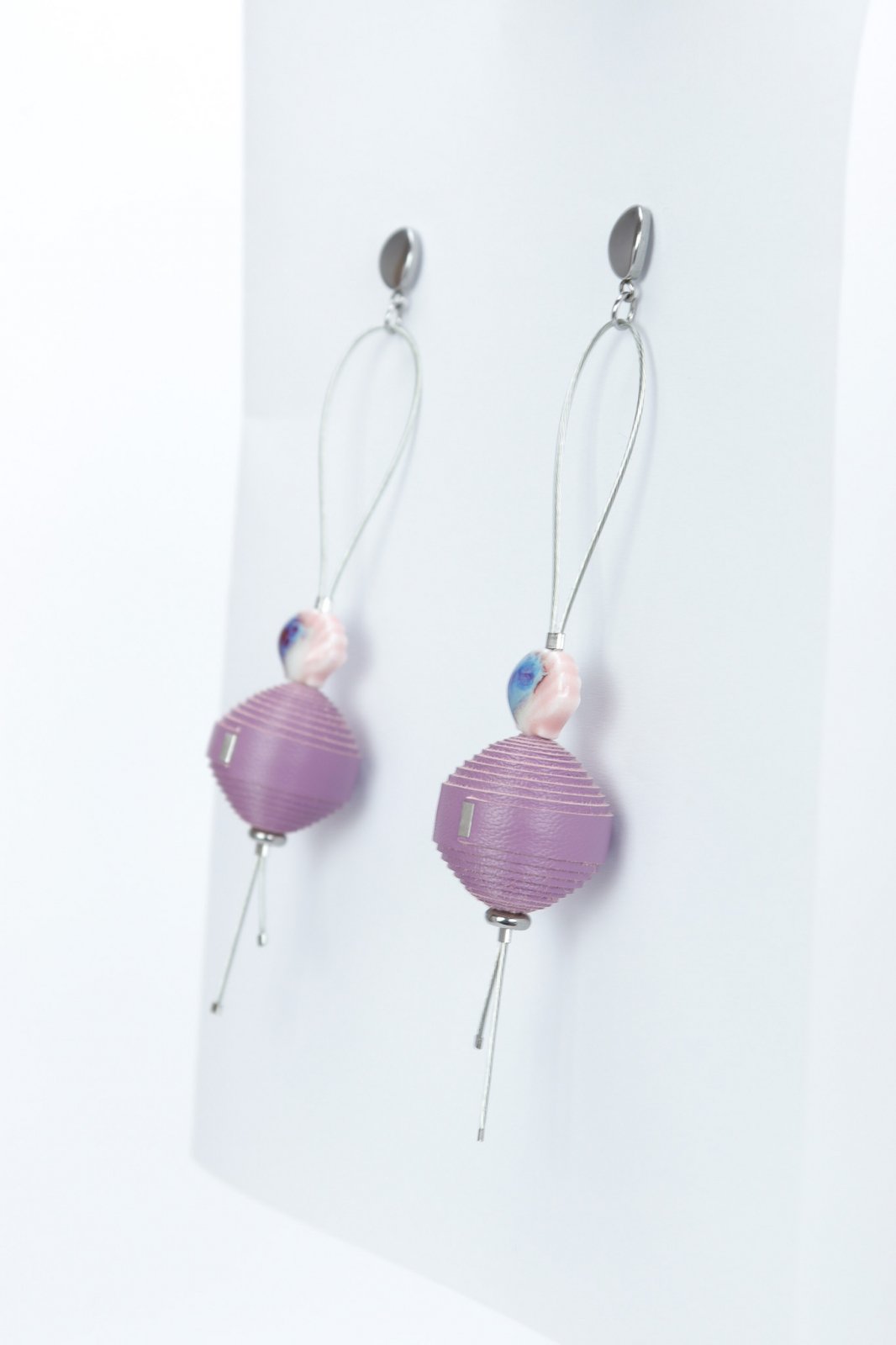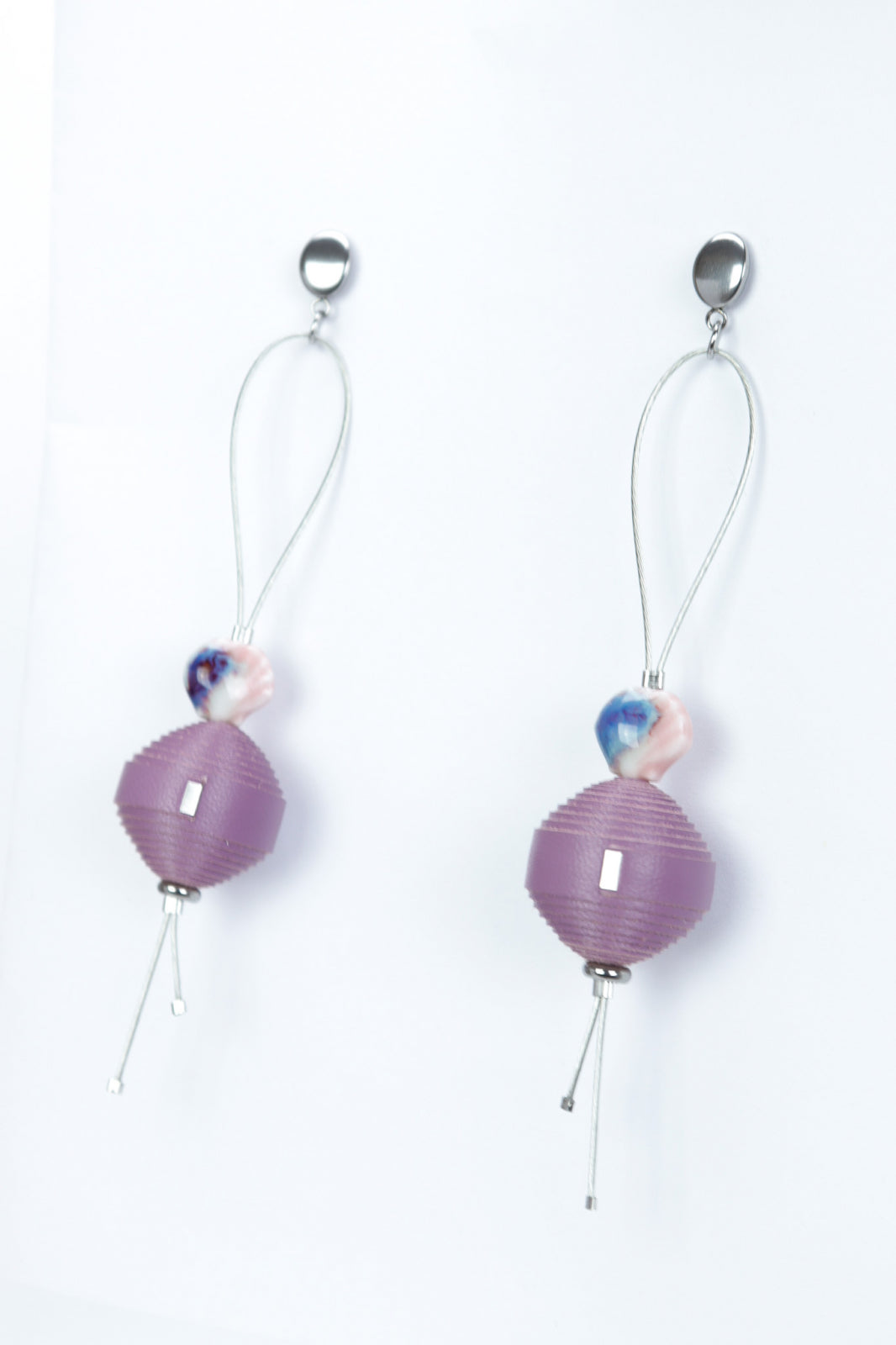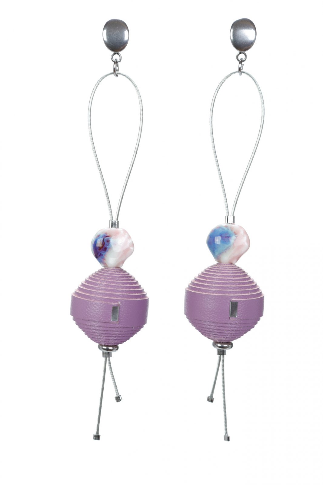 Farmec delicat. O mărgea din piele lila moale, lucrată manual din piele italiană și accentuată cu un detaliu ceramic, plutește pe o sârmă discretă. Un cercel de 10 cm pentru o notă de stil modern, romantic.