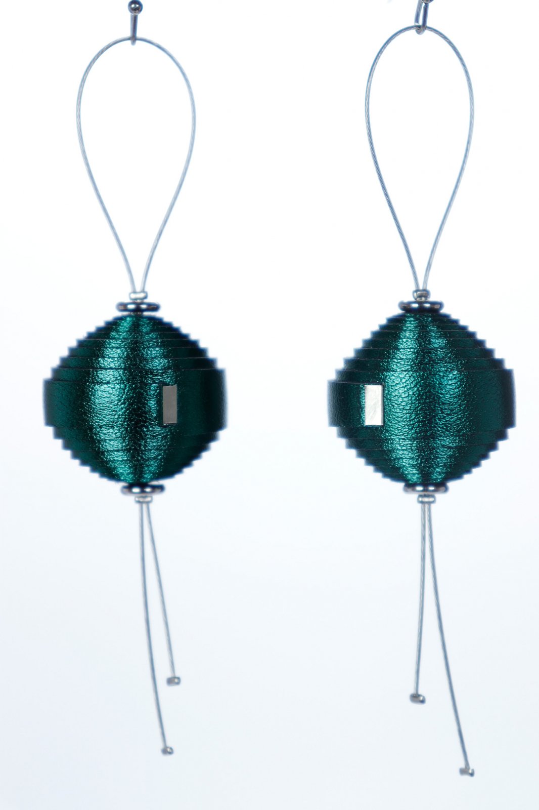Luciu Luxos. O mărgea din piele italiană lucrată manual, într-un verde smarald sidefat uimitor, plutește pe o sârmă discretă, creând un cercel statement bogat și elegant de 10 cm.