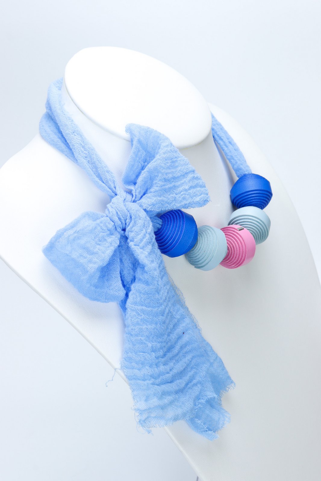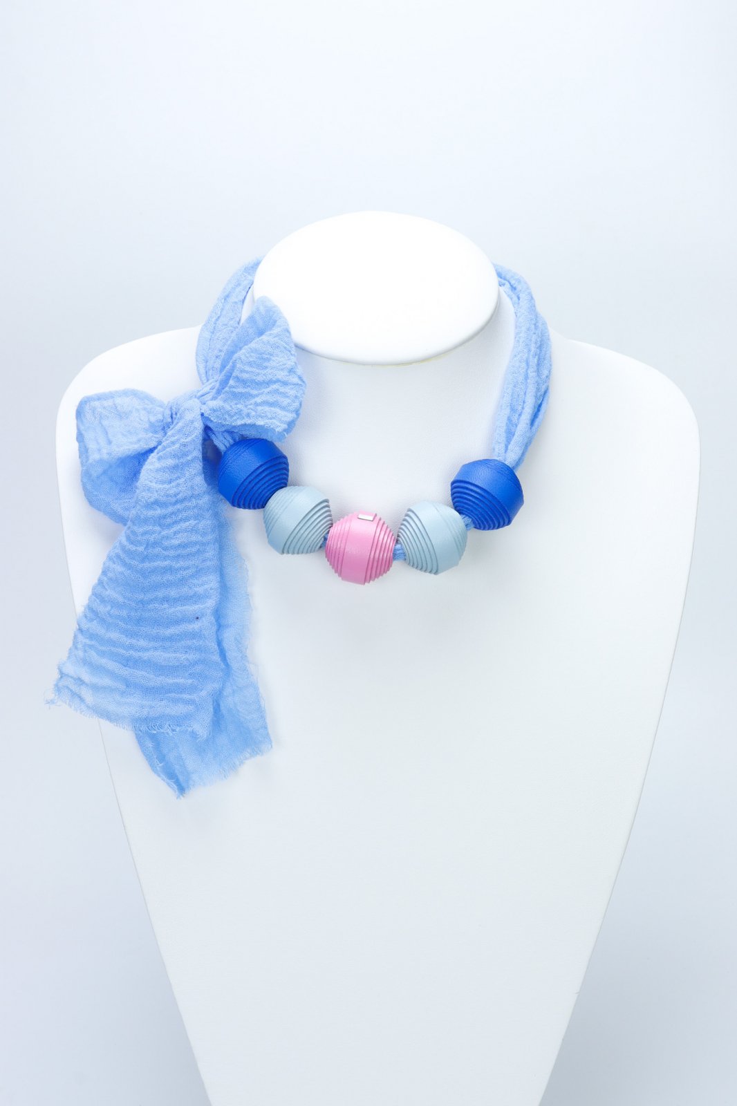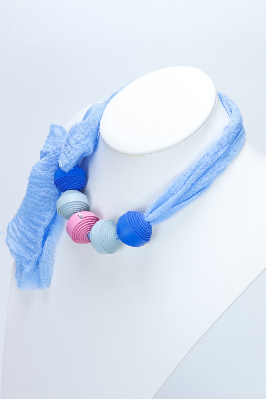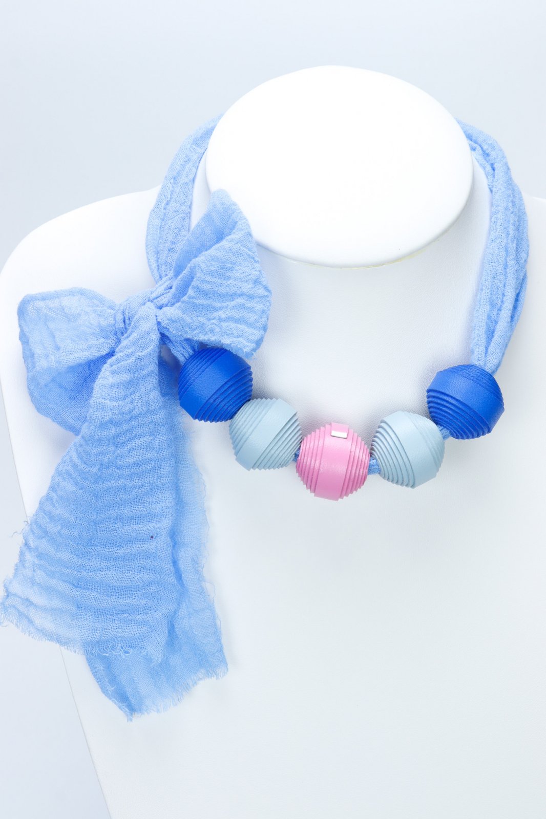 Esența Mării Egee. Inspirat de albastrul și albul emblematic al insulelor grecești, colierul "Santorini" prezintă mărgele din piele lucrate manual pe o bază șic din pânză pentru un look proaspăt, de coastă.