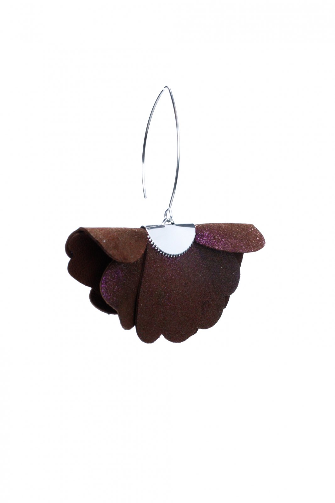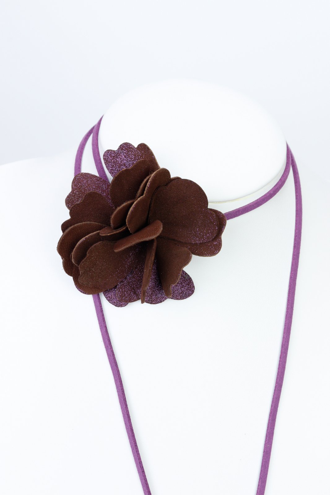"Acest set coordonat oferă un look unic și glamorous, perfect pentru a face un statement sofisticat. Colierul tip choker și cerceii asortați sunt lucrați manual dintr-o piele maro bogată, înfrumusețată de un sclipici mov surprinzător și feeric. Este o combinație stilată și neașteptată care va atrage privirile, îmbinând tonurile pământii cu o notă de sclipire magică.Caracteristici: