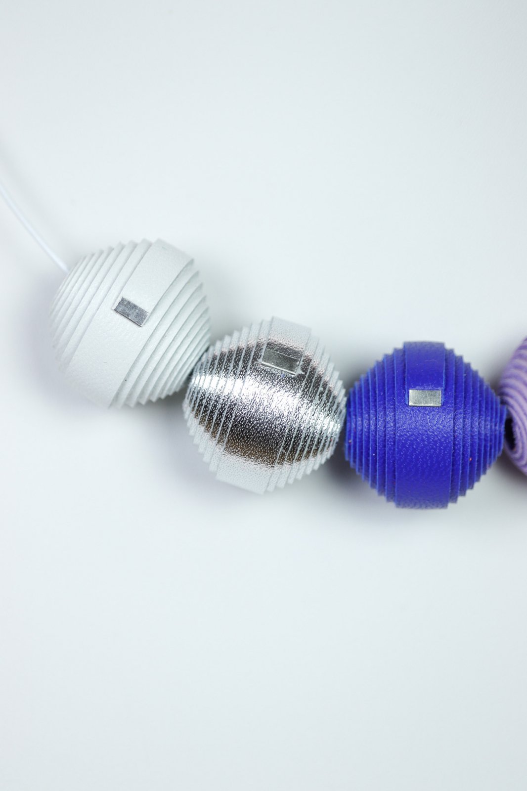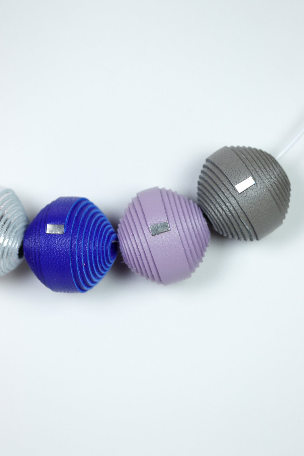 Colier Leatherbonbon realizat din piele naturală cu mărgele texturate în nuanțe de albastru, violet și argintiu. Un accesoriu elegant care adaugă o notă de sofisticare și modernitate oricărei ținute.