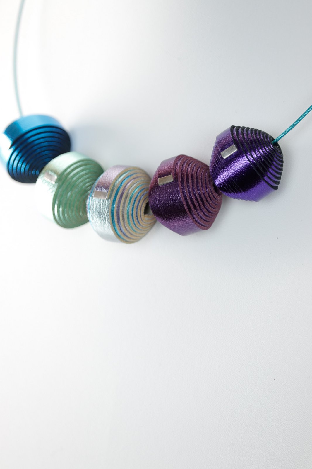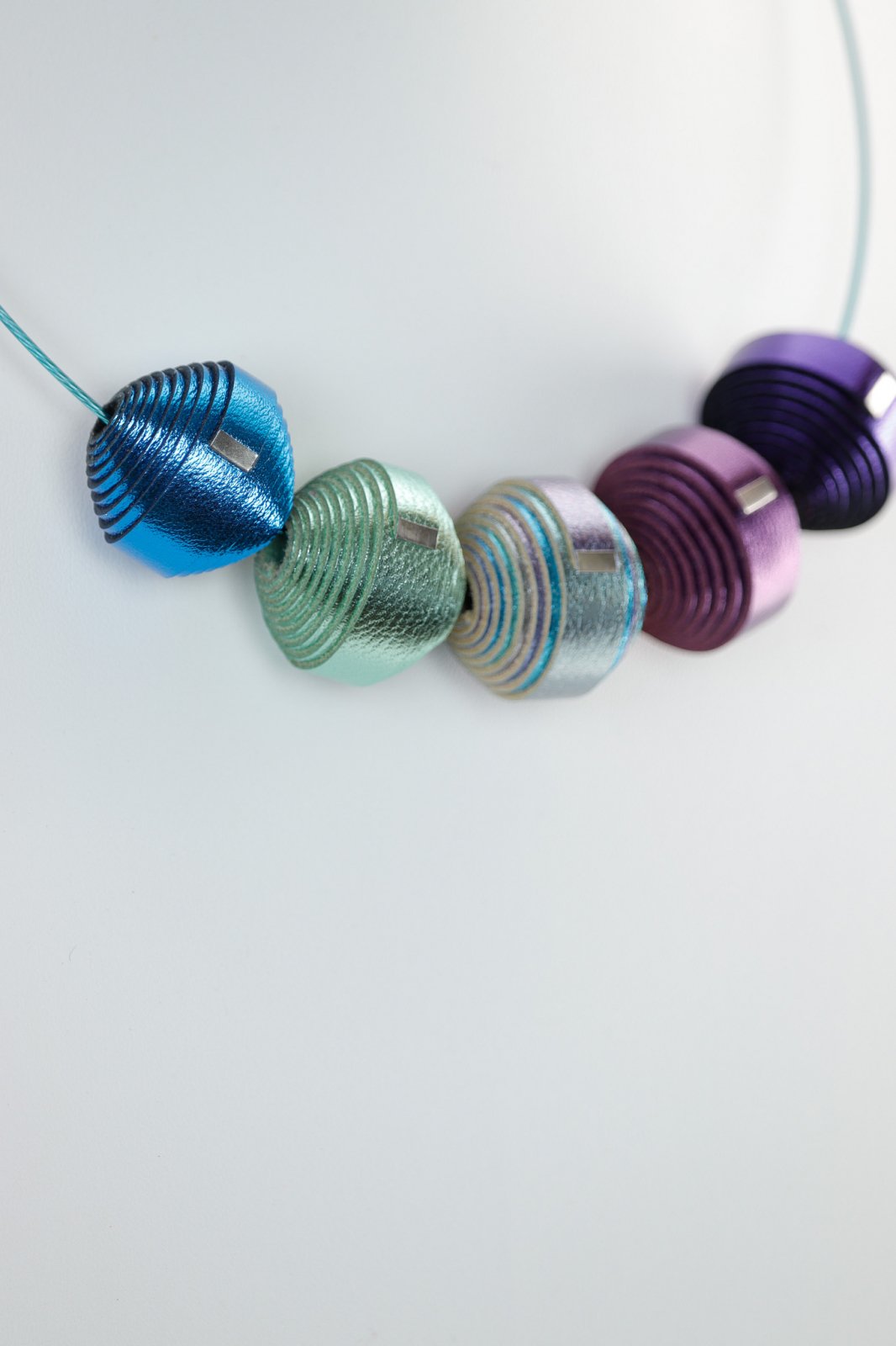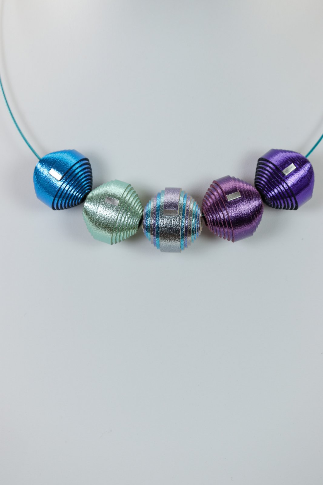 Strălucire metalică modernă. Acest colier din piele lucrat manual prezintă cinci mărgele în nuanțe metalice strălucitoare de albastru, verde și violet, creând un statement sofisticat și elegant de lux contemporan.