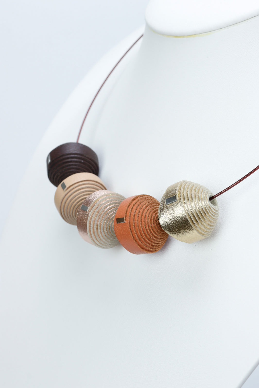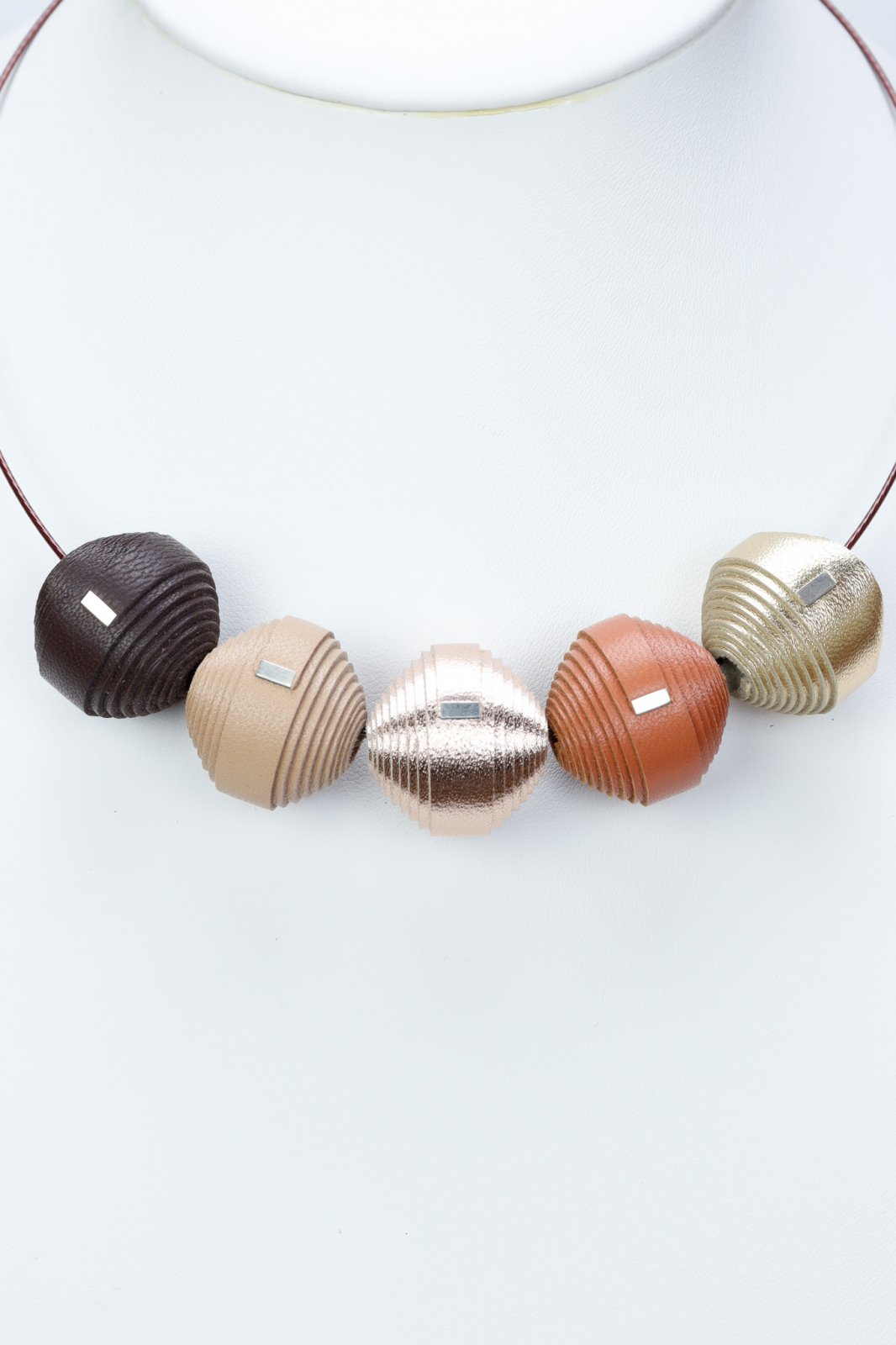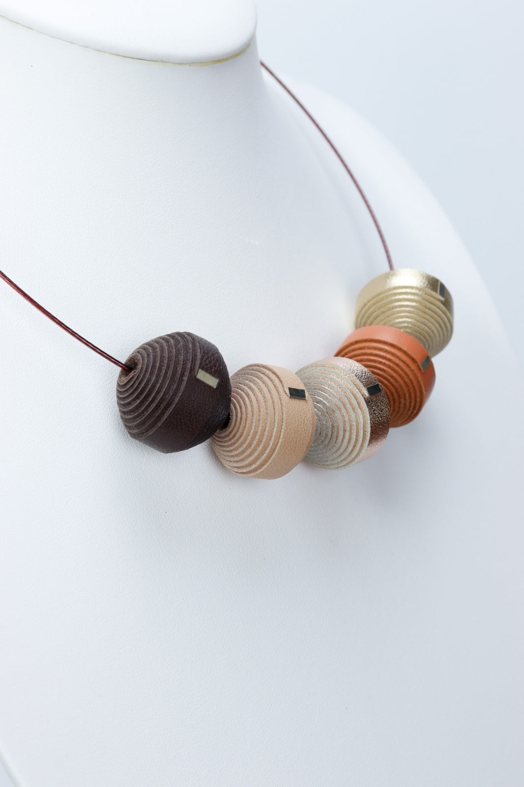 Chic contemporan. Modelul (602) din colecția Leatherbonbon este un colier statement lucrat manual, prezentând o compoziție unică de mărgele din piele naturală, perfect pentru un look modern, sofisticat.