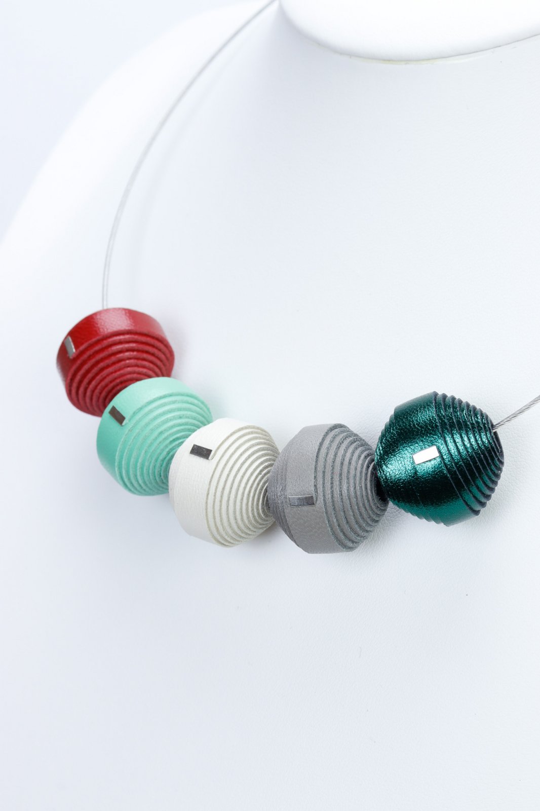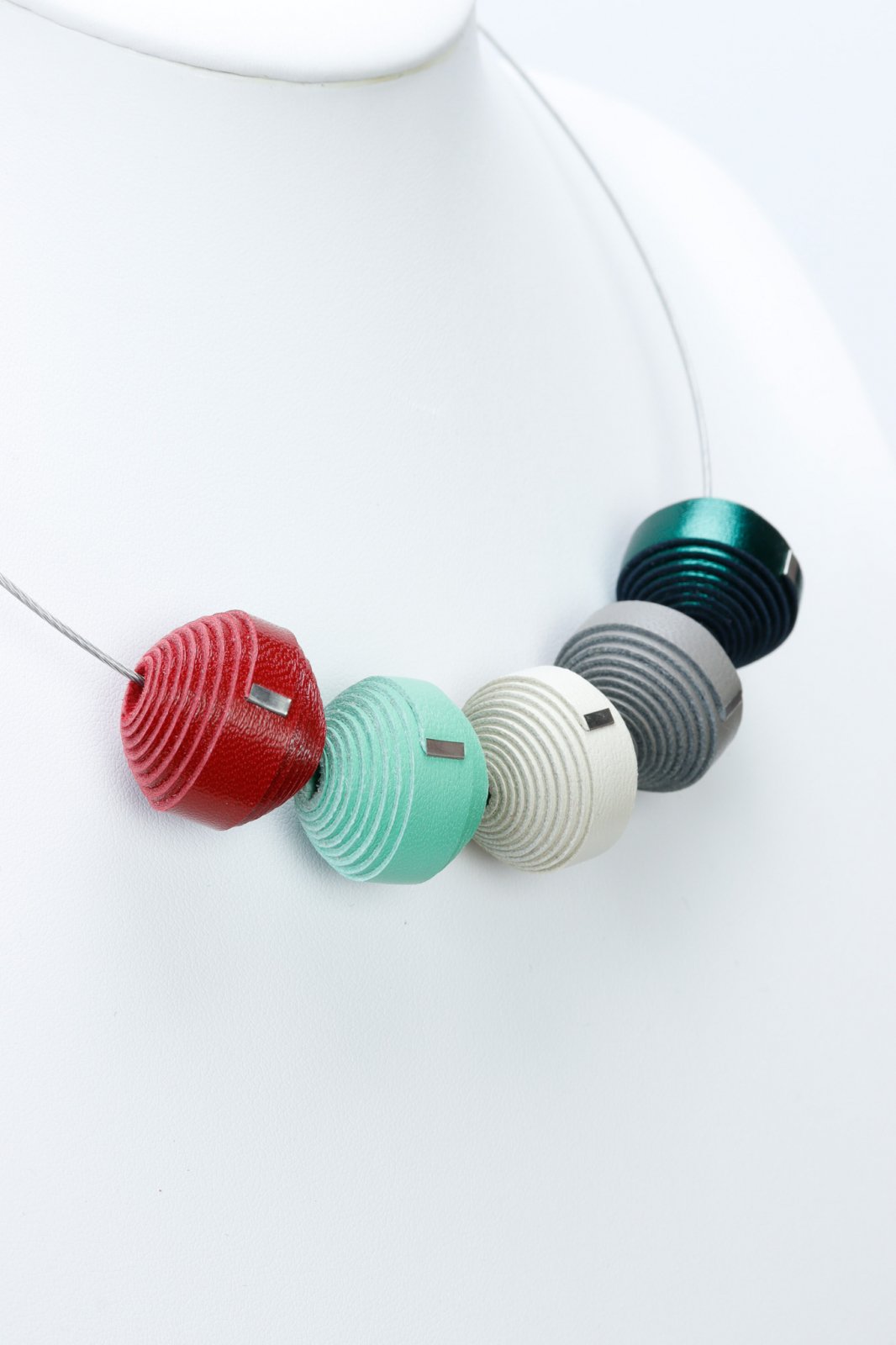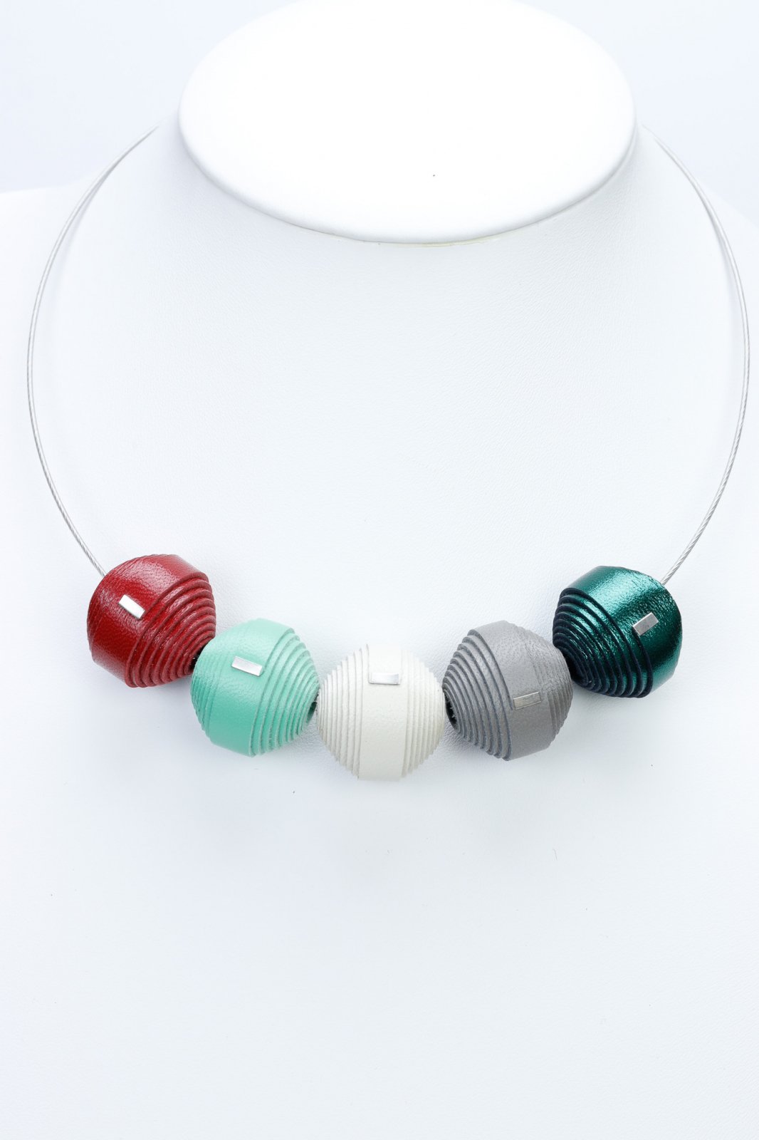Eleganță artizanală. O piesă statement unică din colecția Leatherbonbon, acest colier lucrat manual (Modelul 582) prezintă o selecție curată de mărgele din piele naturală pentru un look șic și fără efort.