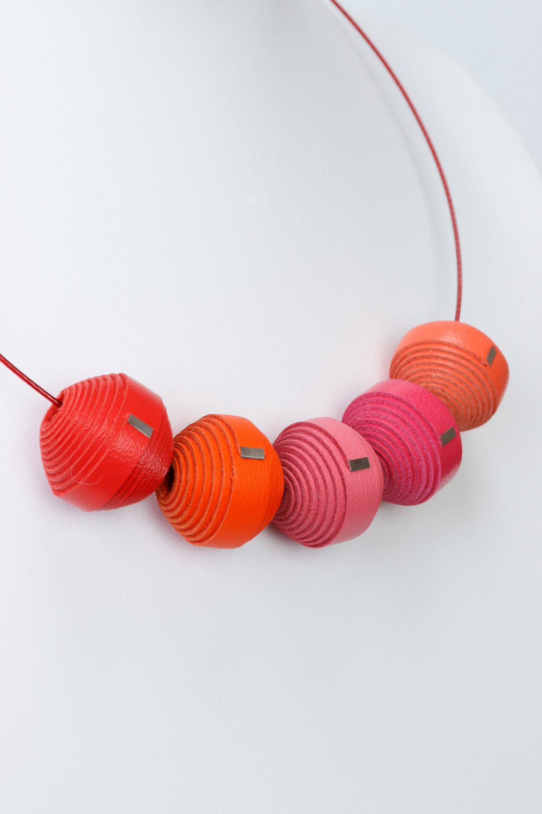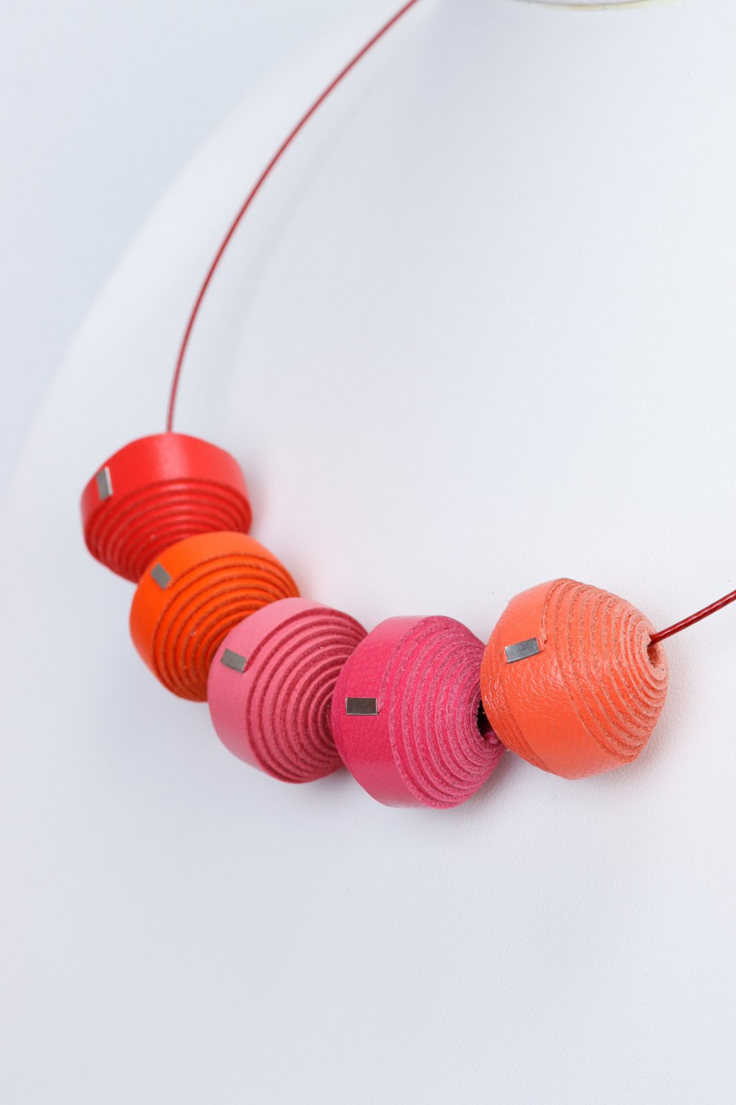 "O operă de artă unică, acest colier lucrat manual (Modelul 106) este o piesă de excepție din colecția Leatherbonbon. Acesta prezintă un aranjament atent curatoriat de mărgele din piele naturală, fiecare aleasă pentru culoarea și textura sa unică, creând o compoziție armonioasă și stilată. Așezat pe o bază confortabilă și flexibilă, acest colier este conceput ca o piesă statement versatilă, întruchipând designul contemporan și măiestria artizanală.Caracteristici: