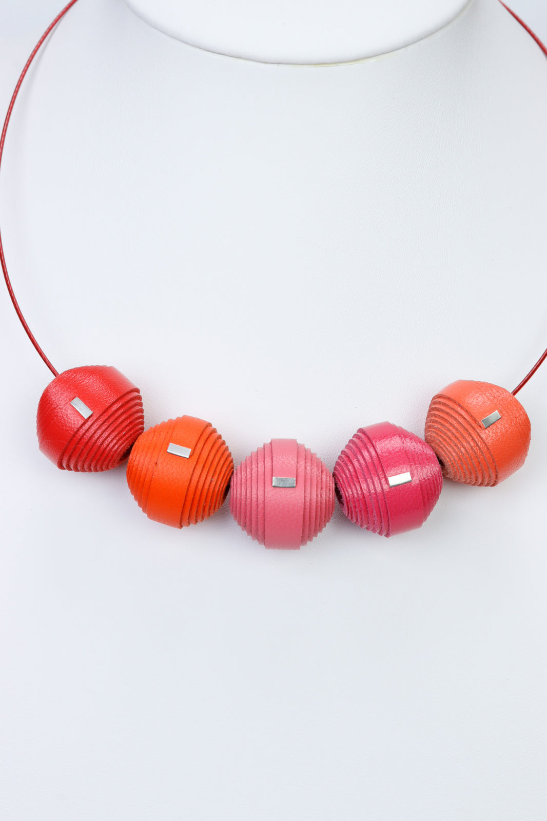 Statement artizanal. Acest colier unic, lucrat manual (Modelul 106) din colecția Leatherbonbon prezintă o compoziție curată de mărgele din piele naturală pentru o notă de eleganță contemporană.