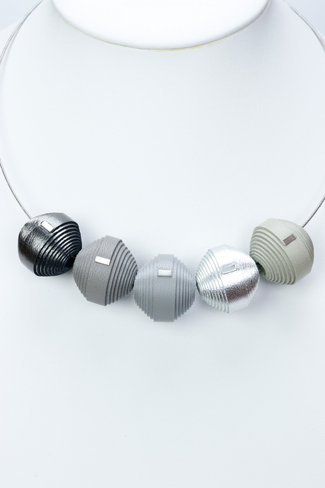 Sofisticare monocromă. Colierul "Nuanțe de Gri" (Modelul 601) este o piesă statement lucrată manual, prezentând o compoziție elegantă de mărgele din piele naturală într-o paletă versatilă de gri.