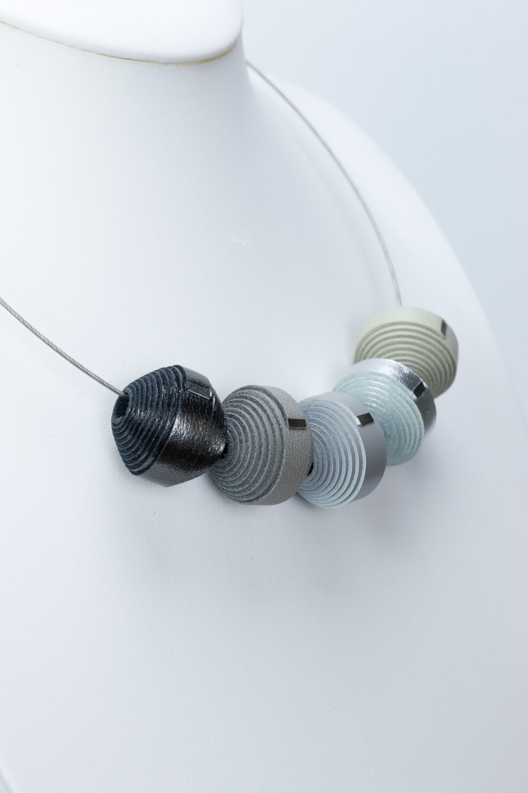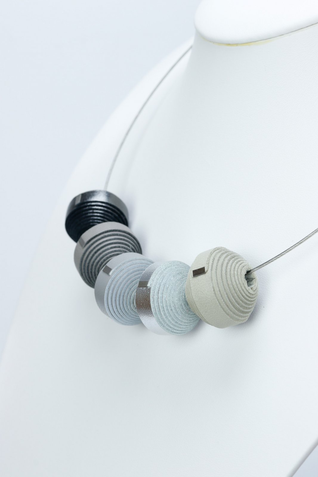 **"Explorează lumea sofisticată a monocromiei cu colierul "Nuanțe de Gri". Această piesă Leatherbonbon lucrată manual (Modelul 601) prezintă o compoziție elegantă de mărgele din piele naturală în diverse tonuri și texturi de gri. De la argintiu deschis la antracit intens, aranjamentul creează un accesoriu statement modern, versatil și șic fără efort. Perfect pentru a adăuga o notă de eleganță discretă oricărui look.Caracteristici: