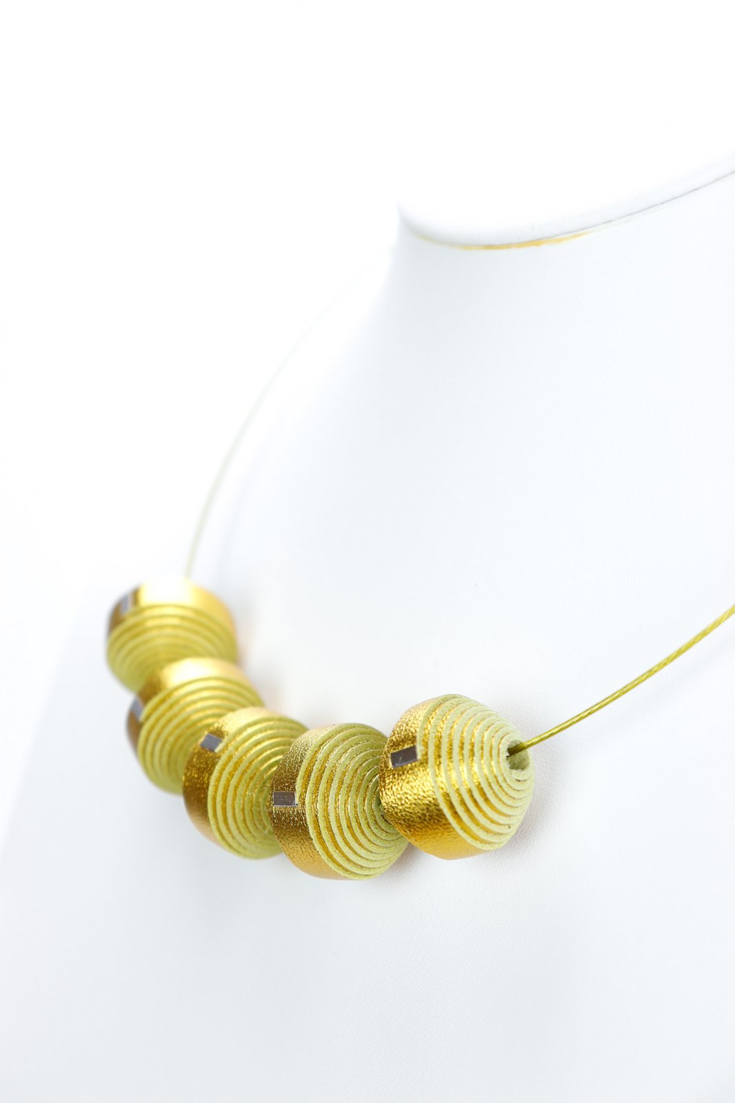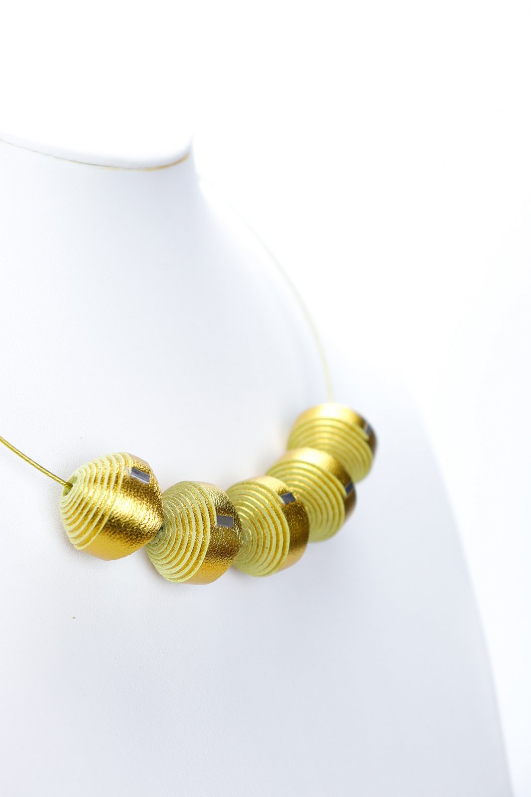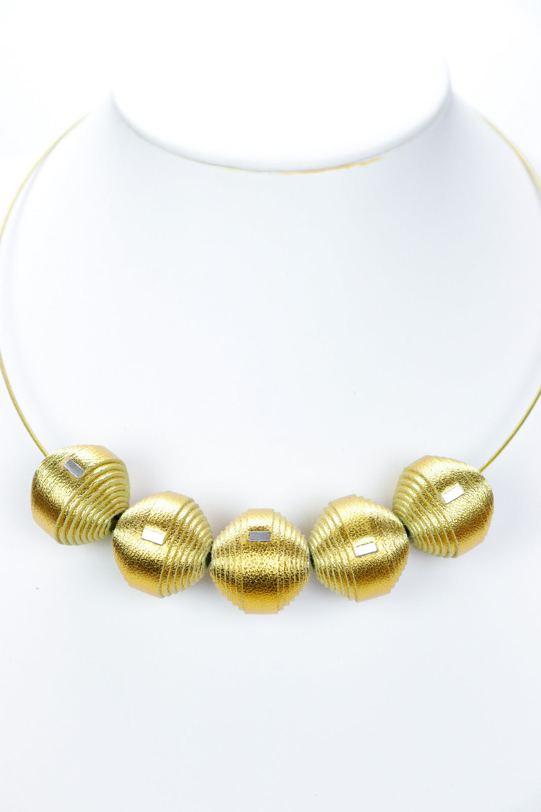 Eleganță aurie festivă. Acest colier statement lucrat manual prezintă cinci mărgele aurii din piele texturată pe o bază confortabilă, capturând perfect spiritul cald și sclipitor al sărbătorilor.