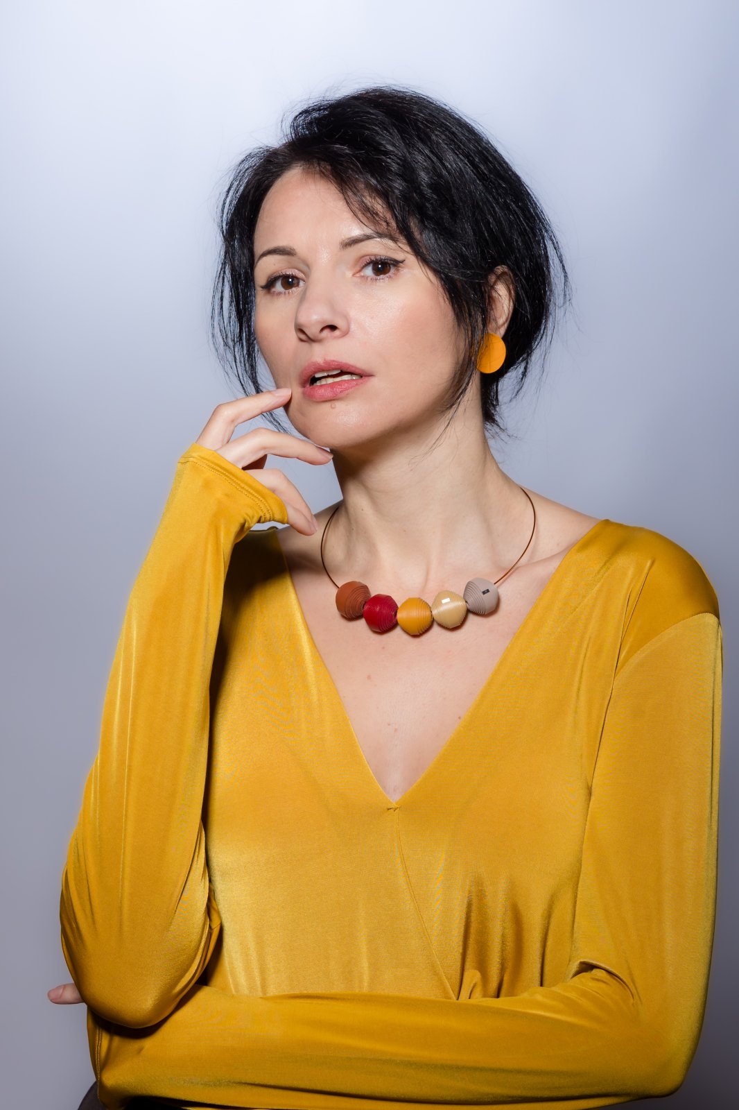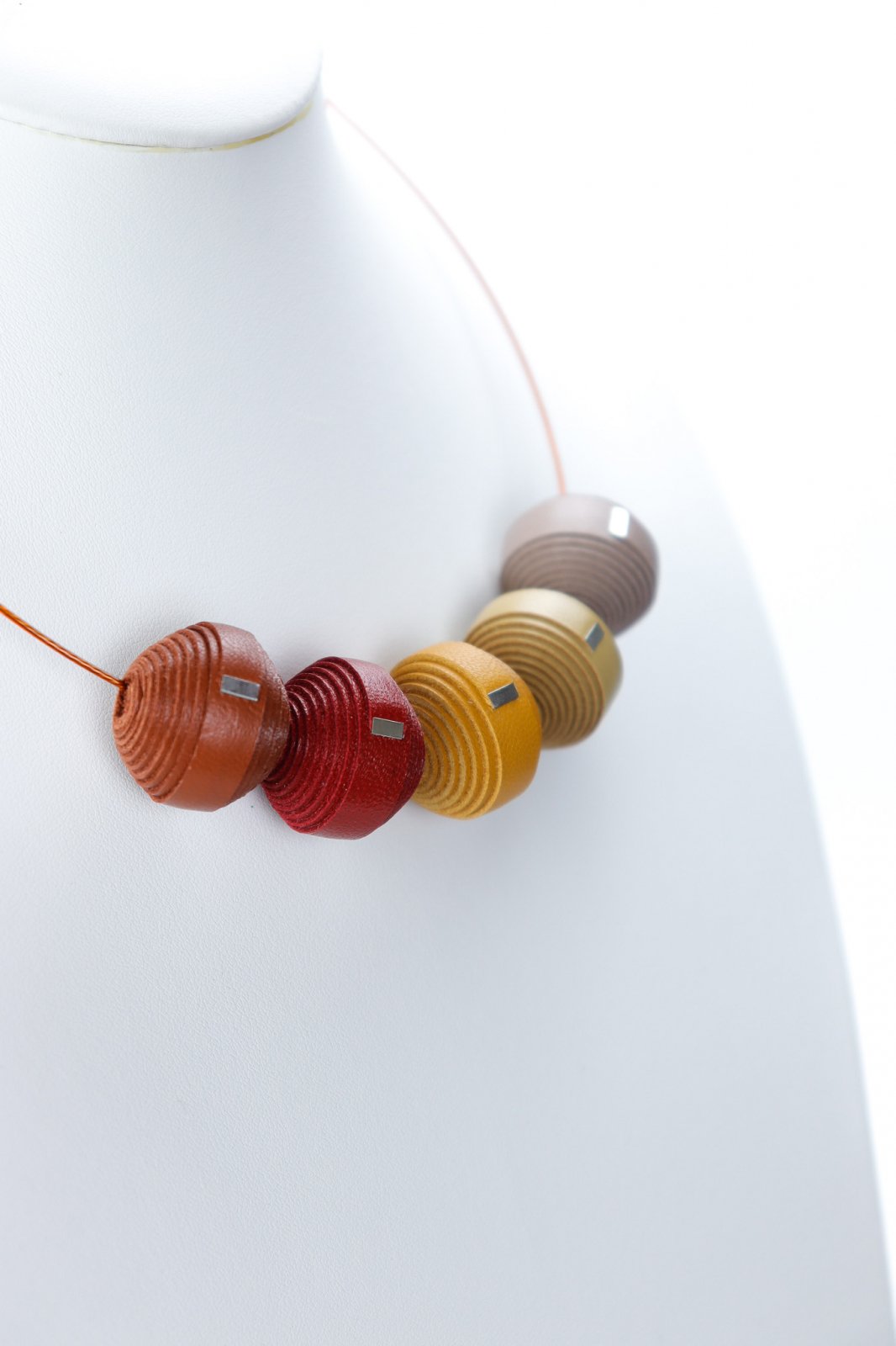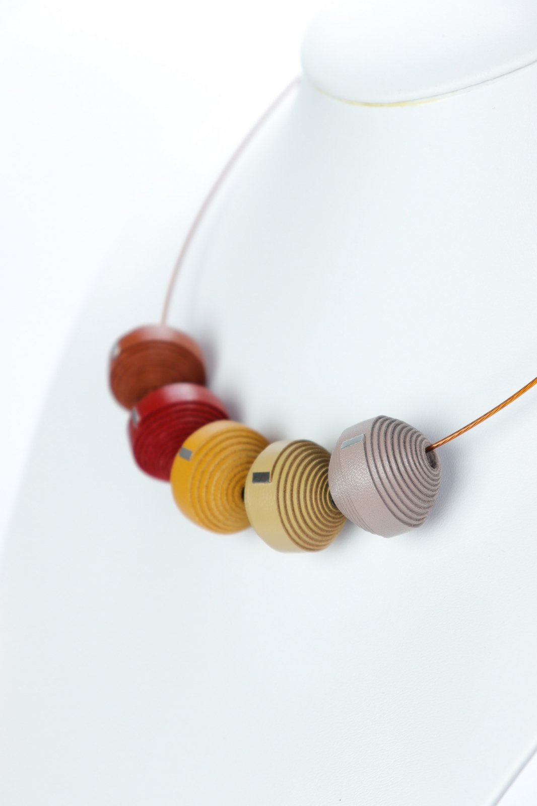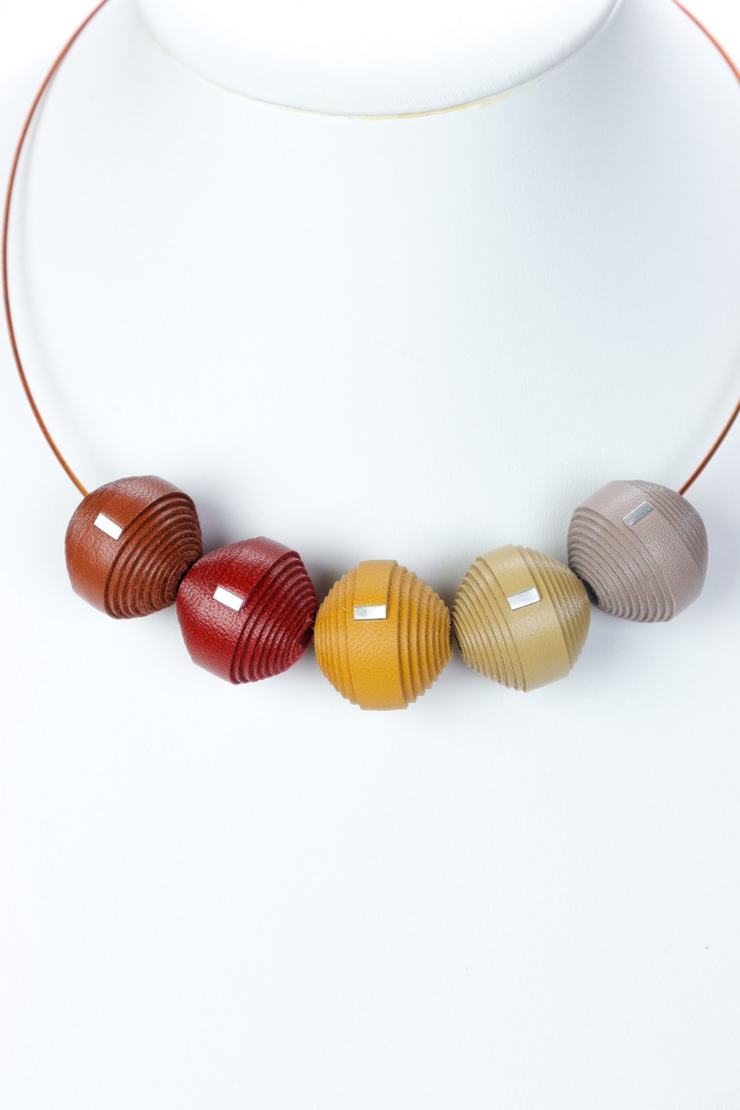 Esența toamnei. Acest colier minimalist surprinde frumusețea sezonului cu mărgele din piele lucrate manual într-o paletă caldă, armonioasă, de maro, roșu, portocaliu și galben.