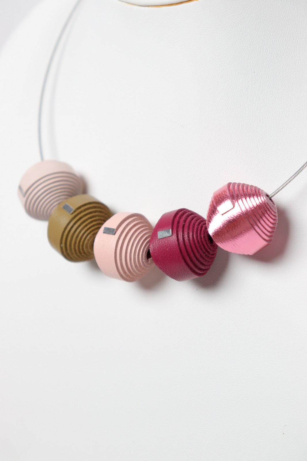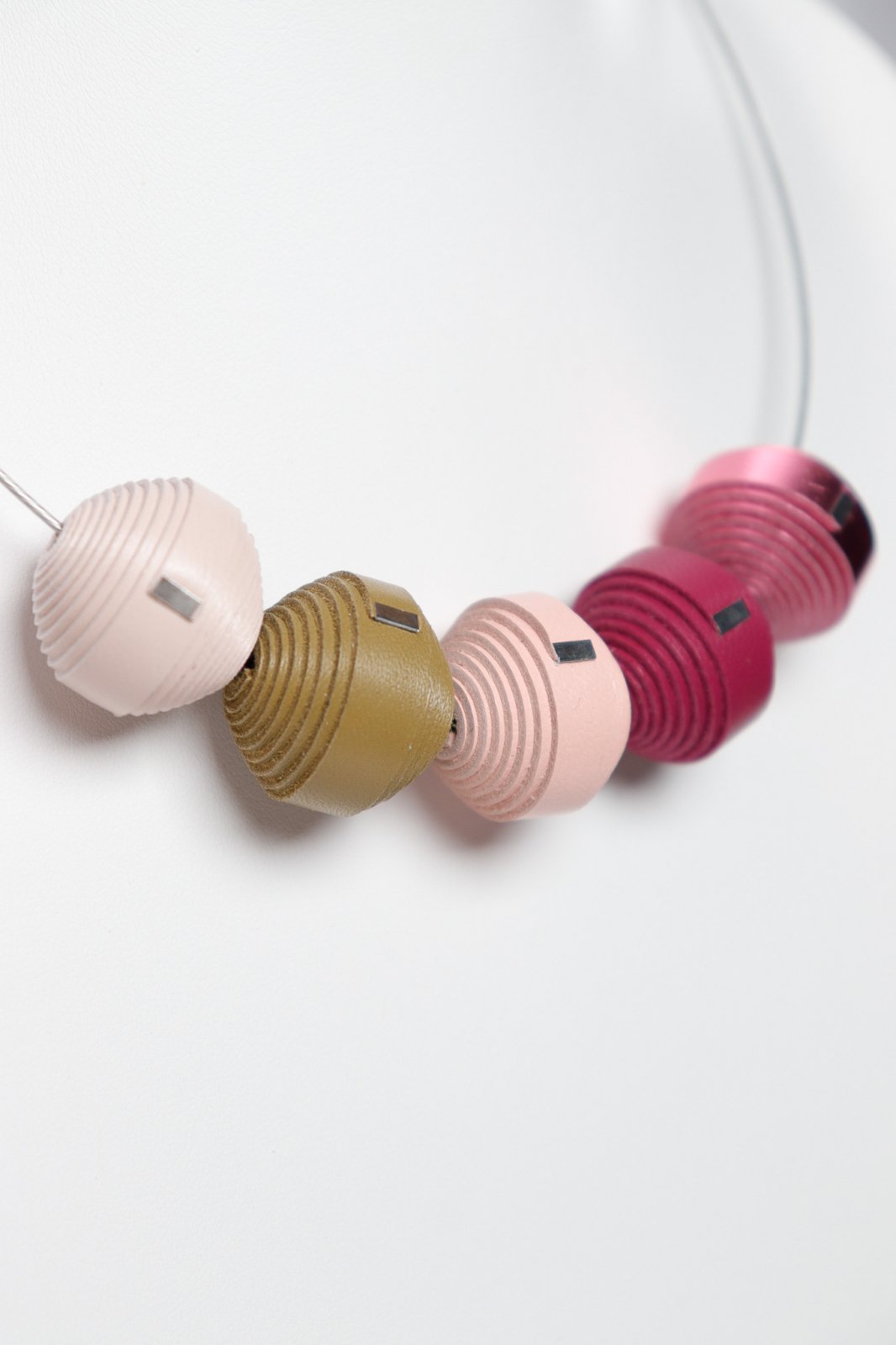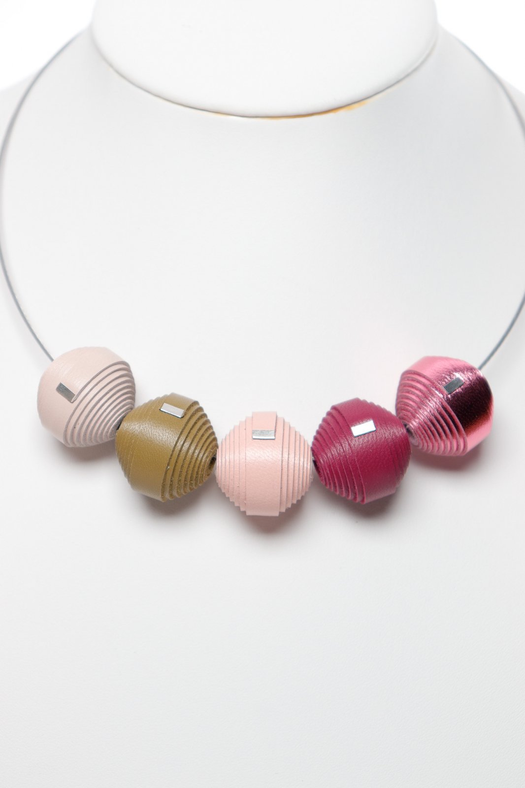 Colierul este compus din cinci mărgele Leatherbonbon, aranjate într-un gradient subtil de culori pastelate, de la roz pal la burgund. Mărgelele sunt lucrate manual din piele naturală, oferind o textură plăcută și o senzație de ușurință. Baza colierului este realizată din sârmă învelită în silicon, flexibilă și confortabilă pe piele. Sistemul de închidere tip șurub asigură o fixare sigură și discretă.