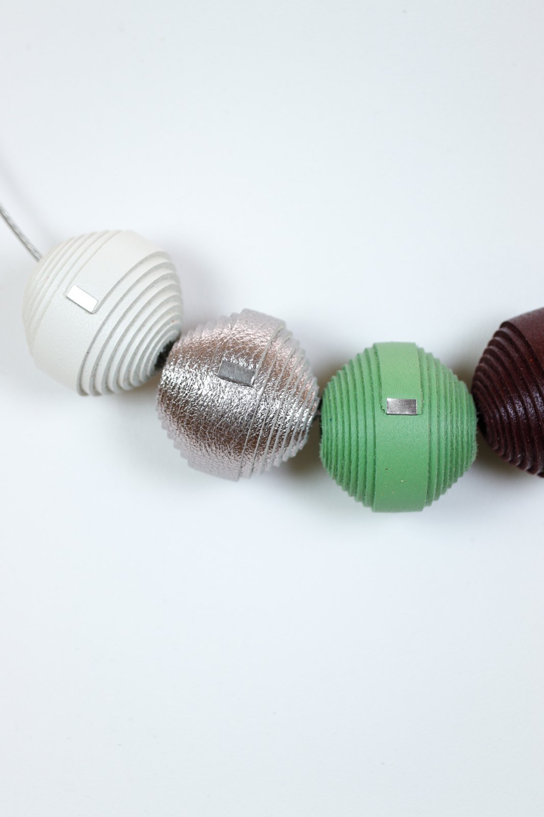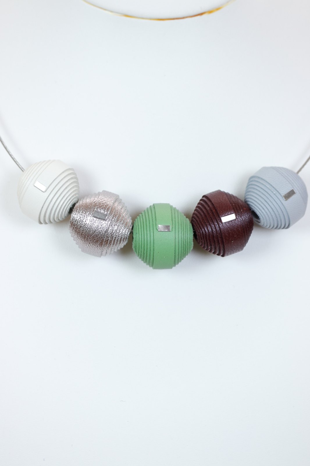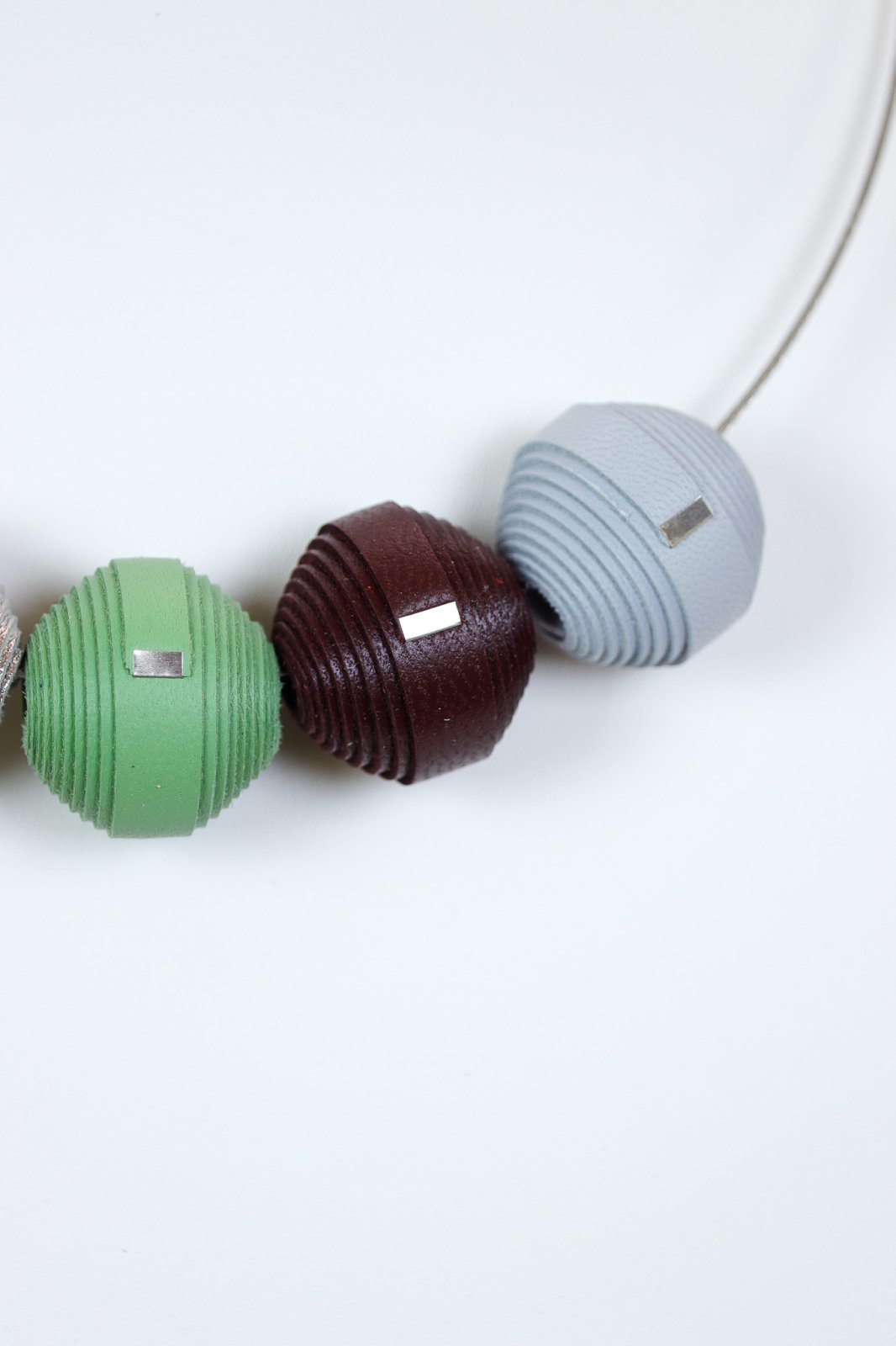 Neconvențional și original. Acest colier statement lucrat manual prezintă mărgele unice din piele într-o paletă calmă de verde, gri și bordeaux, oferind o notă modernă și versatilă de stil creativ.