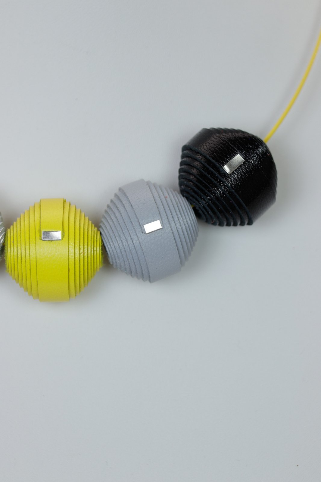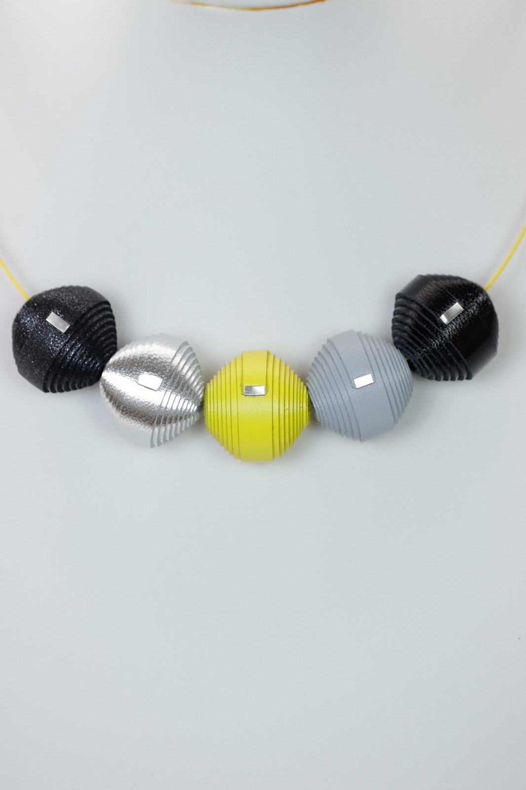 Colier lucrat manual din piele naturală cu mărgele decorative în nuanțe de negru, argintiu, galben și gri. Un accesoriu modern care îți aduce o stare de încredere și energie pozitivă.