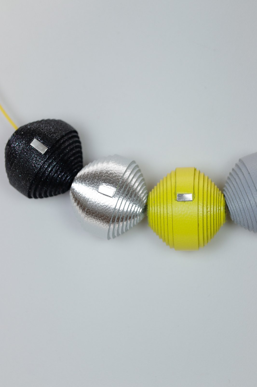 Încredere Modernă. Un colier din piele lucrat manual, ce combină neutre elegante ca negru cu sclipici și argintiu cu o pată vibrantă de galben. Un statement perfect echilibrat de stil contemporan, urban.