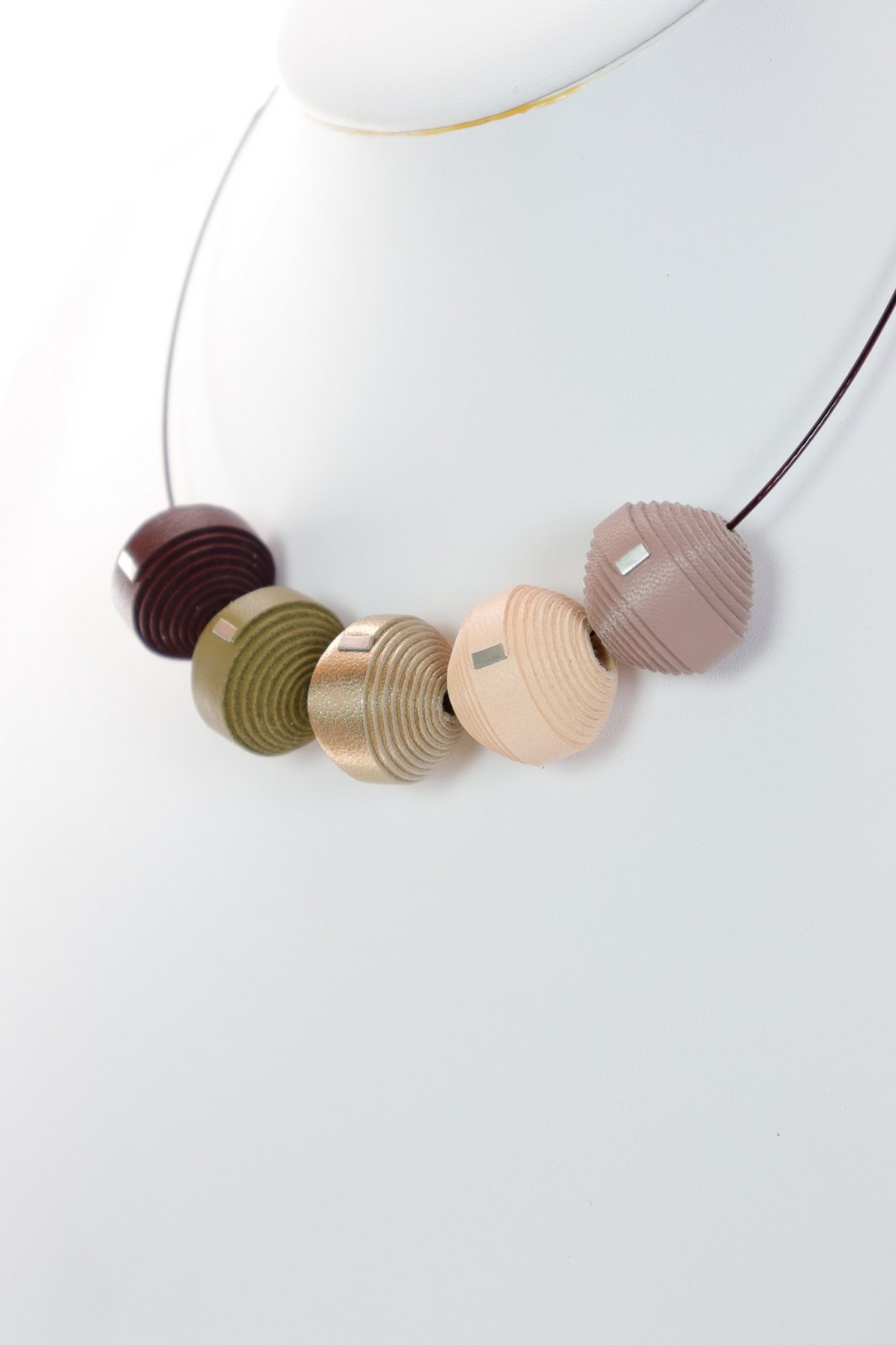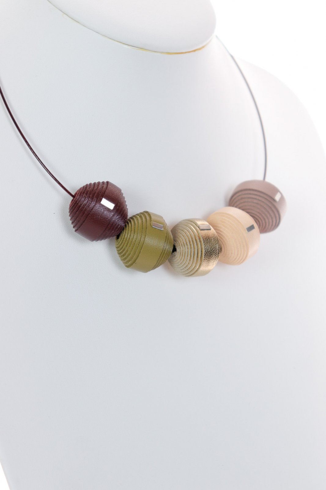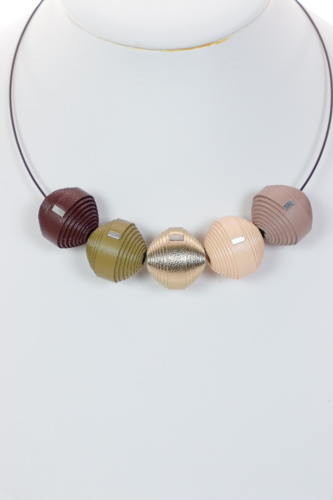 Colierul este format din cinci mărgele Leatherbonbon, aranjate într-un gradient armonios de nuanțe calde, inspirate de pământ. Mărgelele sunt lucrate manual din piele naturală, oferind o textură plăcută la atingere și o senzație de ușurință. Baza colierului este realizată din sârmă învelită în silicon, transparentă, flexibilă și confortabilă pe piele. Sistemul de închidere cu șurub și filet asigură o fixare sigură și discretă.