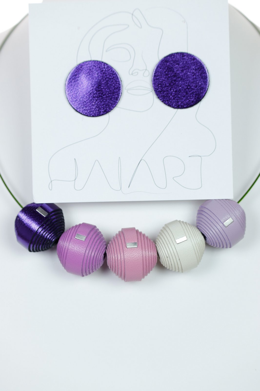 Set Leatherbonbon din piele naturală cu mărgele texturate inspirat de frumusețea unui lan de lavandă. Un ansamblu elegant care aduce o notă de liniște și rafinament oricărei ținute.