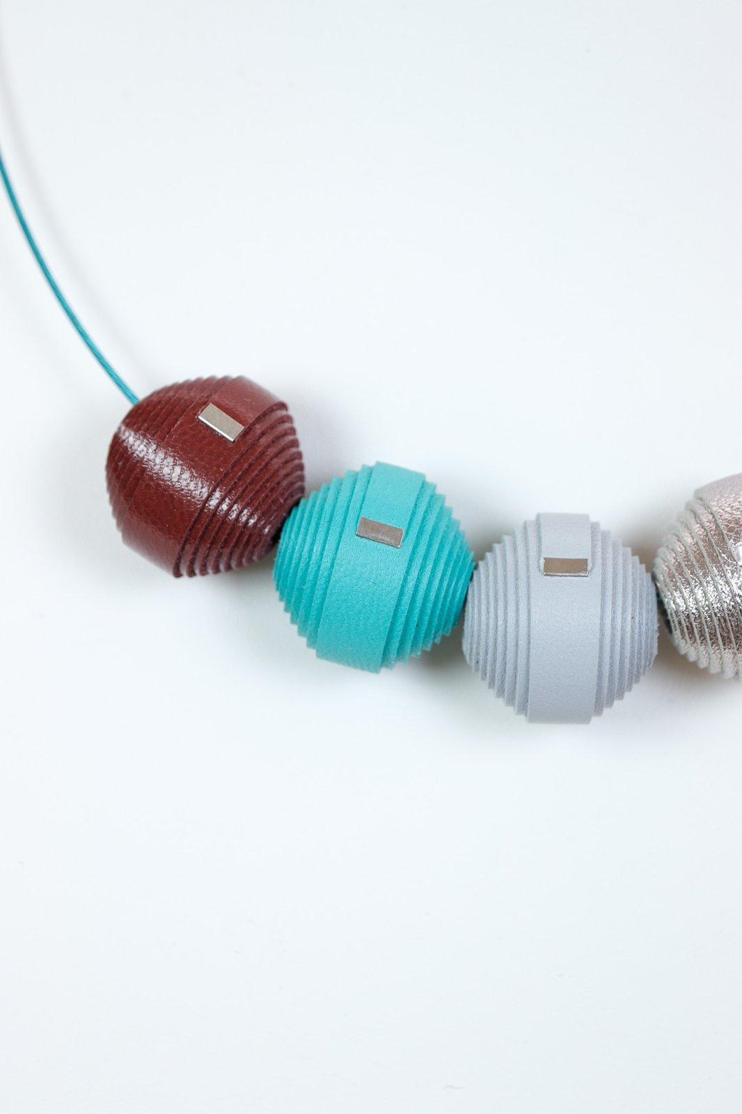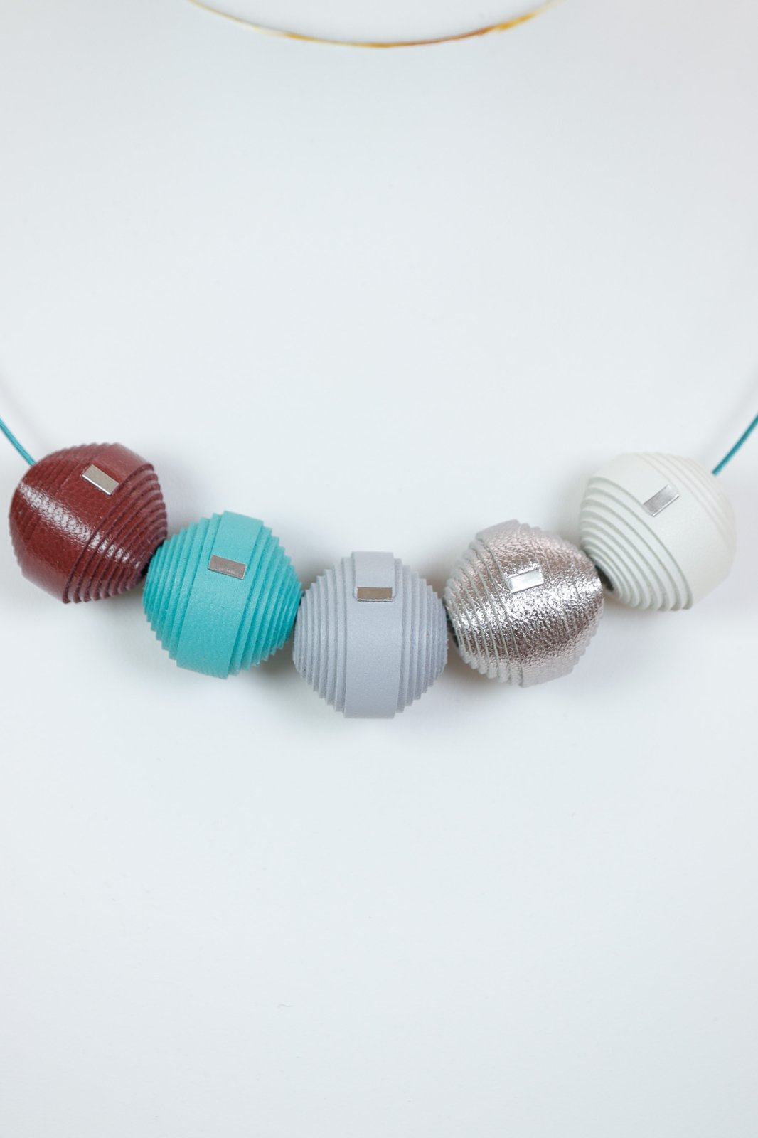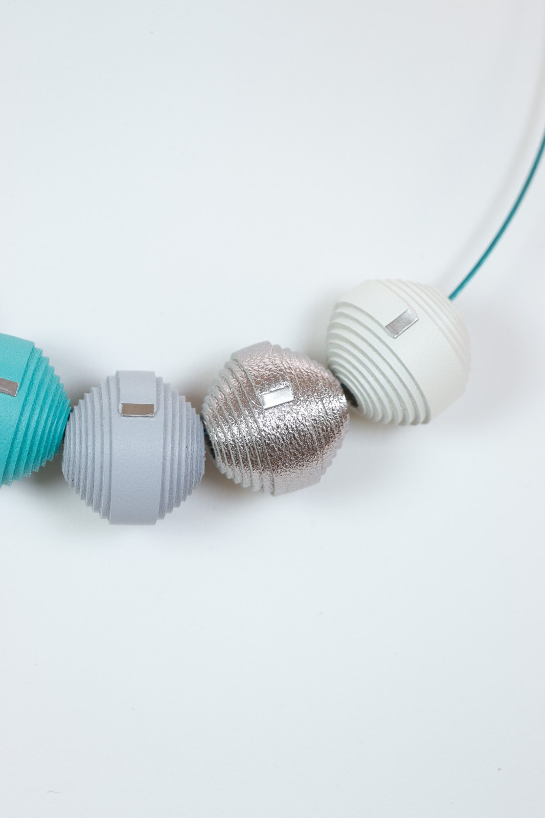 Rece și contemporan. Un colier statement modern ce prezintă mărgele din piele lucrate manual într-o paletă sofisticată de turcoaz, bleumarin, gri și bej. Esența șicului artizanal și versatil.