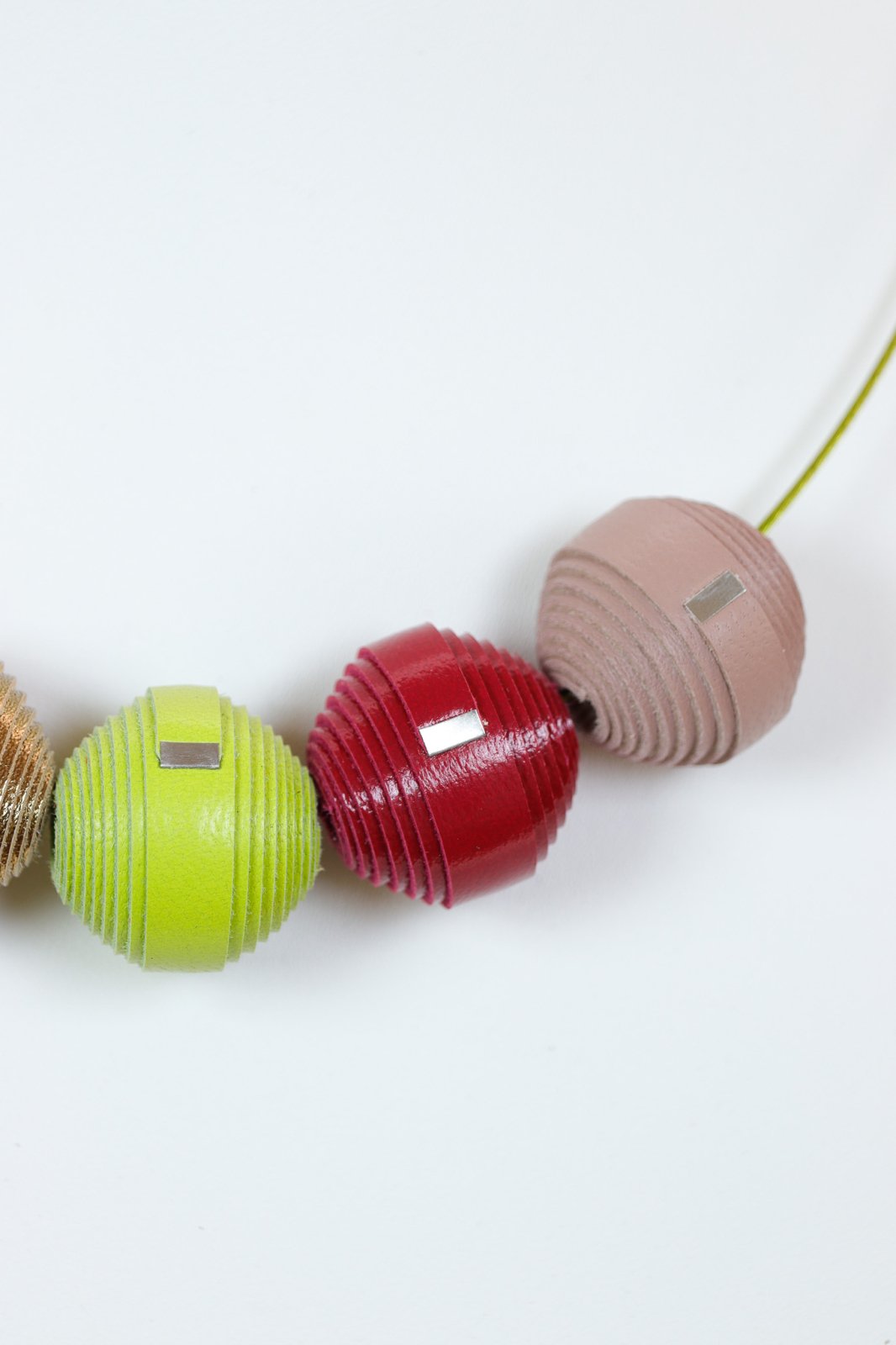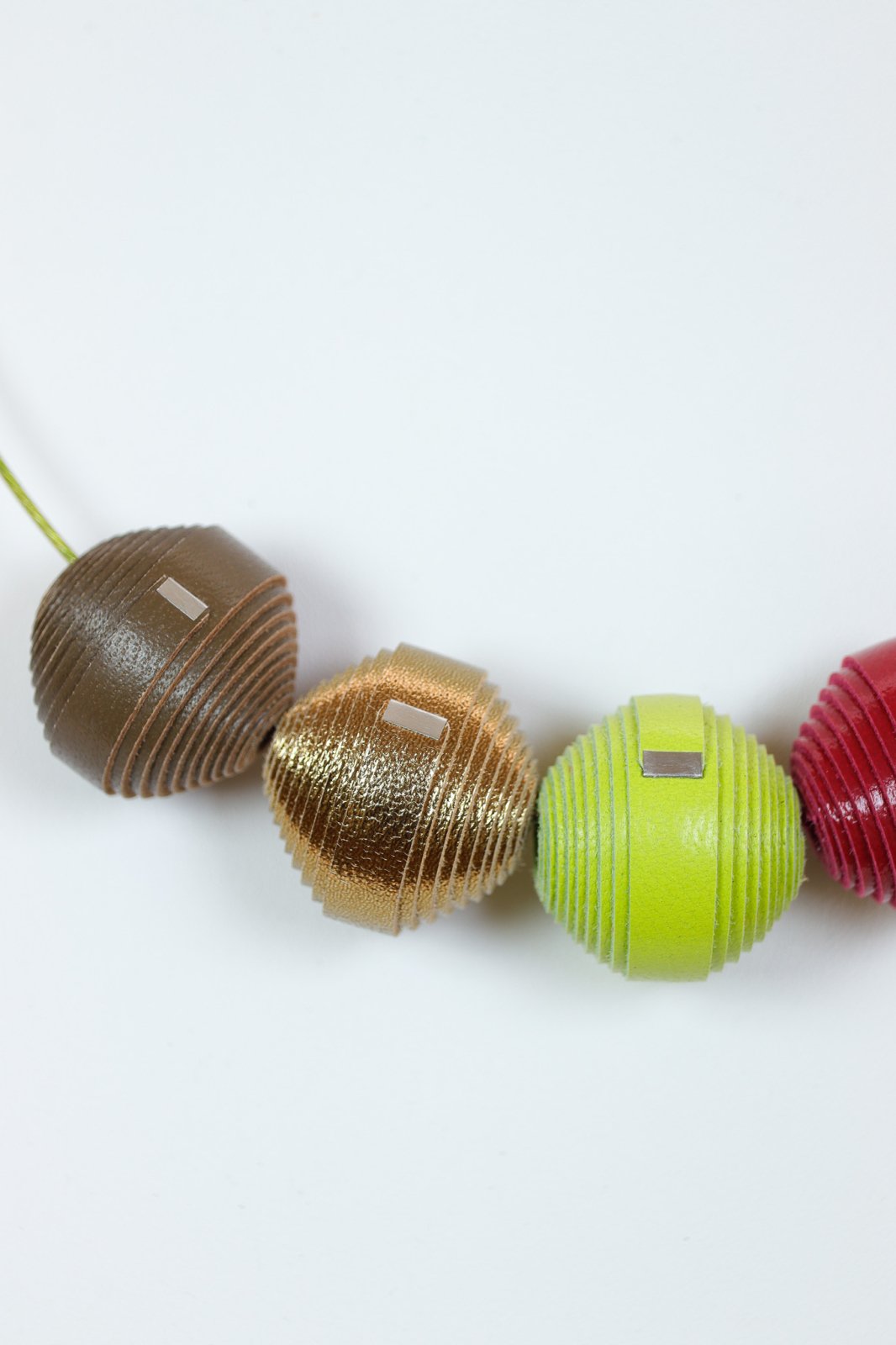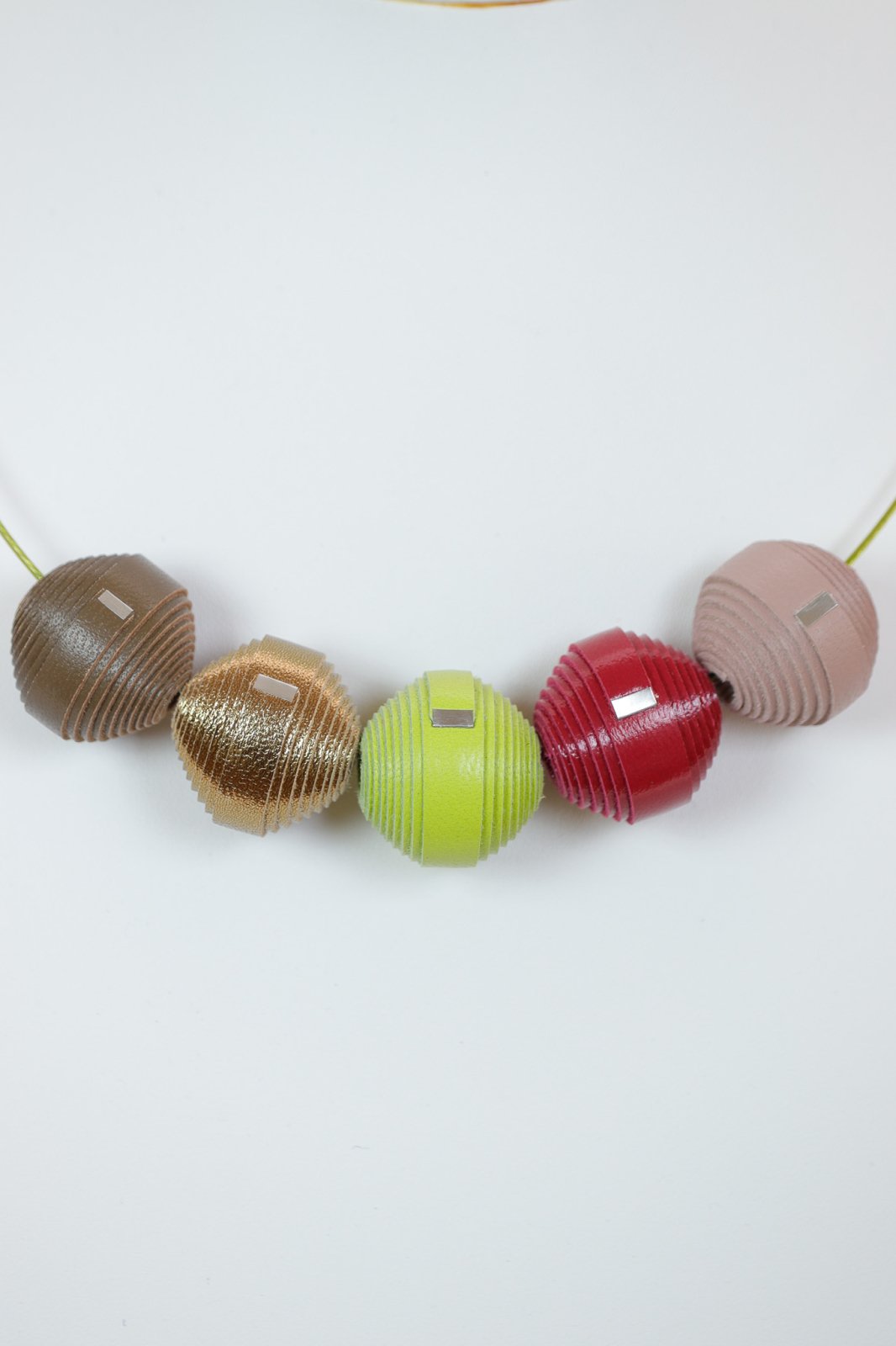 Pământiu și vibrant. Un colier unic lucrat manual ce prezintă o paletă caldă și sofisticată de mărgele din piele în maro, verde fistic, auriu și roșu. Un statement modern de eleganță naturală.