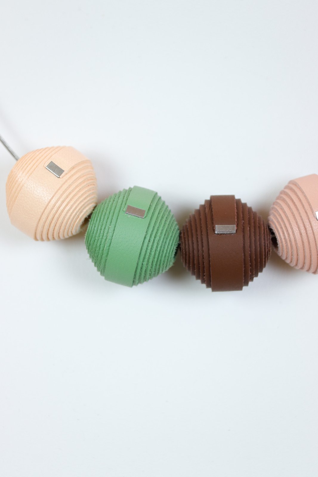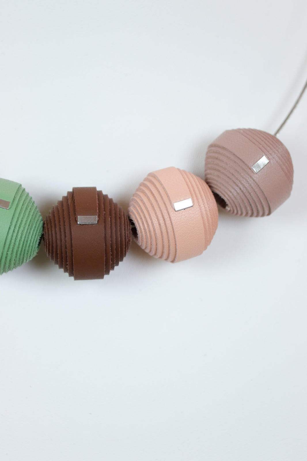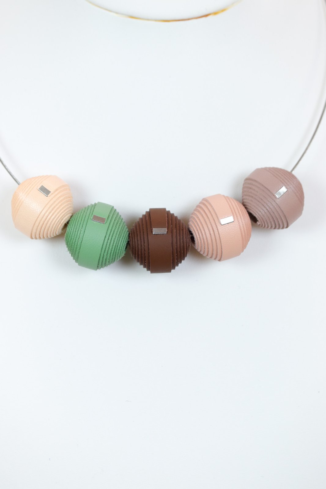 Pământiu și dulce. Un colier statement modern ce prezintă mărgele din piele lucrate manual într-o paletă caldă și plăcută de roz, verde, maro și bej. O notă unică de stil sofisticat, natural.