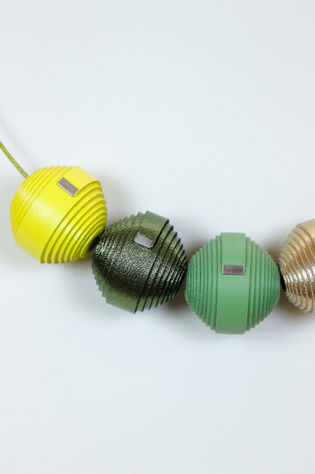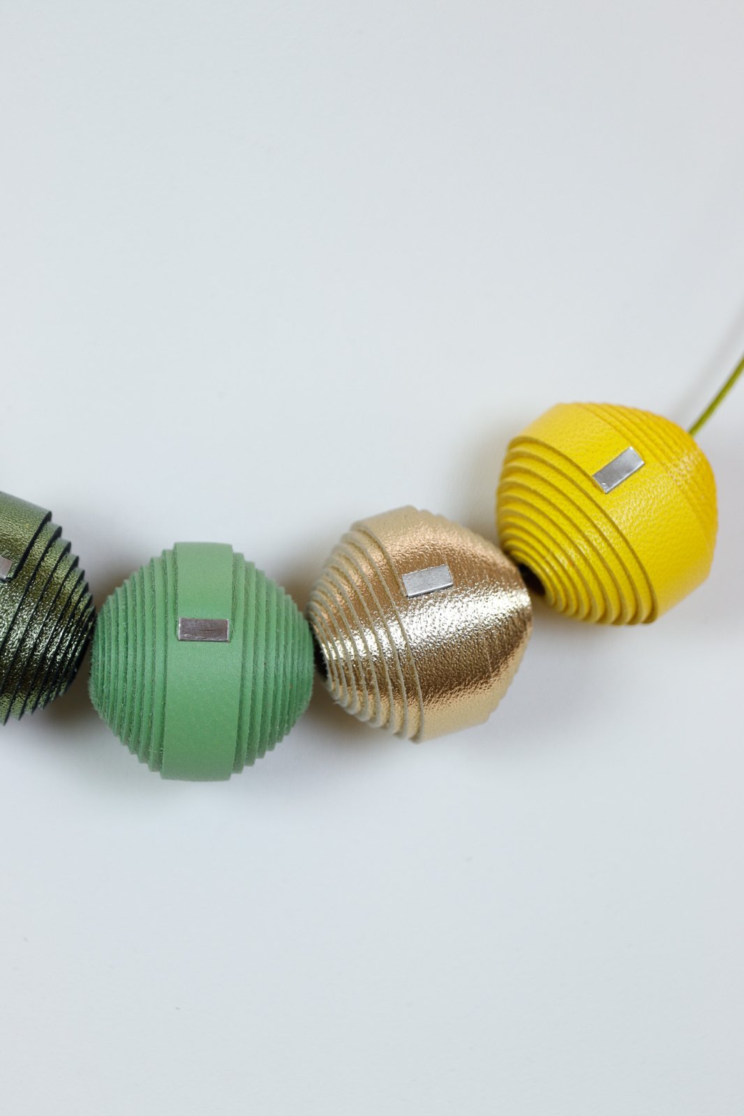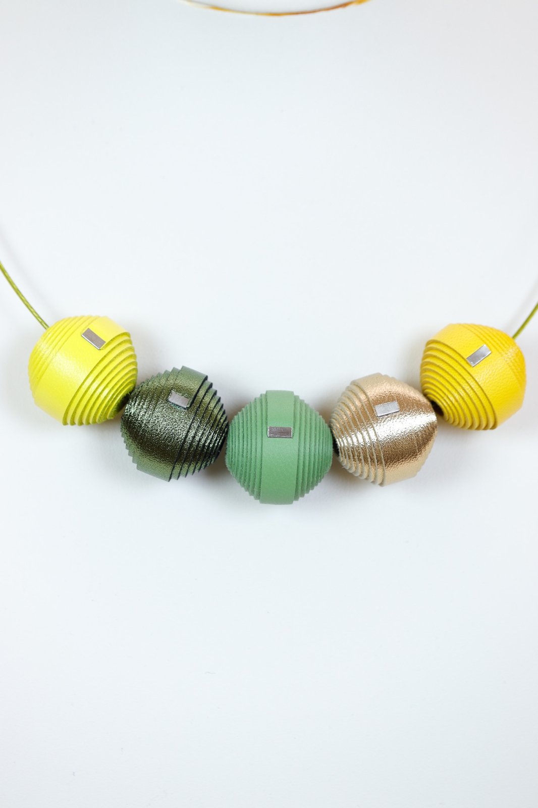 Sofisticare solară. Un colier unic lucrat manual ce prezintă o paletă caldă, vibrantă, de mărgele din piele în galben, verde și auriu. Un statement modern de eleganță creativă și versatilă.