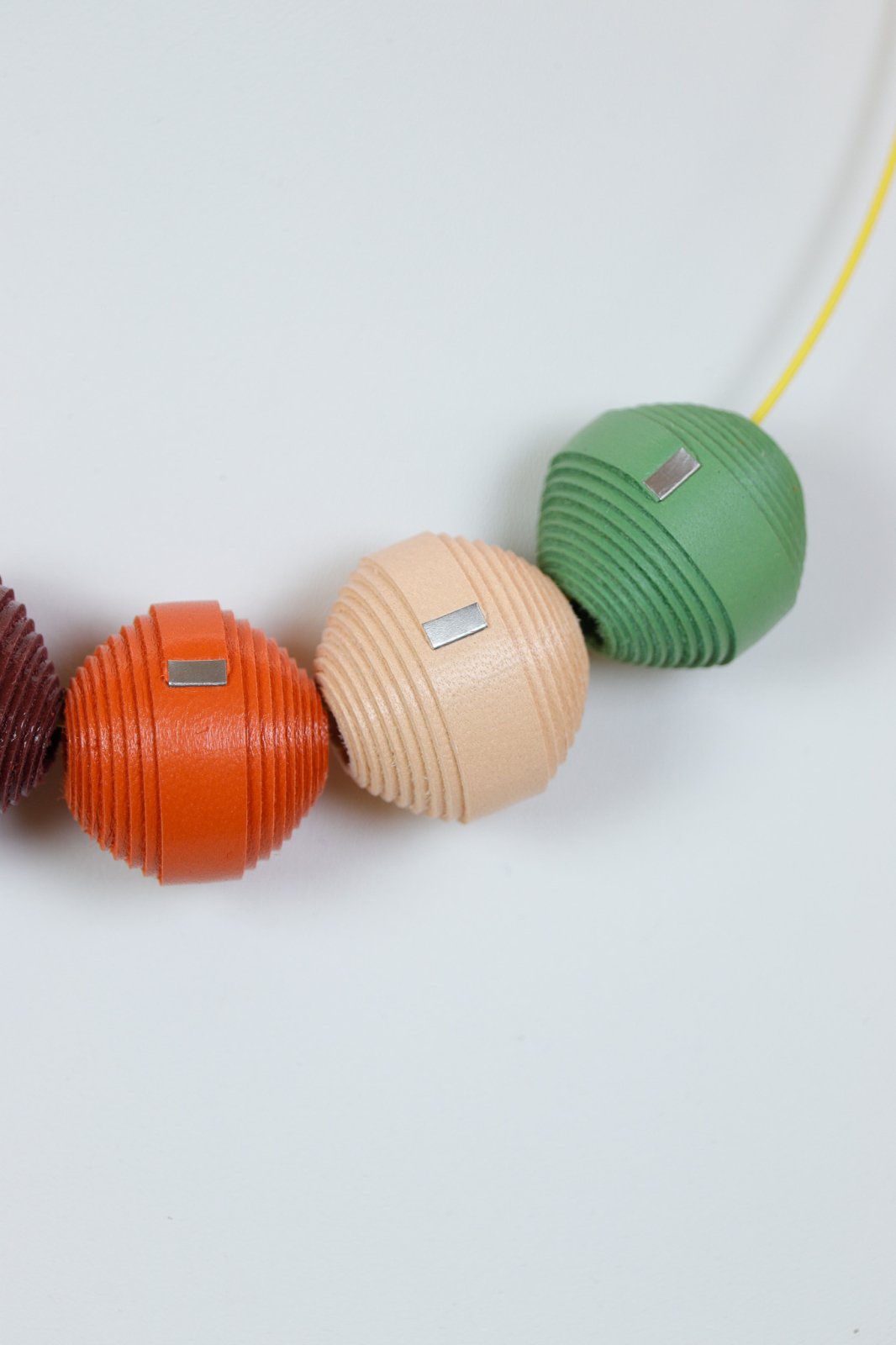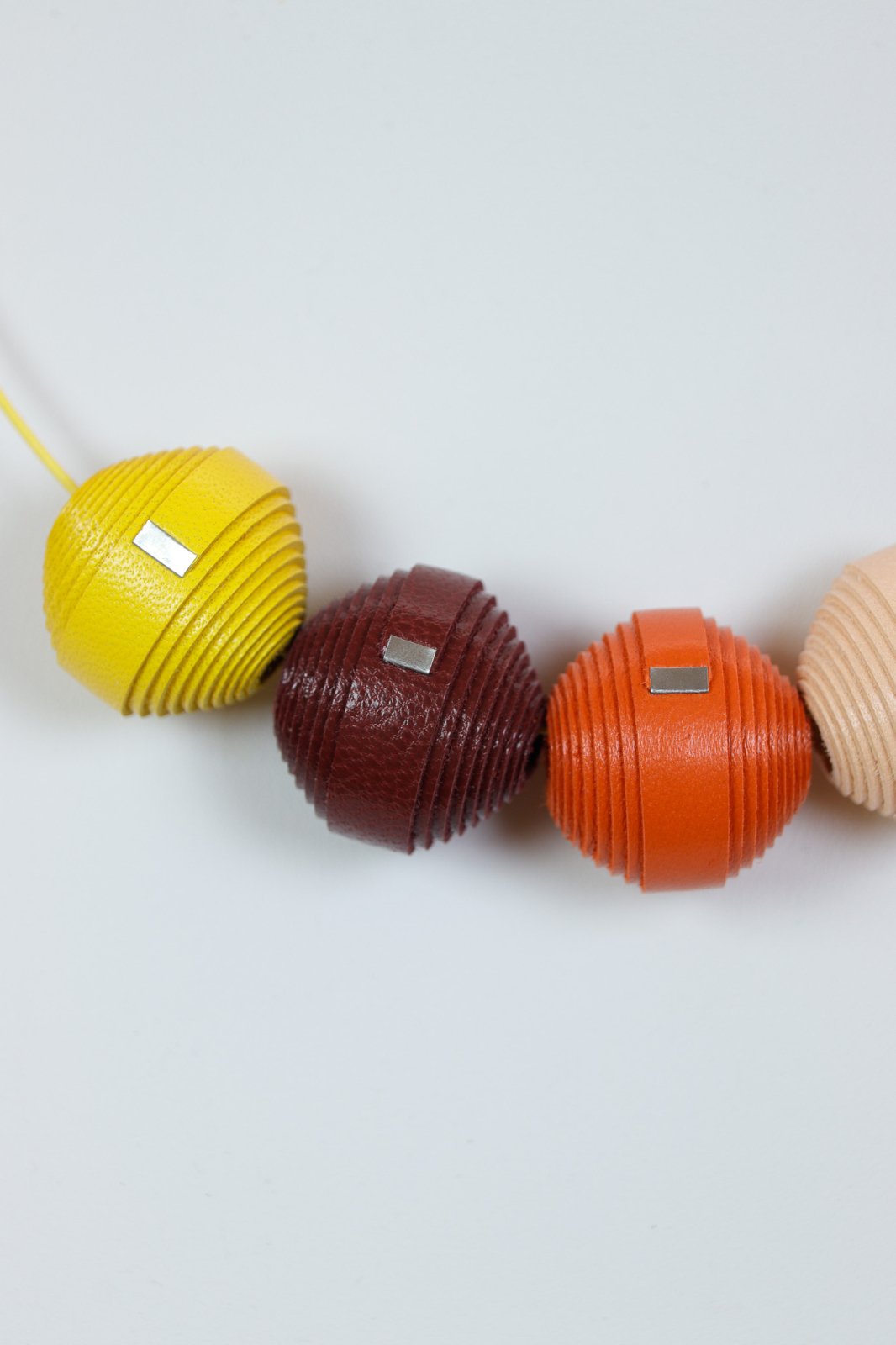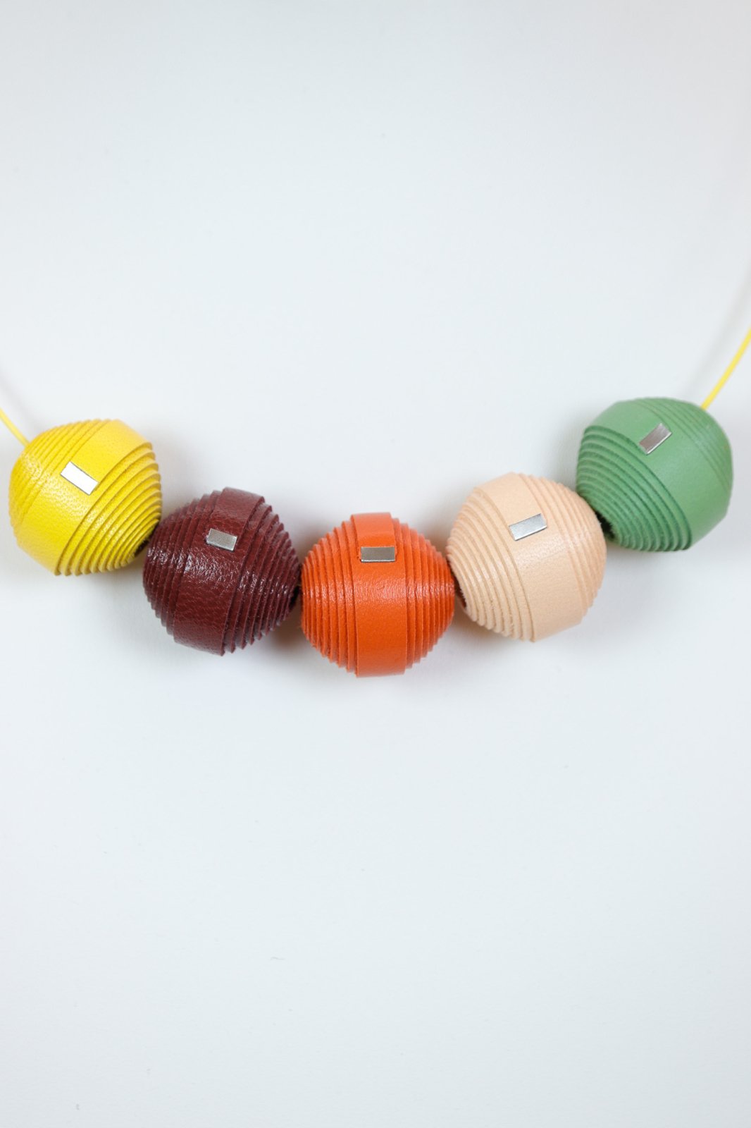 O pată de culoare. Acest colier vibrant lucrat manual prezintă un amestec jucăuș de mărgele din piele în verde mentă, maro, galben și portocaliu. Un statement unic și modern de stil creativ.