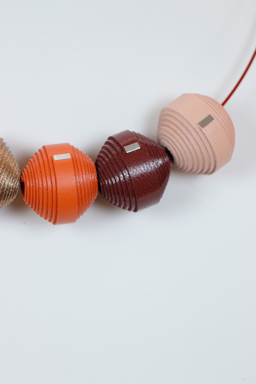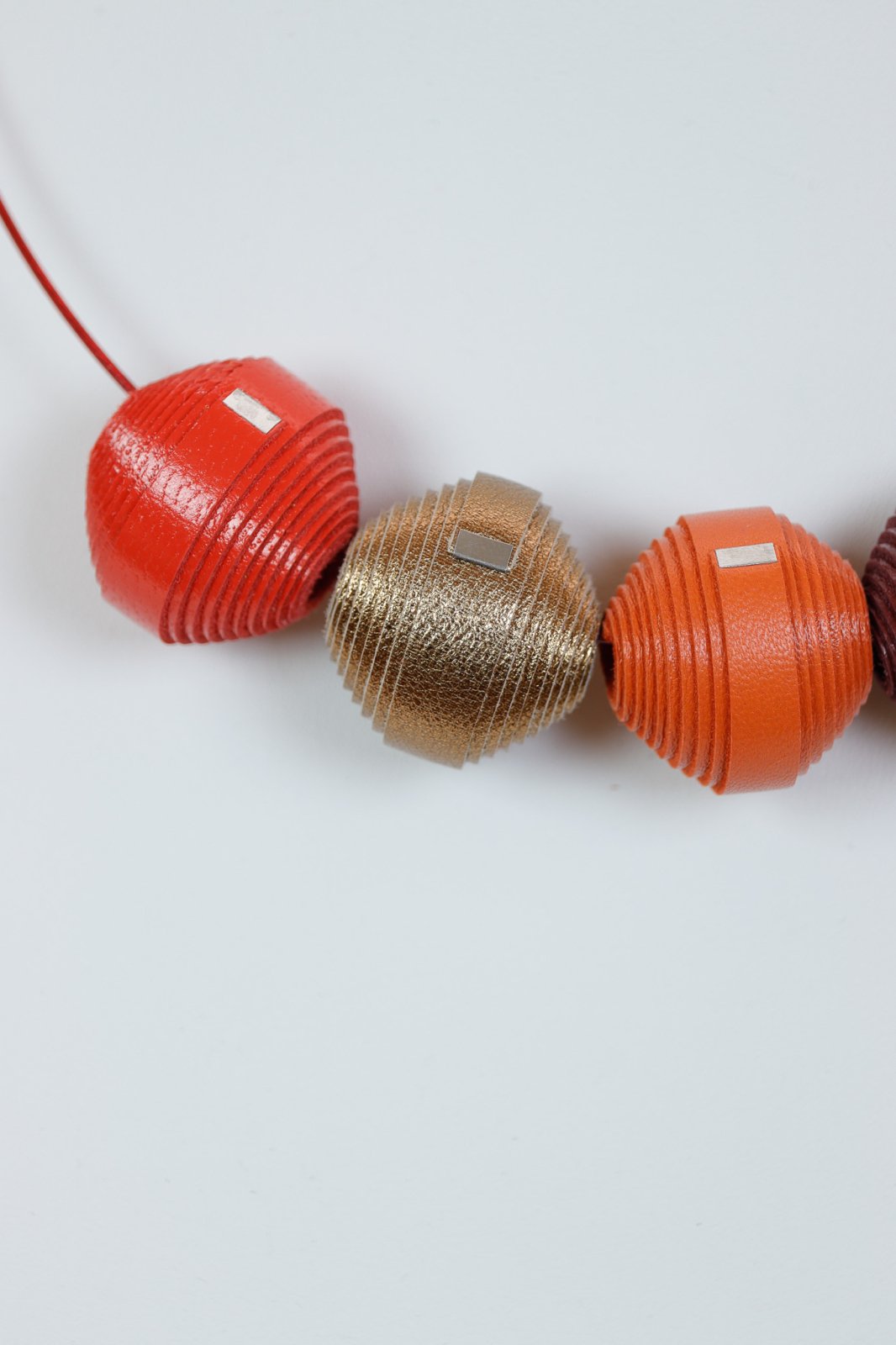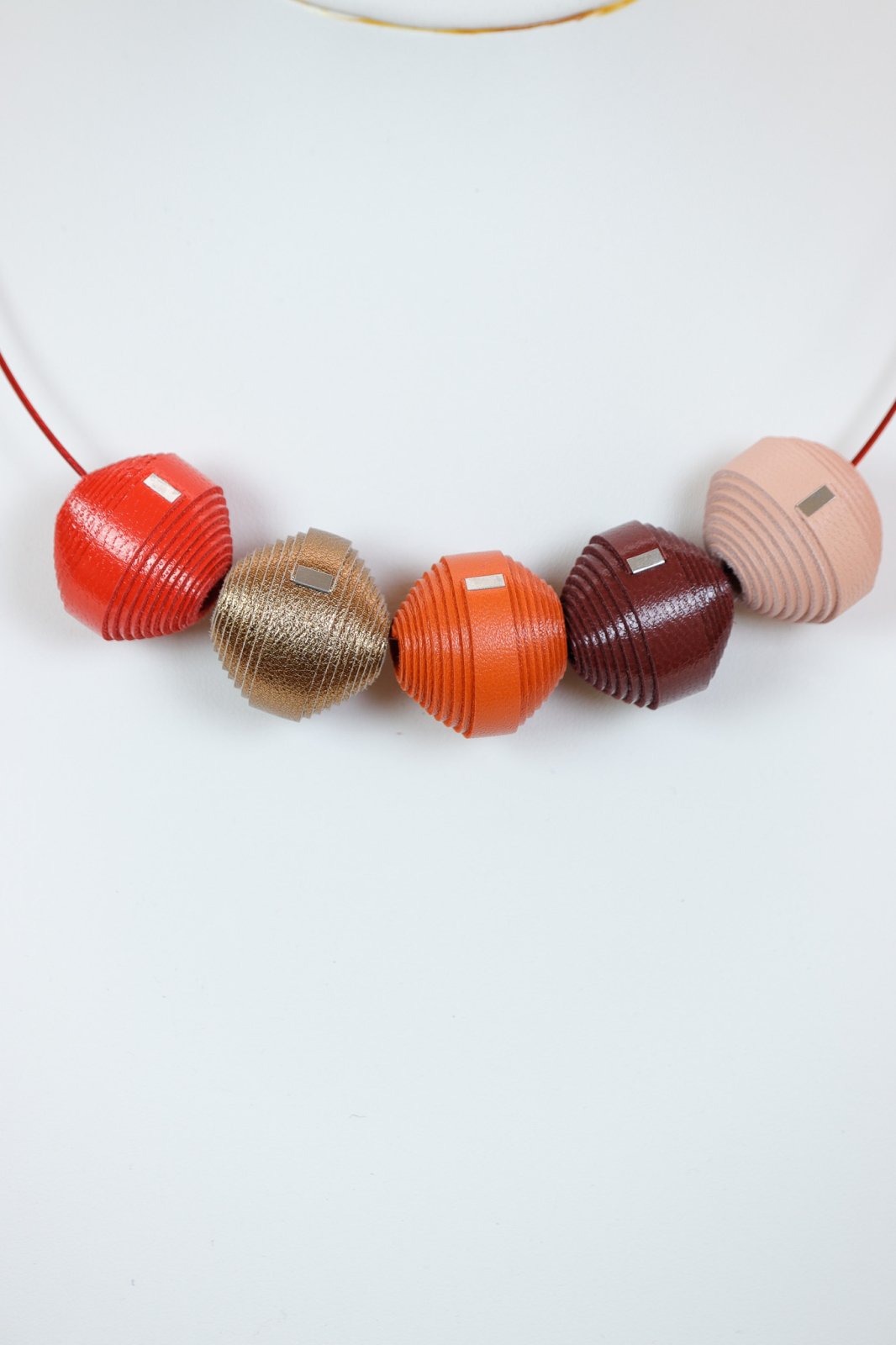 Nuanțe de apus. Un colier statement modern ce prezintă mărgele din piele lucrate manual într-o paletă caldă și sofisticată de roșu, auriu, portocaliu și bej. O notă unică de eleganță artizanală.