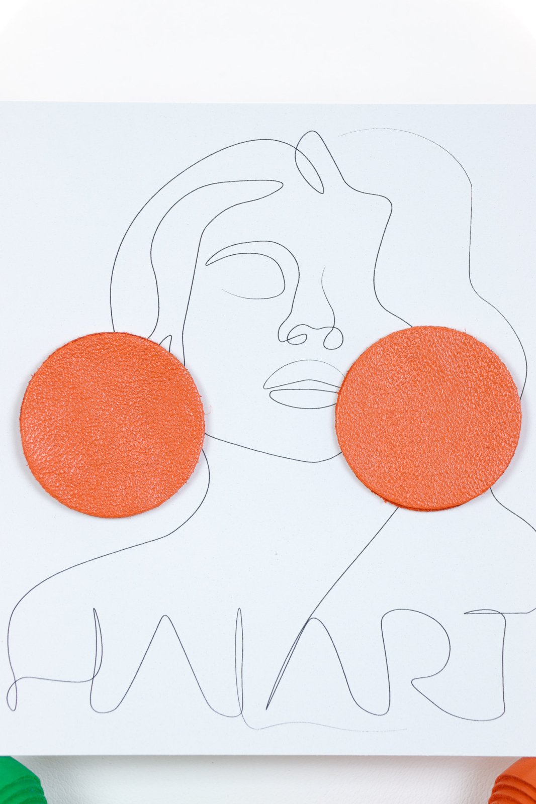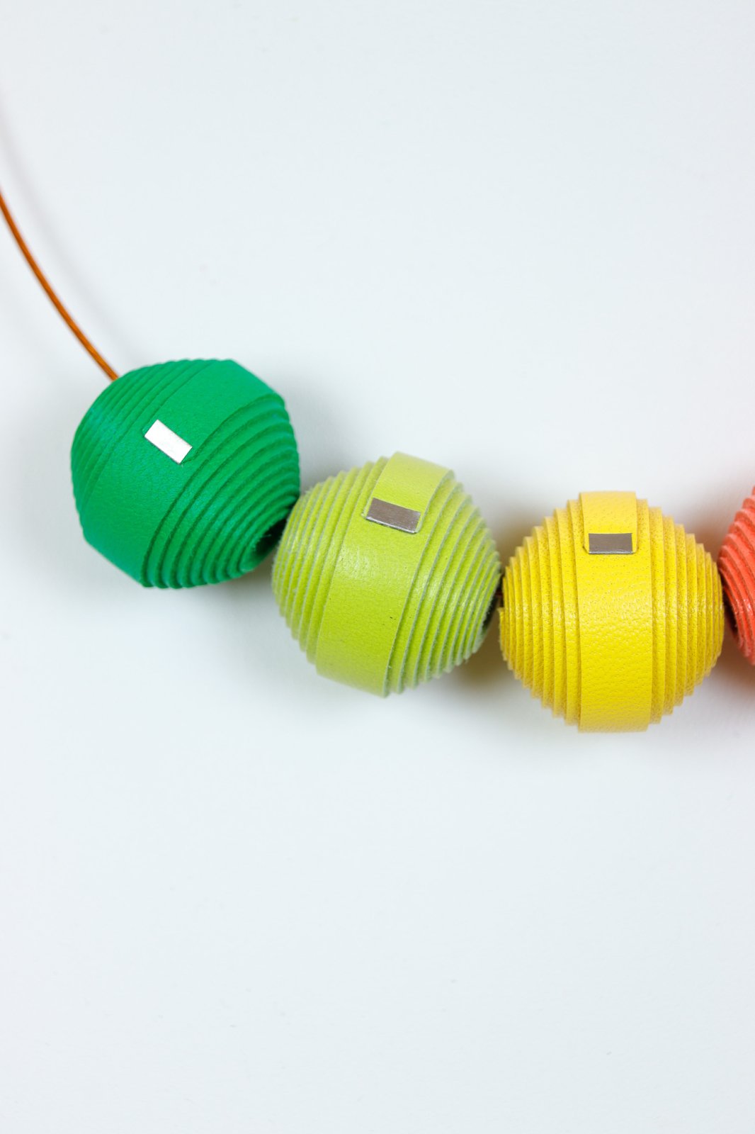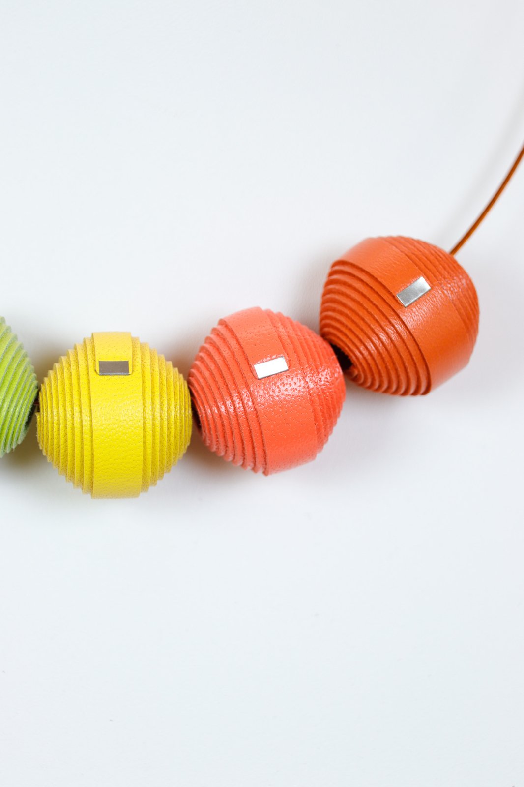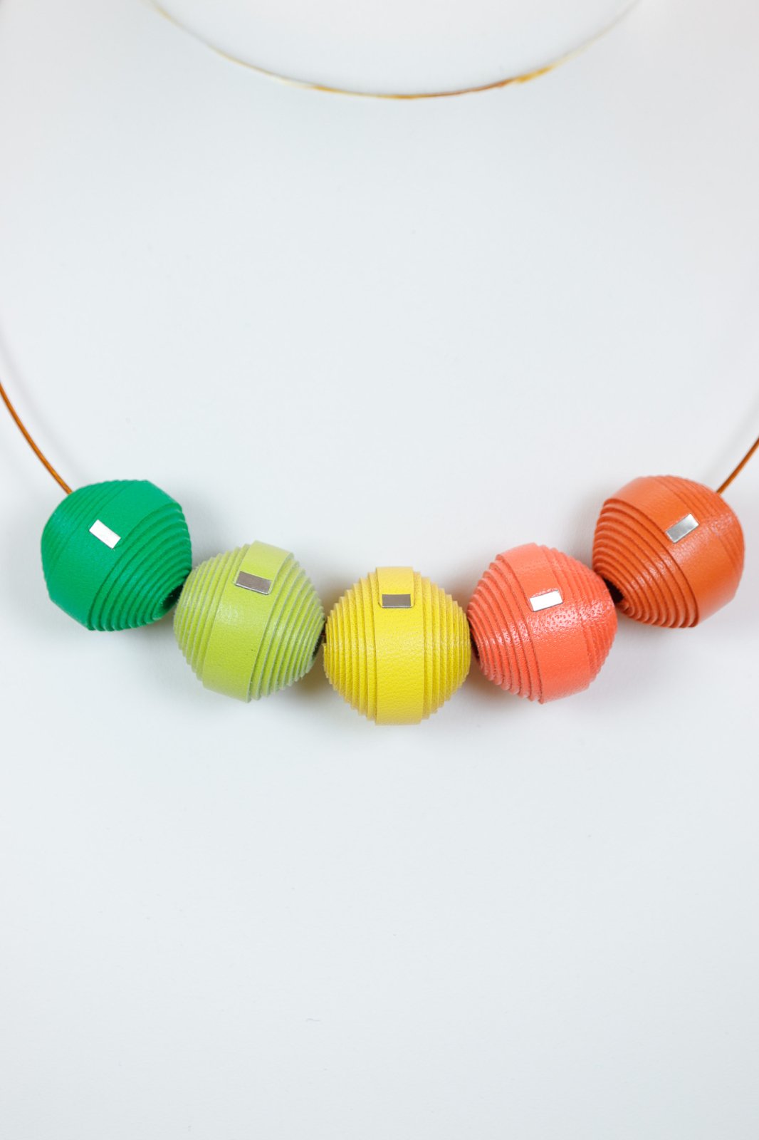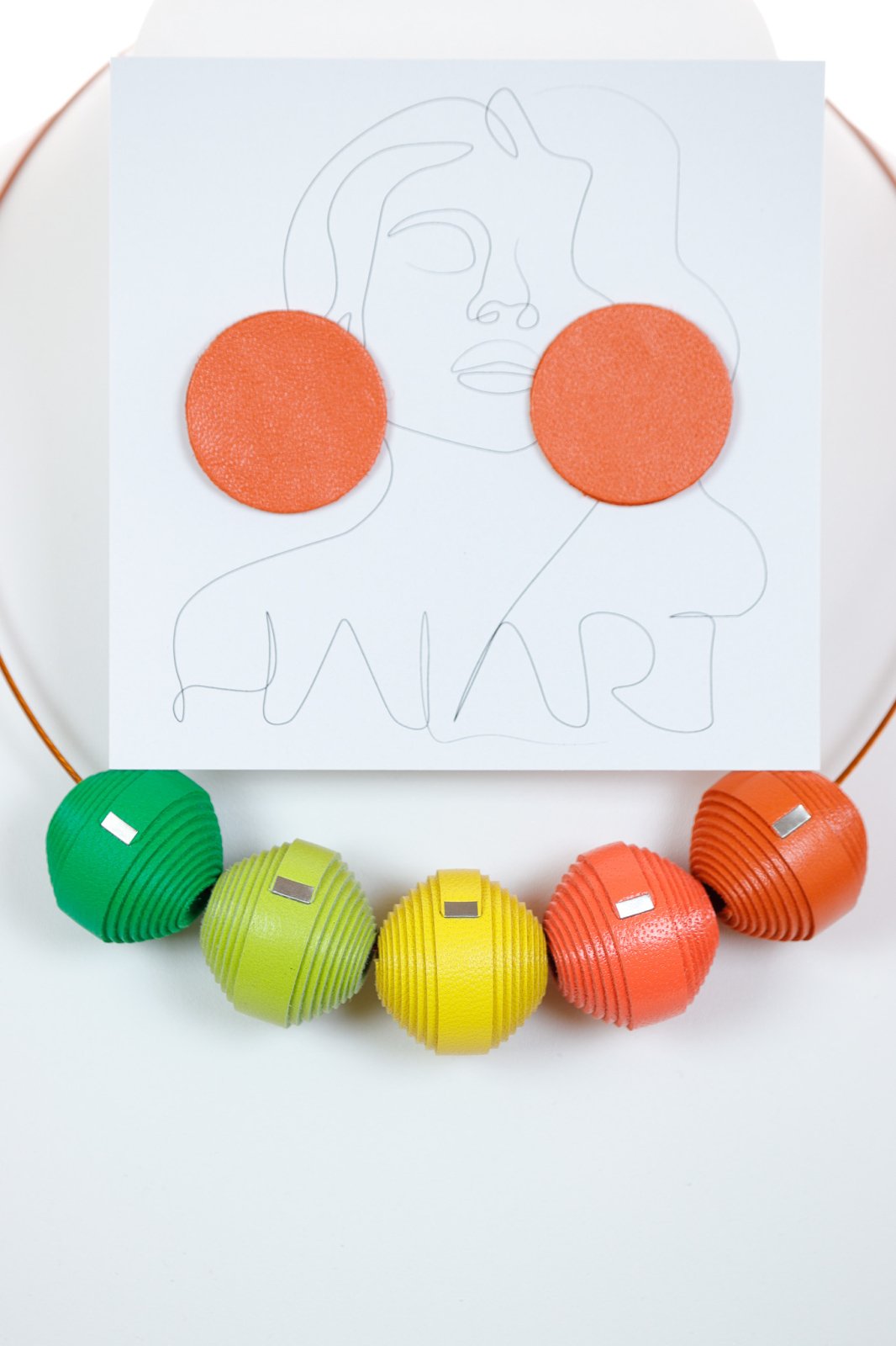 Set vibrant și coordonat. Un colier statement modern, lucrat manual, ce prezintă o paletă vibrantă de mărgele din piele în verde, lime, galben și portocaliu. Completat cu cercei stud asortați, pentru un look plin de energie.