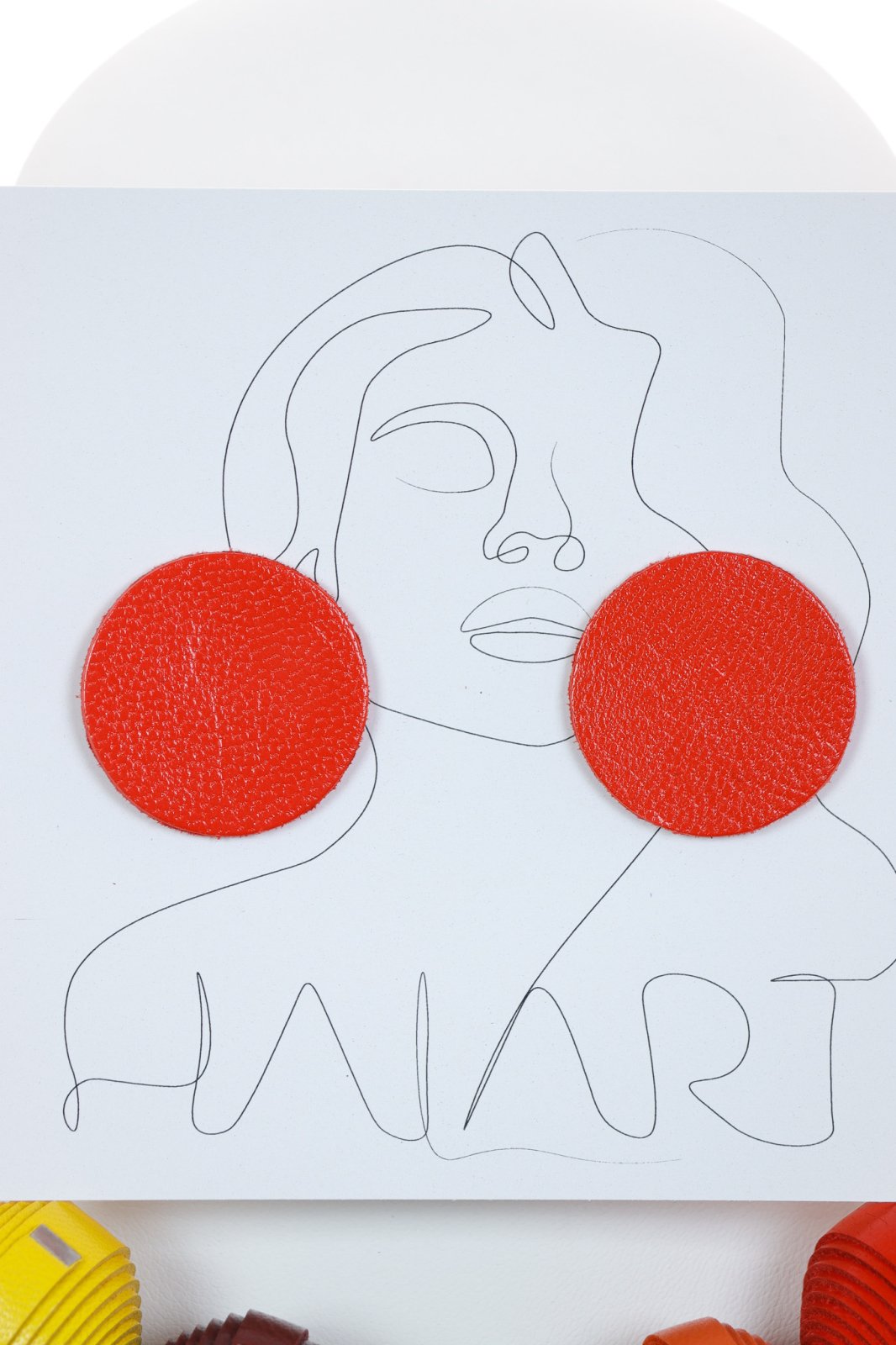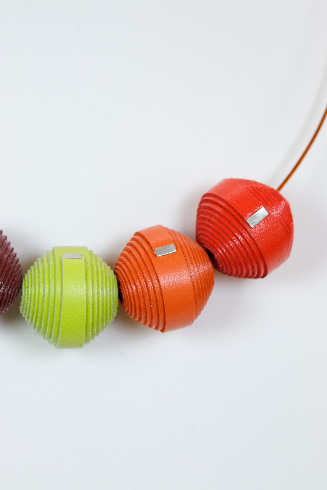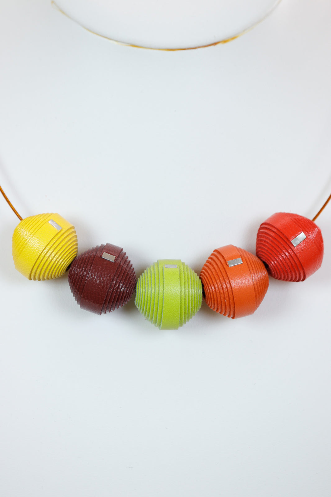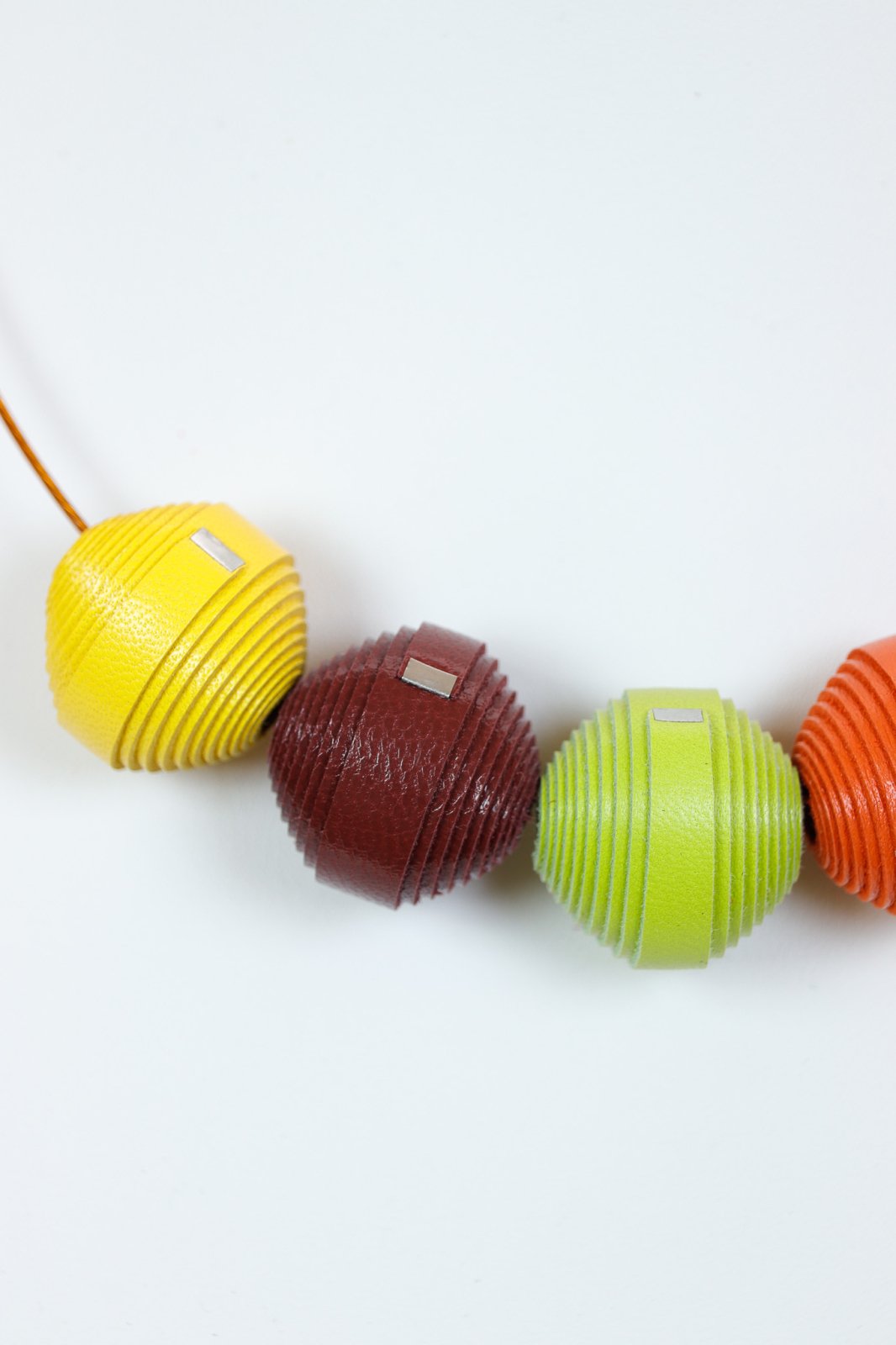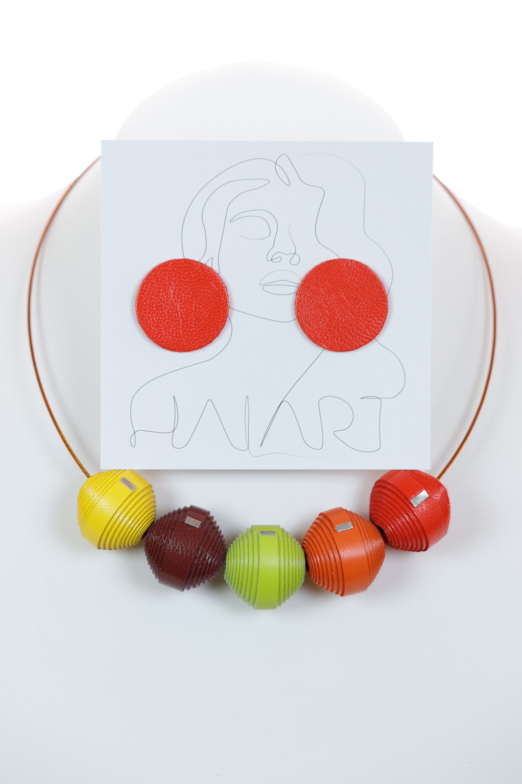 Vibrant și coordonat. Acest set lucrat manual prezintă un colier statement cu mărgele din piele într-o paletă vibrantă de galben, maro și roșu, asortat cu cercei potriviți pentru un look complet, modern.