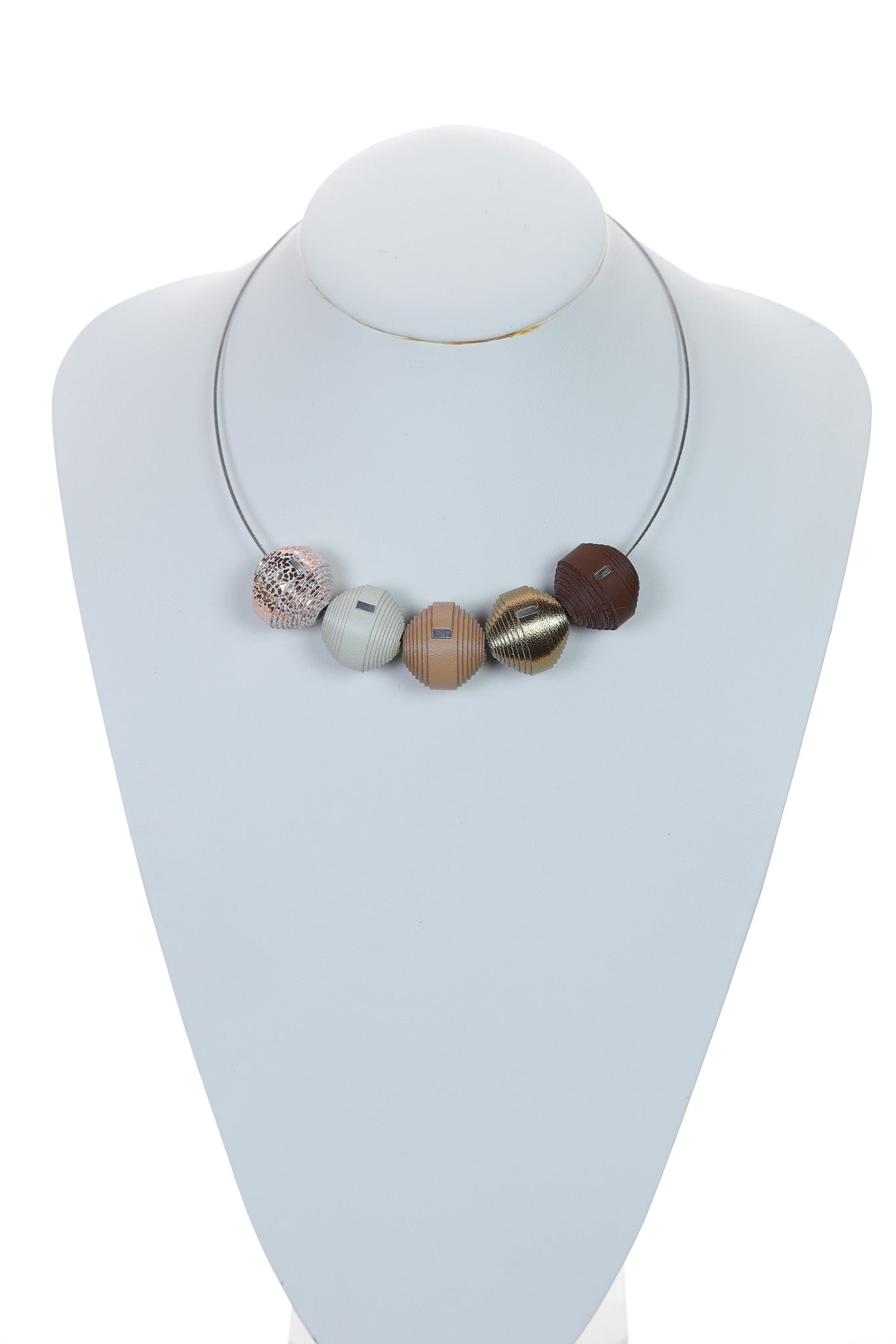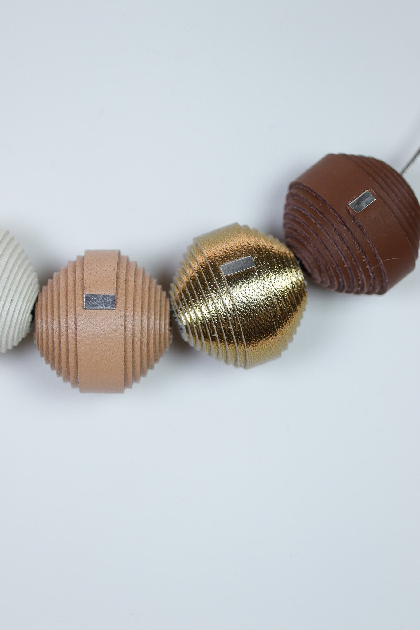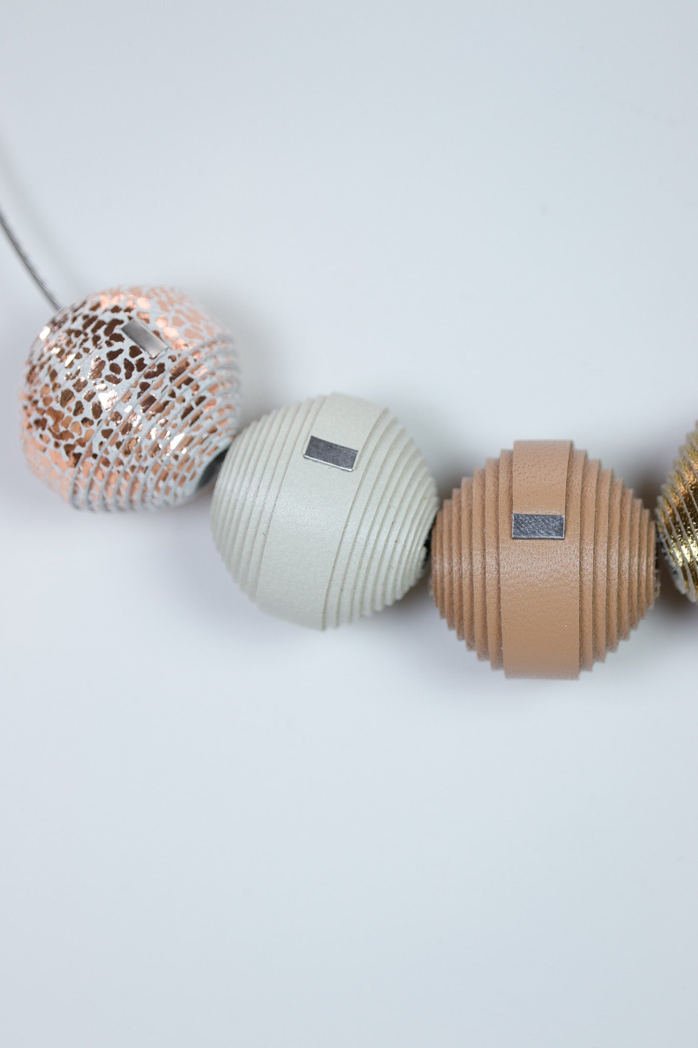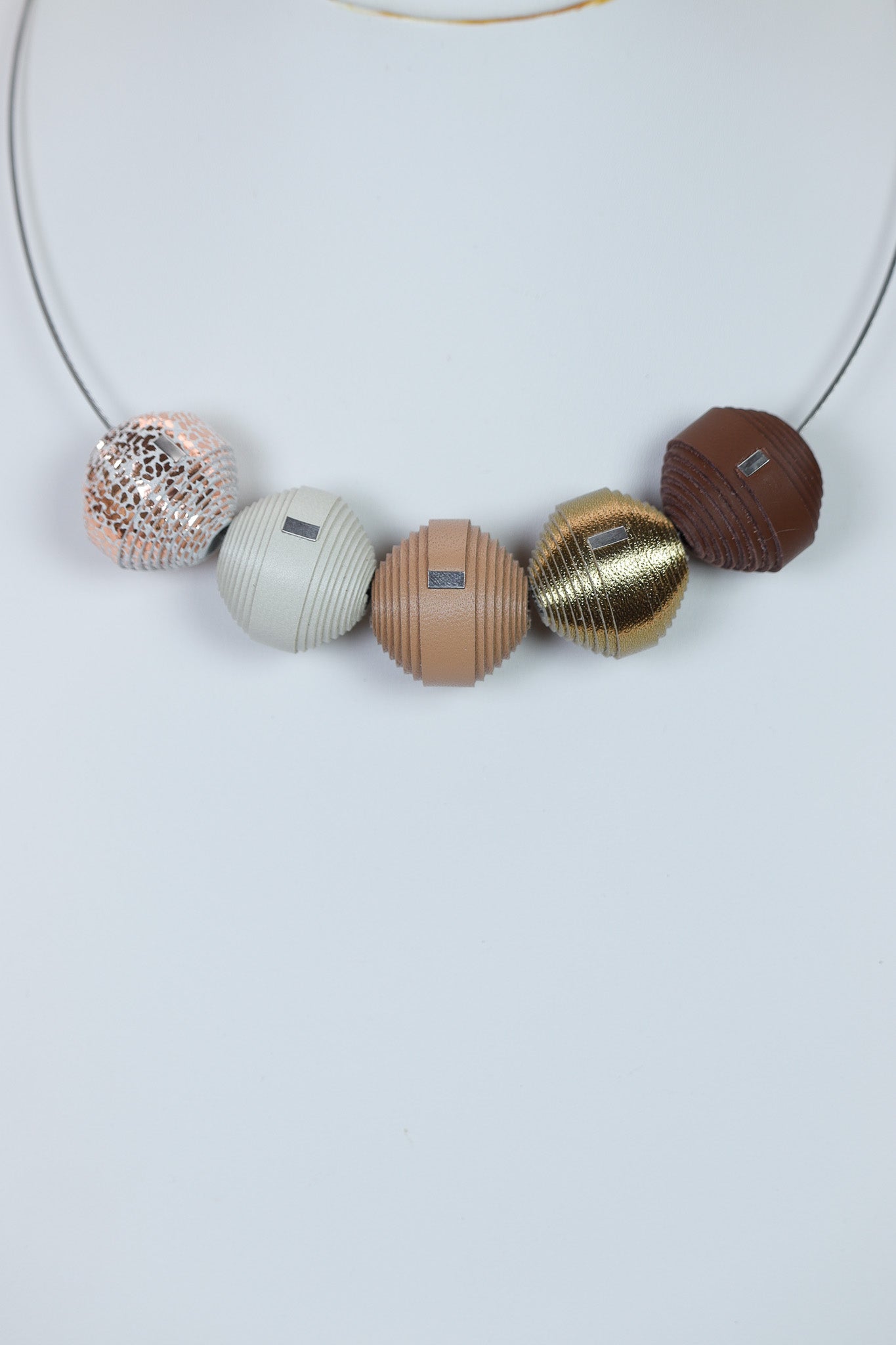 Cu un design neconvențional, acest colier este piesa centrală a oricărei ținute, ideală pentru a te simți încrezătoare și stilată în sezonul de toamnă. Realizat din piele naturală italiană, colierul combină cu succes elemente sferice cu texturi și nuanțe unice, de la bej, crem și maro la auriu și roz-cupru. Fiecare element, rulat cu atenție, adaugă o notă de originalitate și unicitate. Datorită formei sale, colierul se așează perfect la baza gâtului, scoțând în evidență silueta și adăugând o notă de rafinament. Este o bijuterie versatilă, perfectă pentru a completa un outfit de zi cu zi sau pentru a-ți pune în valoare o ținută de seară.