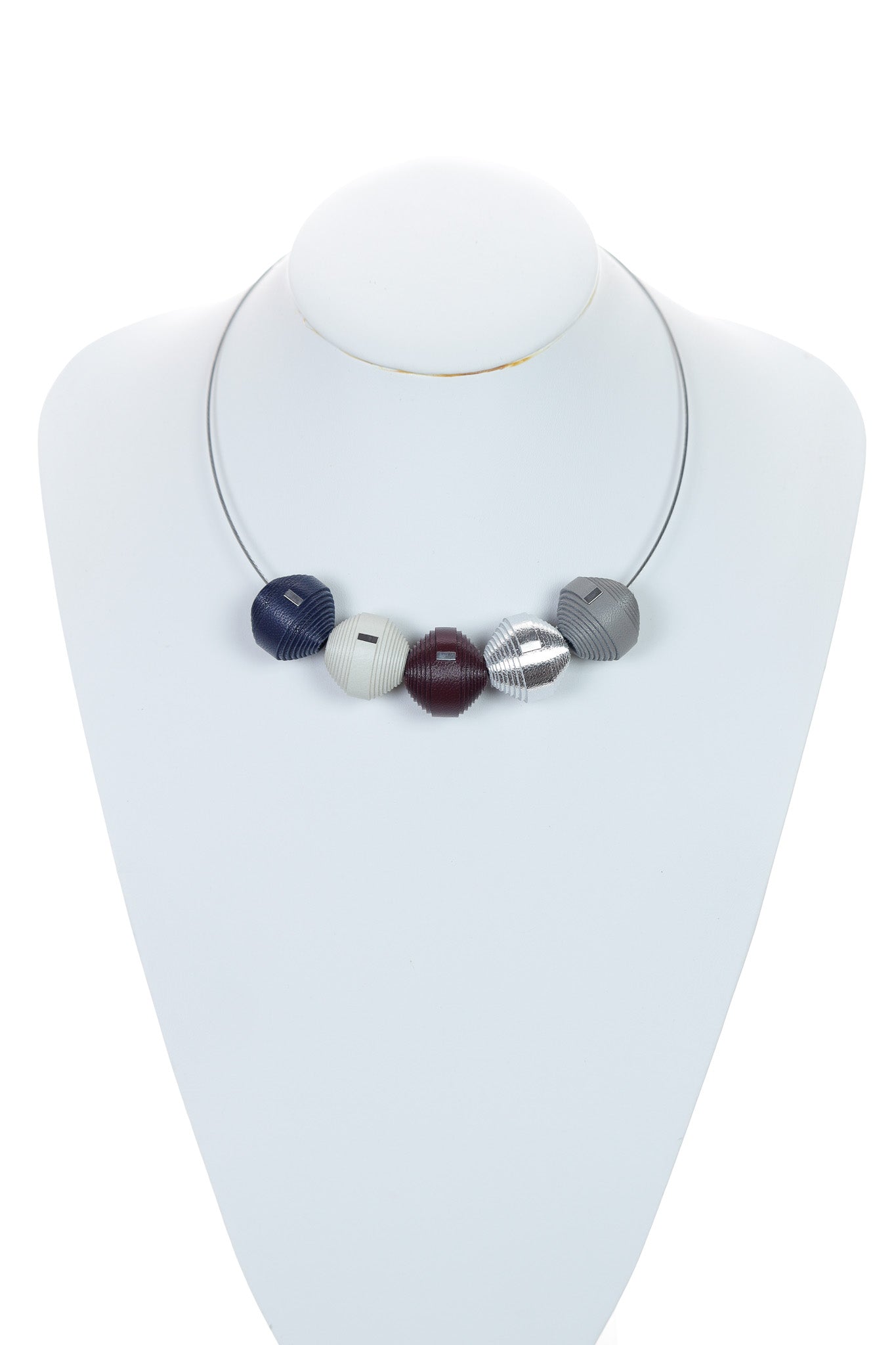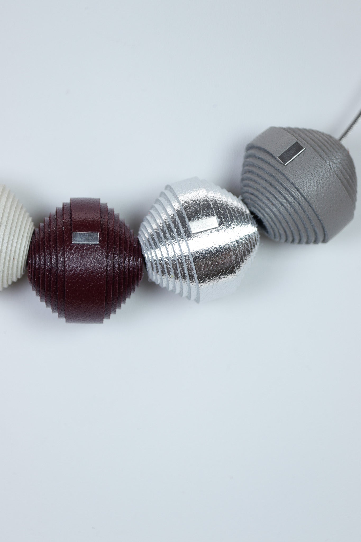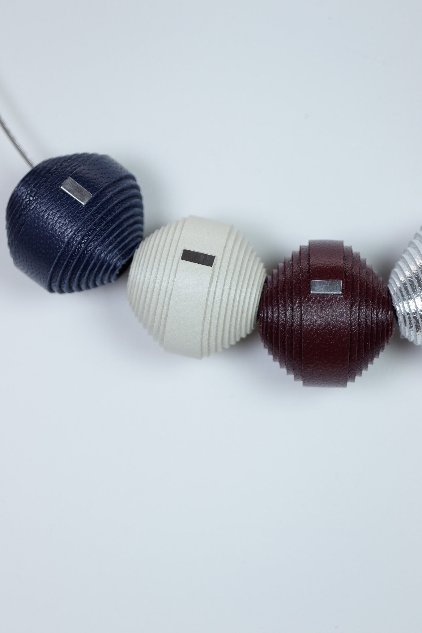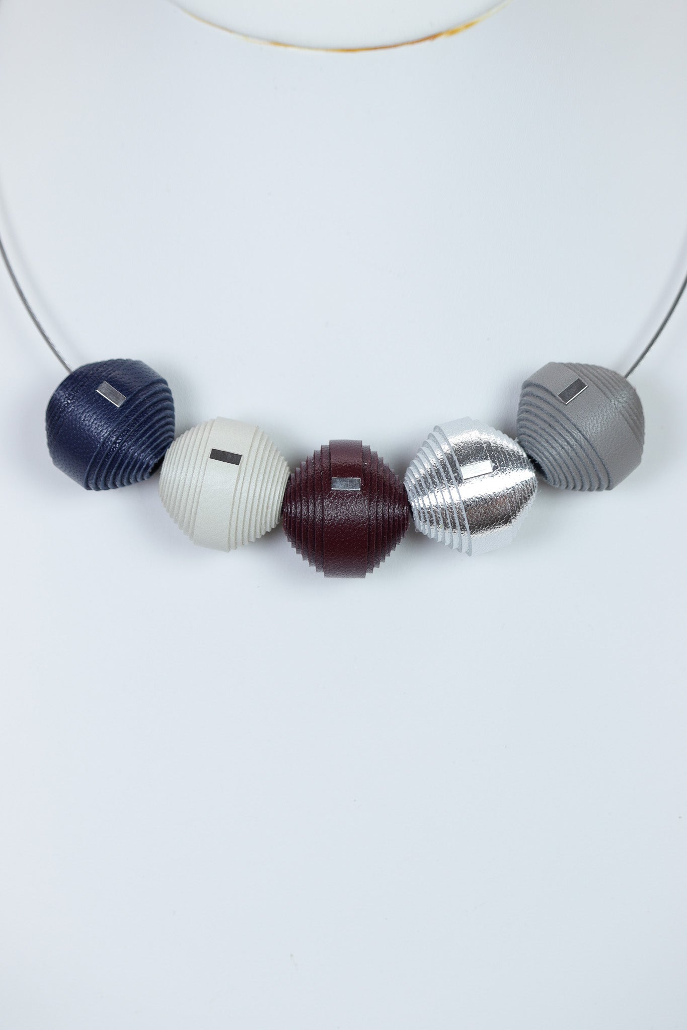 Cu un design neconvențional, acest colier este piesa centrală a oricărei ținute, ideală pentru a te simți încrezătoare și stilată. Realizat din piele naturală italiană, colierul combină cu succes elemente sferice cu texturi și nuanțe unice, de la bleumarin intens și bordeaux profund, la crem, gri și argintiu metalic. Fiecare element, rulat cu atenție, adaugă o notă de originalitate și unicitate. Datorită bazei din sârmă siliconată cu închidere de tip filet, colierul se așează perfect la baza gâtului, scoțând în evidență silueta și adăugând o notă de rafinament. Este o bijuterie versatilă, perfectă pentru a completa un outfit de zi cu zi sau pentru a-ți pune în valoare o ținută de seară.