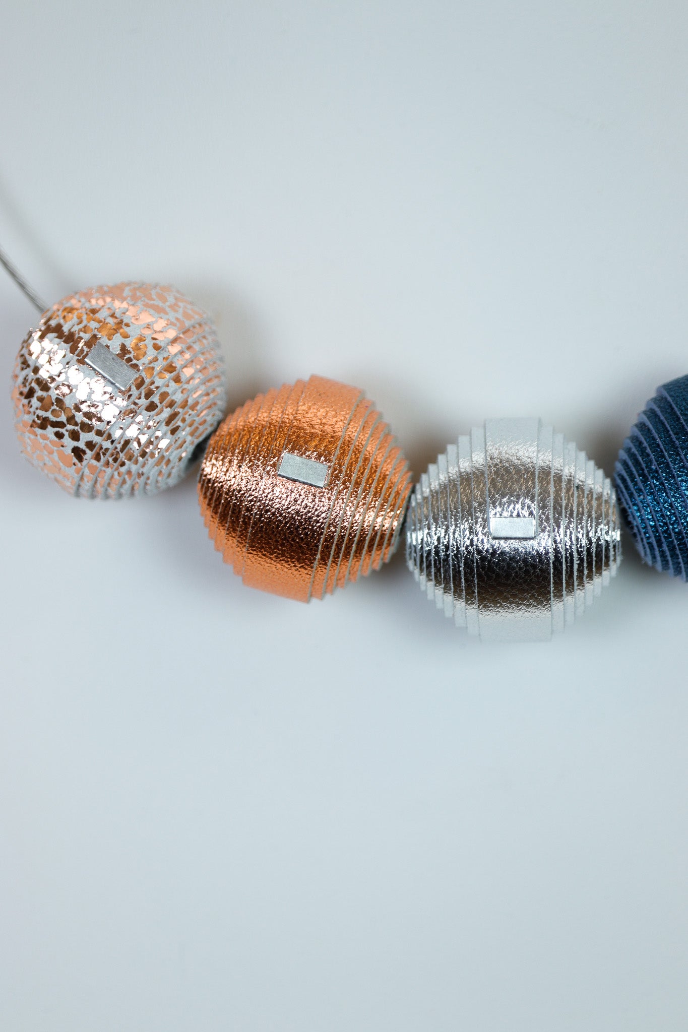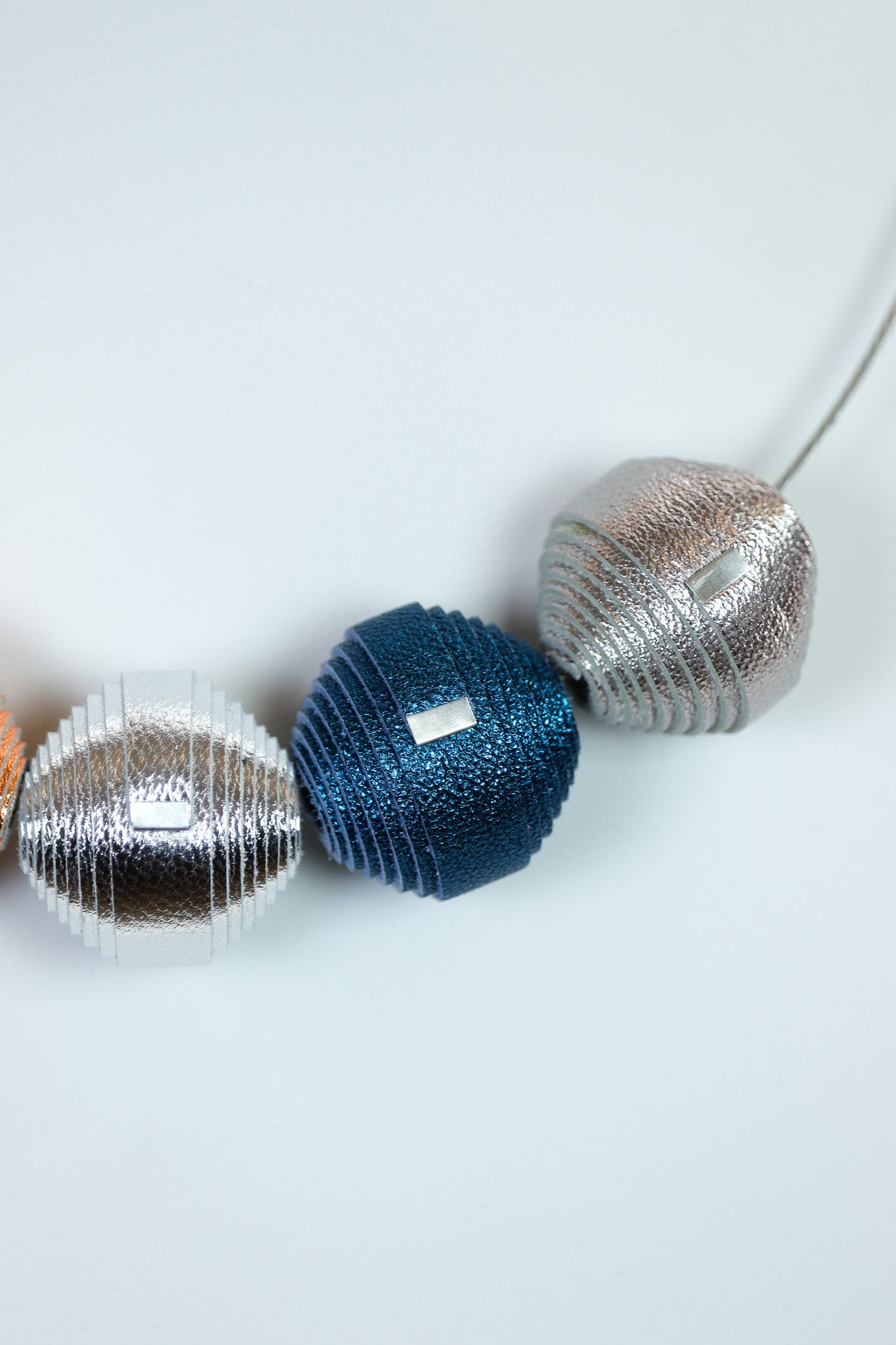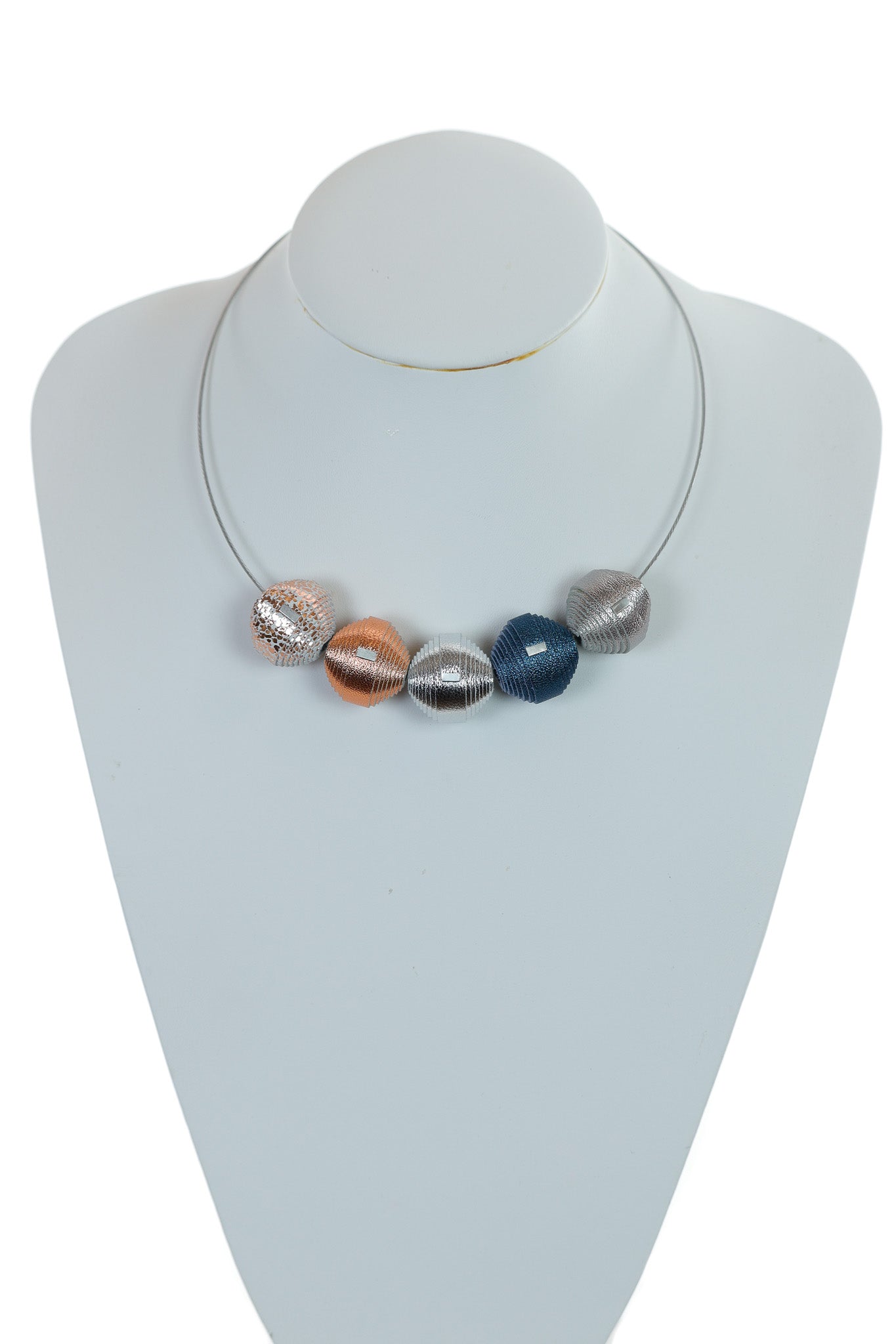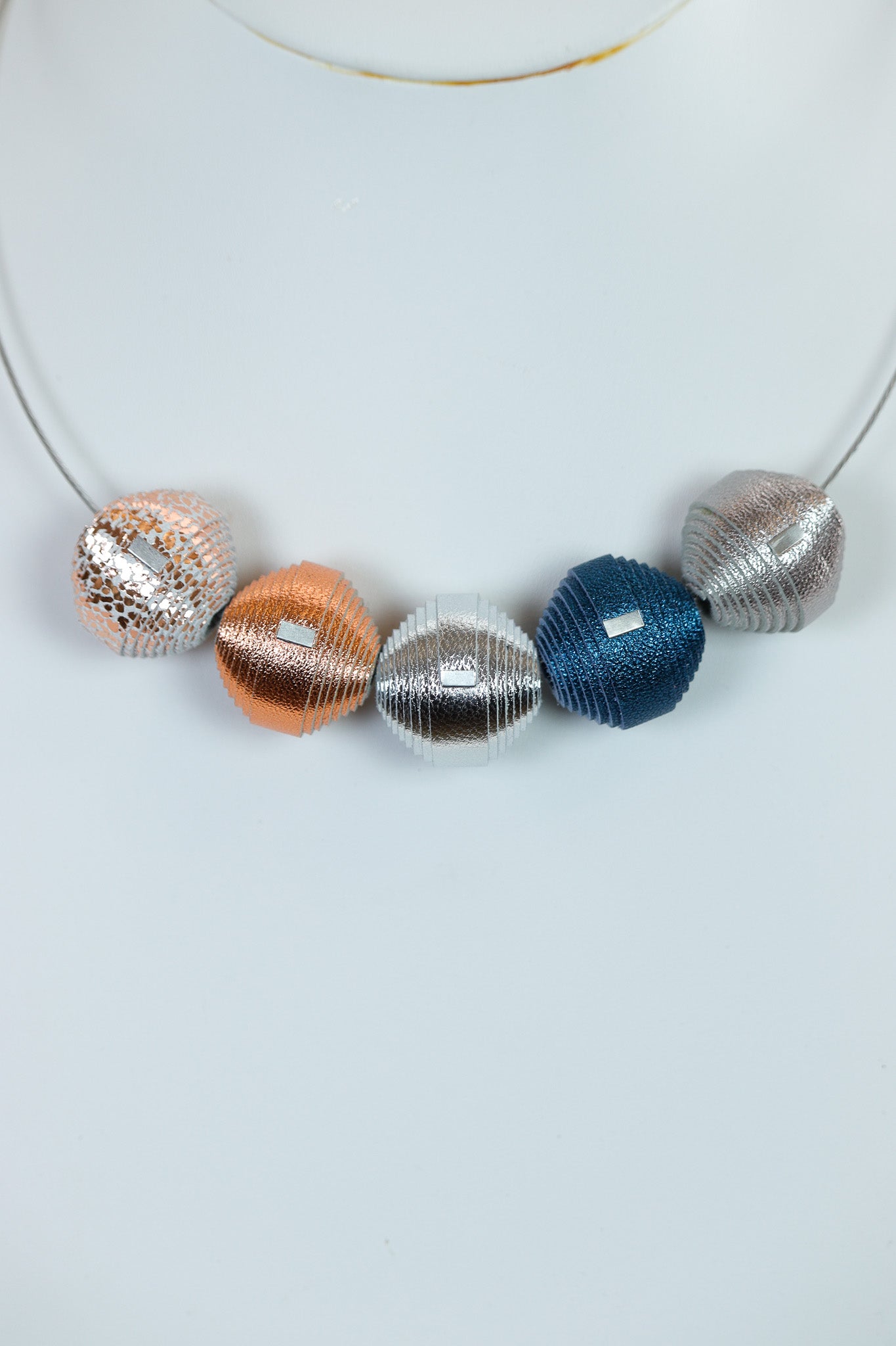 Acest colier este statement datorită texturilor sale! Bilele din piele naturală nu sunt doar colorate, ci au și finisaje diferite: unele lucesc ca un metal topit, altele sunt mate și profunde. Combinarea nuanțelor de Cupru și Argintiu cu Bleumarinul intens creează un efect vizual wow.