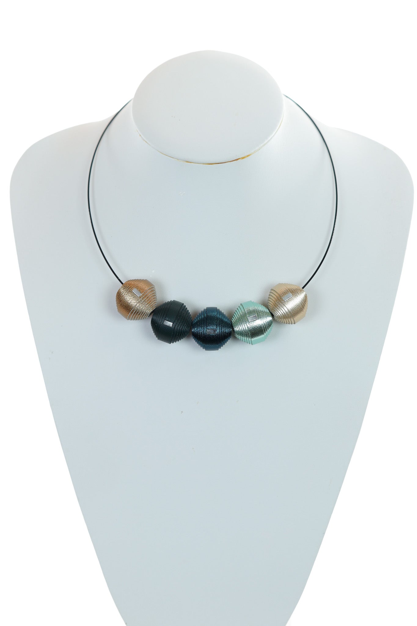 Vrei un look super balanced și statement? Acest colier e piesa de bază care-ți aduce un touch de eleganță ultra-modernă! Bilele din piele combină tonuri de bronz cald cu albastrul gheții.