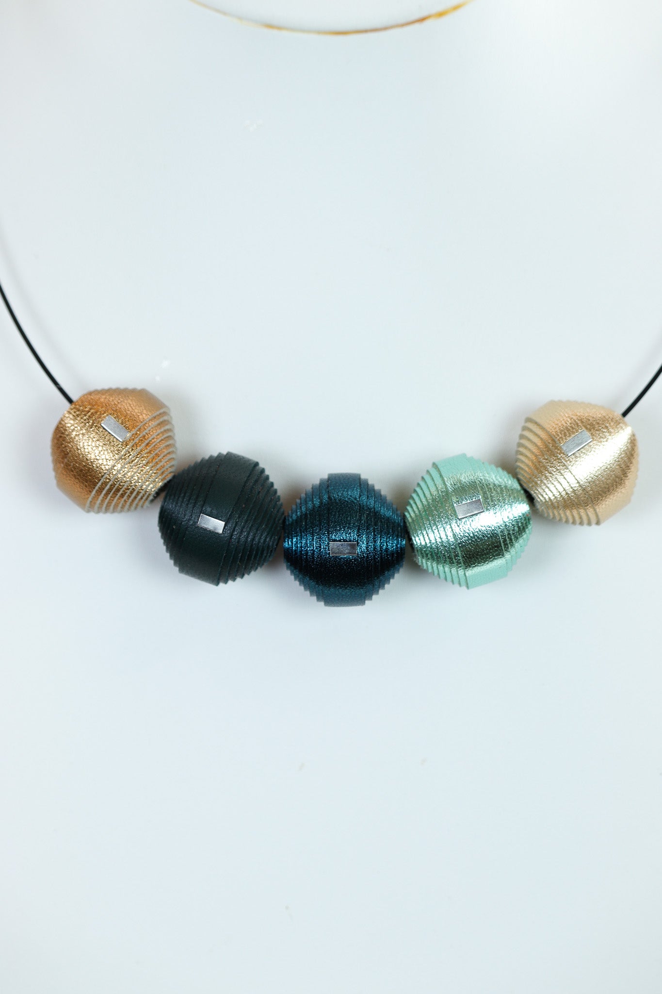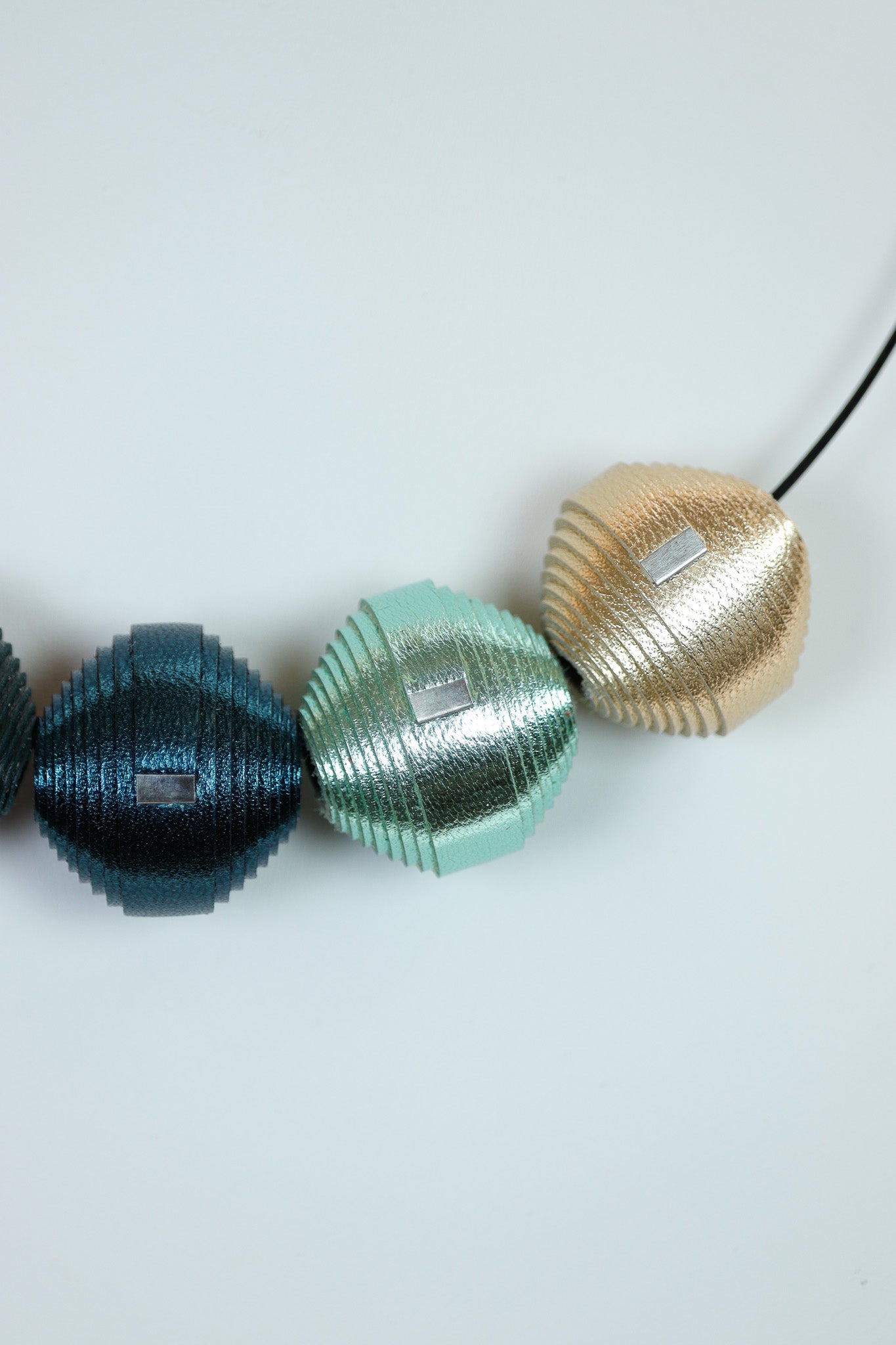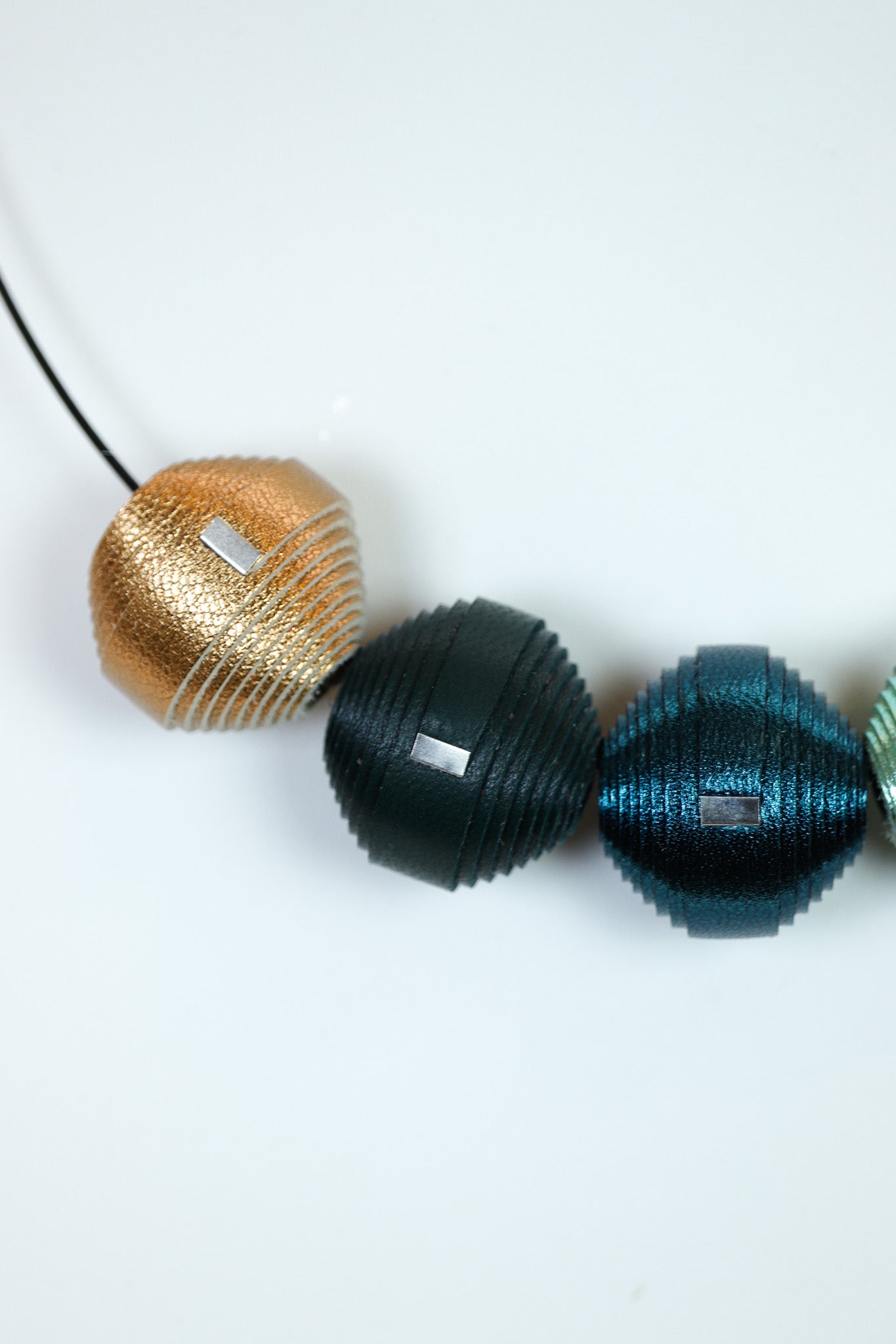 Acest colier este statement datorită jocului de lumini și culori. Bilele din piele naturală folosesc nuanțe care se completează perfect: Tonurile de Bronz și Cupru sunt calde și luxoase, în timp ce Albastrul Gheață și Negrul Profund adaugă un vibe rece și urban. Contrastul dintre finisajul metalic și cel mat/texturat adaugă multă profunzime și stil.